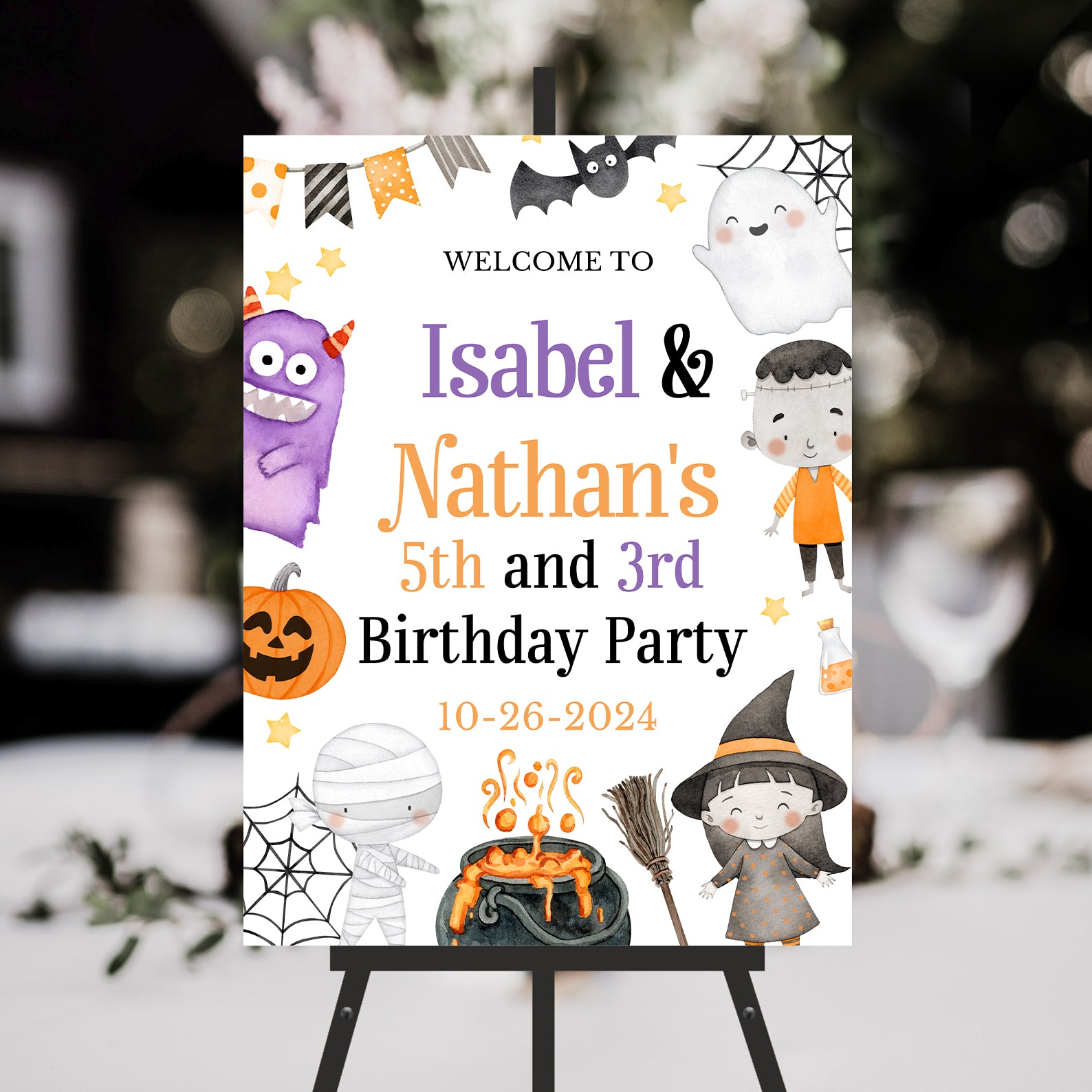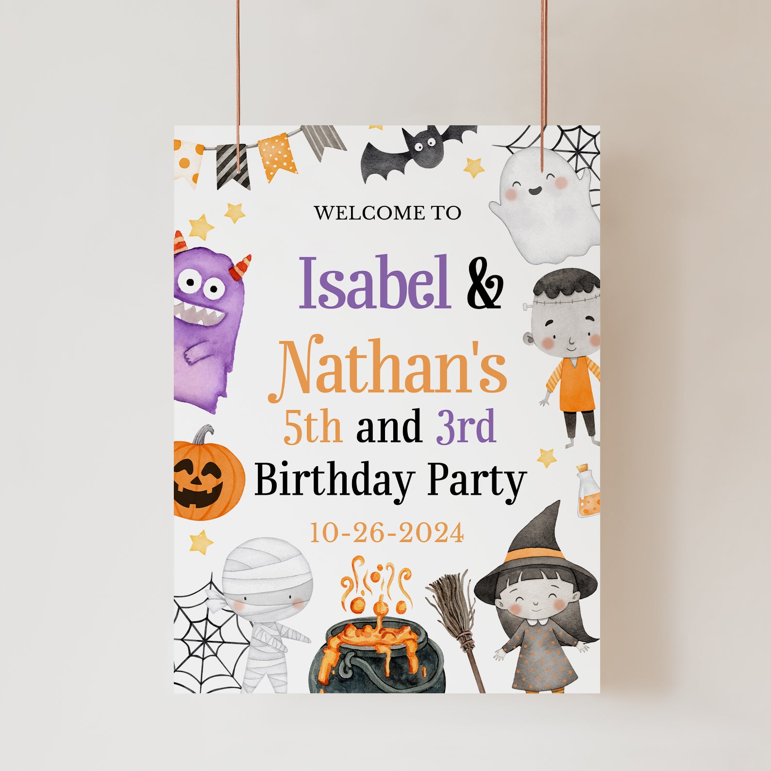 Kick off your little ghouls’ birthday bash with our spooktacular Halloween welcome sign perfect for celebrating a joint 5th and 3rd Boo-thday! This festive design features a bold black and orange banner at the top, complete with playful bats, friendly ghosts, and cobwebs. Along the sides, a cheerful purple monster, classic Frankenstein, and smiling pumpkin greet your guests with Halloween cheer. At the bottom, a fun scene unfolds with a spiderweb, mummy, bubbling cauldron, witch's broom, and a whimsical witch brewing up birthday magic. A fun and frightfully charming way to set the tone for a Halloween party your guests won’t forget!