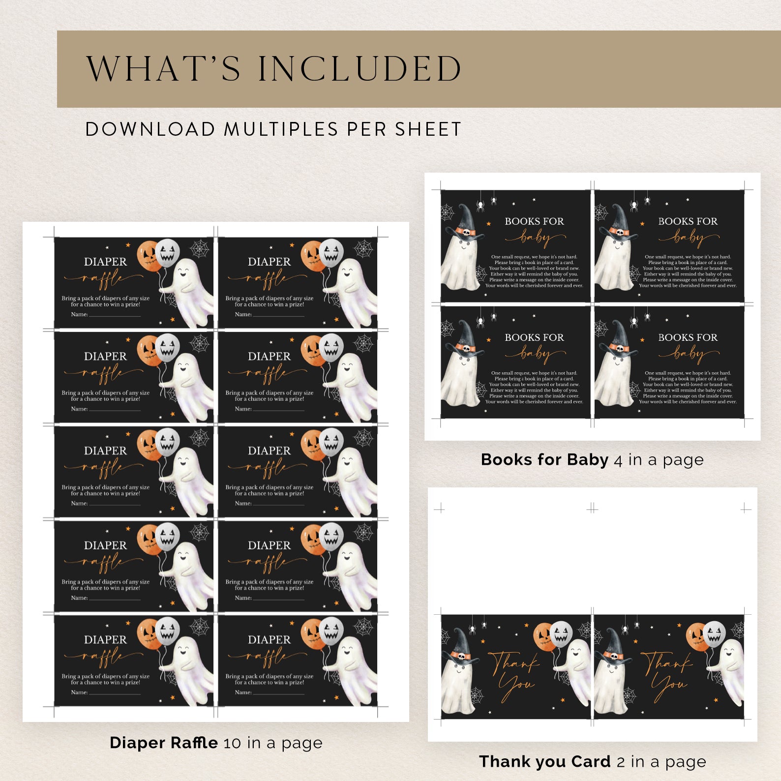Celebrate your little boo with this charming Halloween baby shower bundle available in both black and white versions! Featuring a ghost on a witch hat and another holding a festive balloon, each piece is accented with playful spider webs, falling spiders, and twinkling stars. This editable set includes a main invite, mobile version, diaper raffle, books for baby, and thank you card. Perfect for a sweet and spooky celebration that’s easy to personalize and share.
