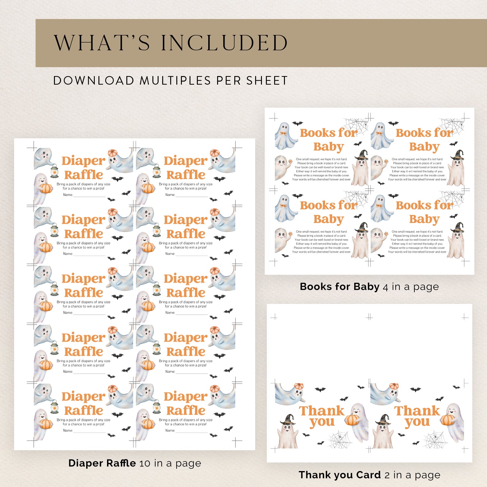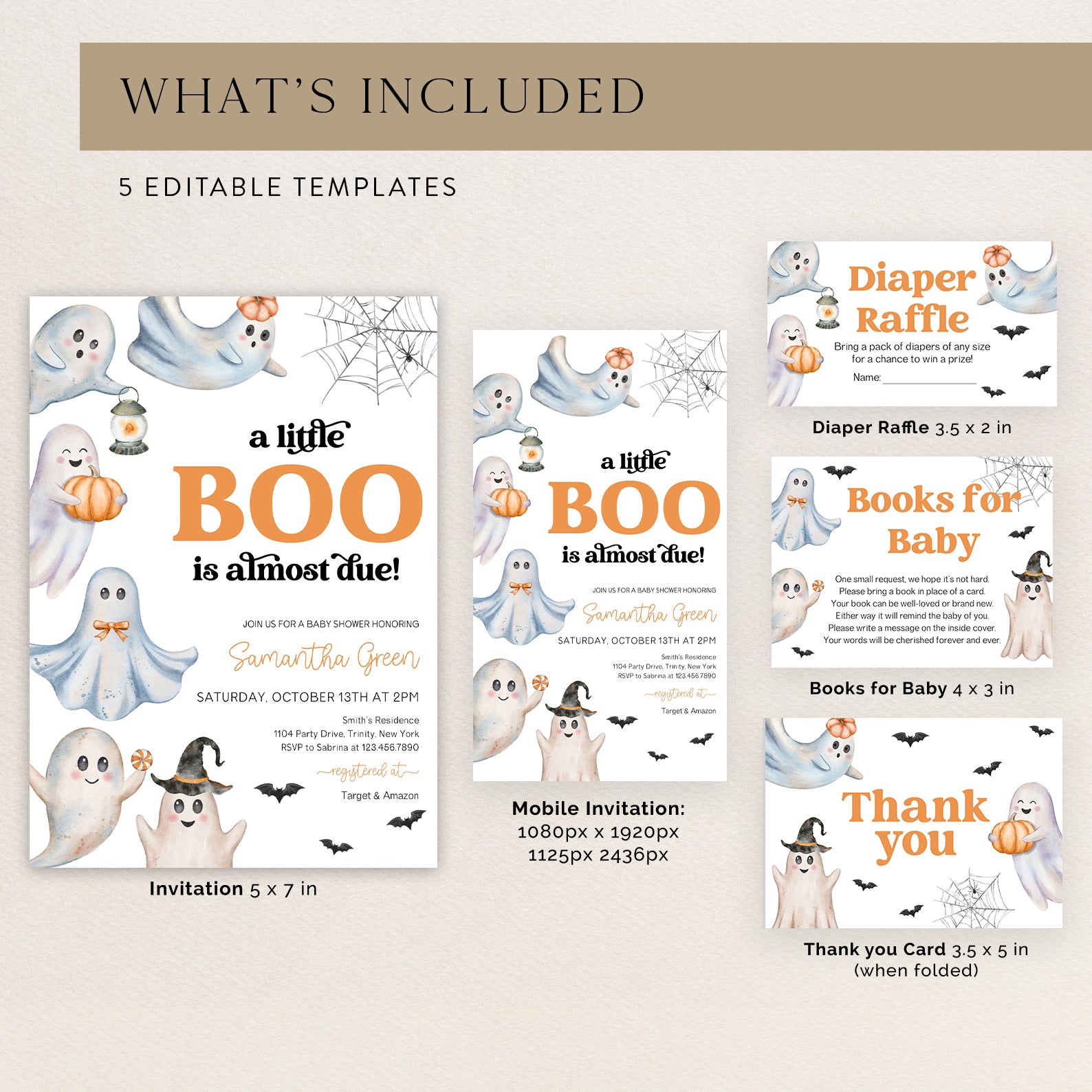 Celebrate your little boo with this charming Halloween-themed baby shower bundle! Featuring a digital invitation, mobile invite, diaper raffle, books for baby card, and thank you card all adorned with adorable ghosts, bats, spider webs, and sweet fall touches. This playful and spooky set is easy to edit and perfect for adding festive flair to your celebration!