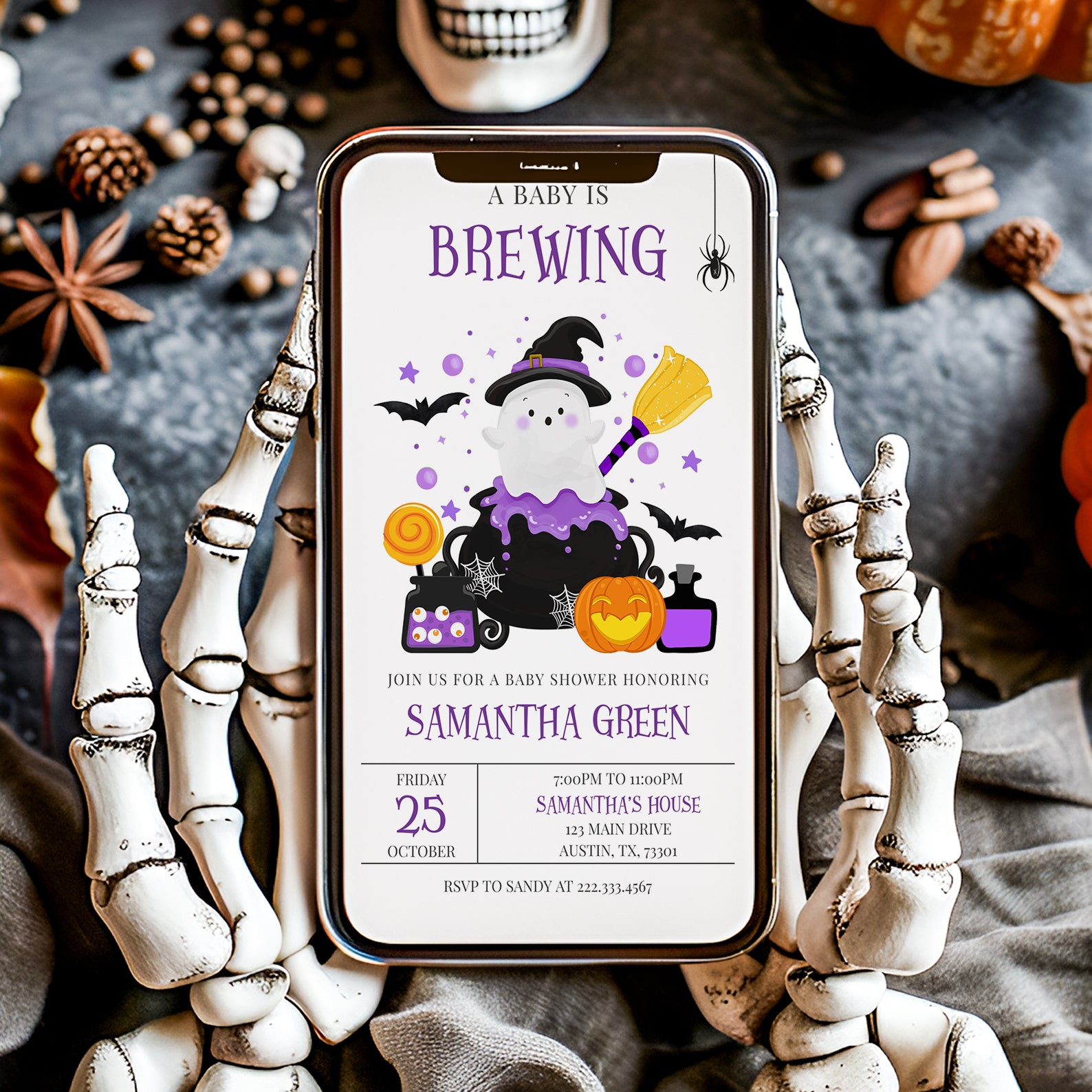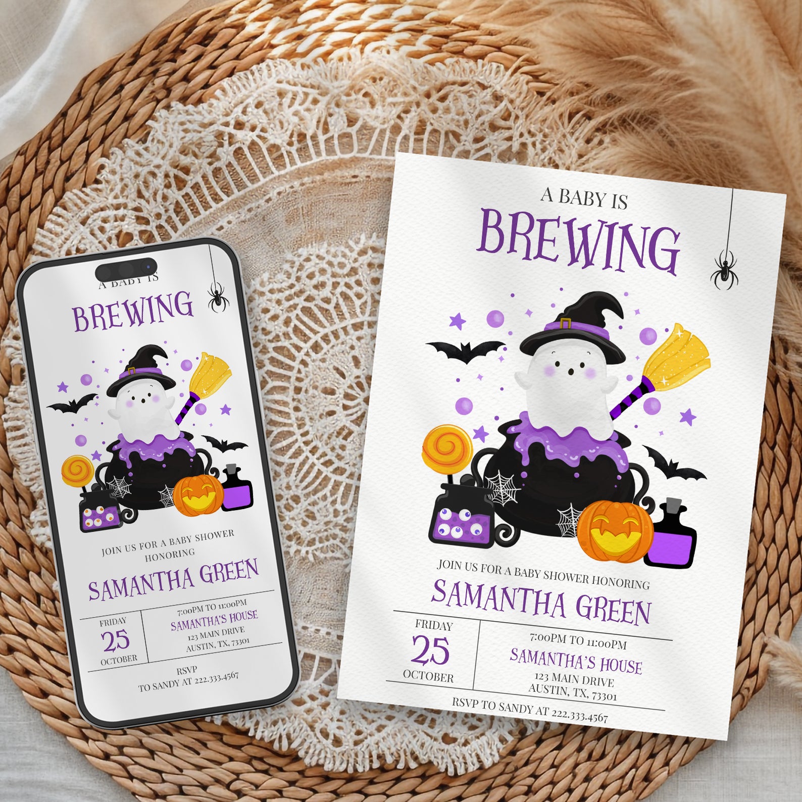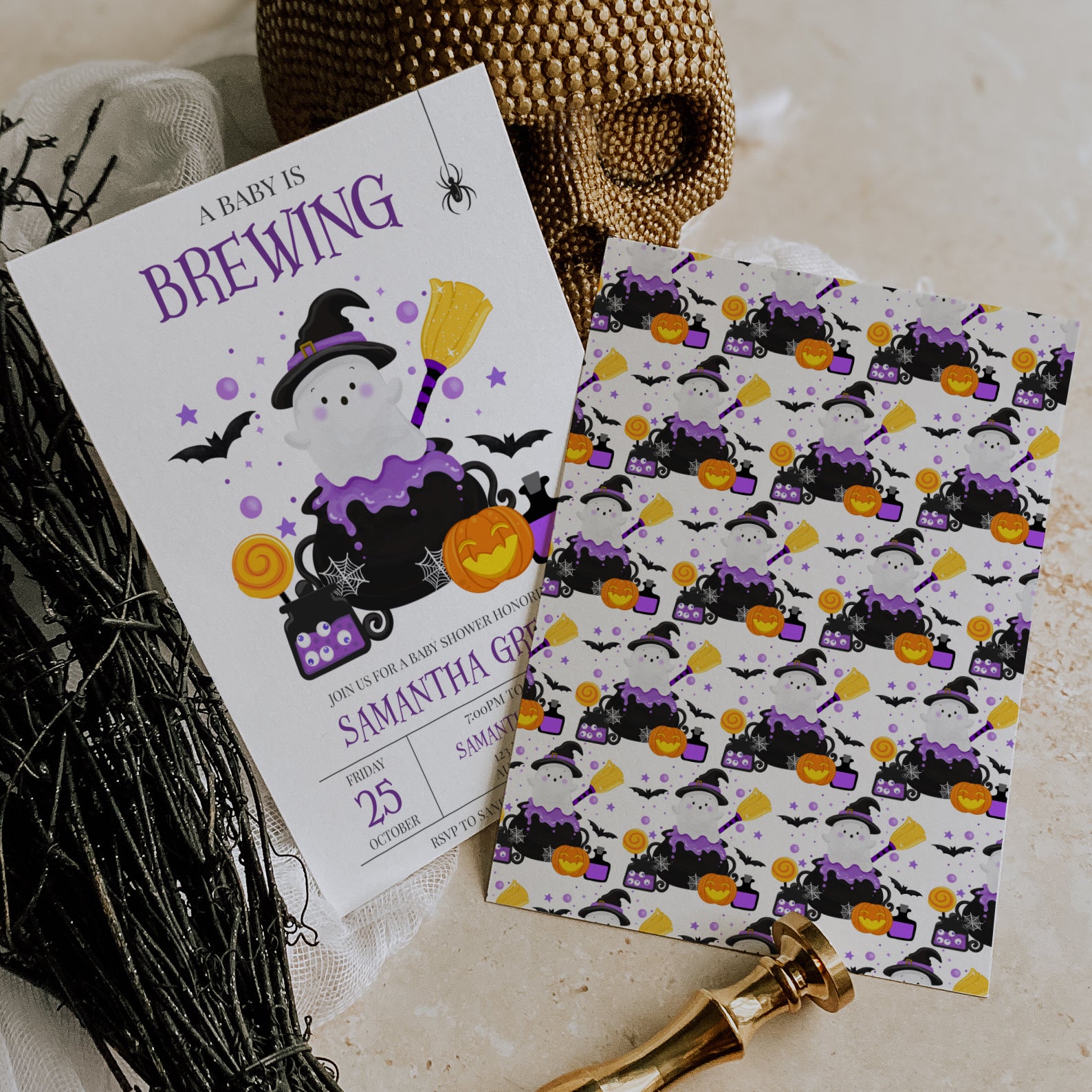 If the mom-to-be loves a touch of Halloween magic, our "Baby is Brewing" invitation bundle is perfect! Available in colors like blue, purple, pink, green, and orange, this set features a playful cauldron with a little boo brewing inside. Complete with potions, pumpkins, Halloween treats, and a witch’s broom, this theme is ideal for a fun and festive Halloween baby shower.