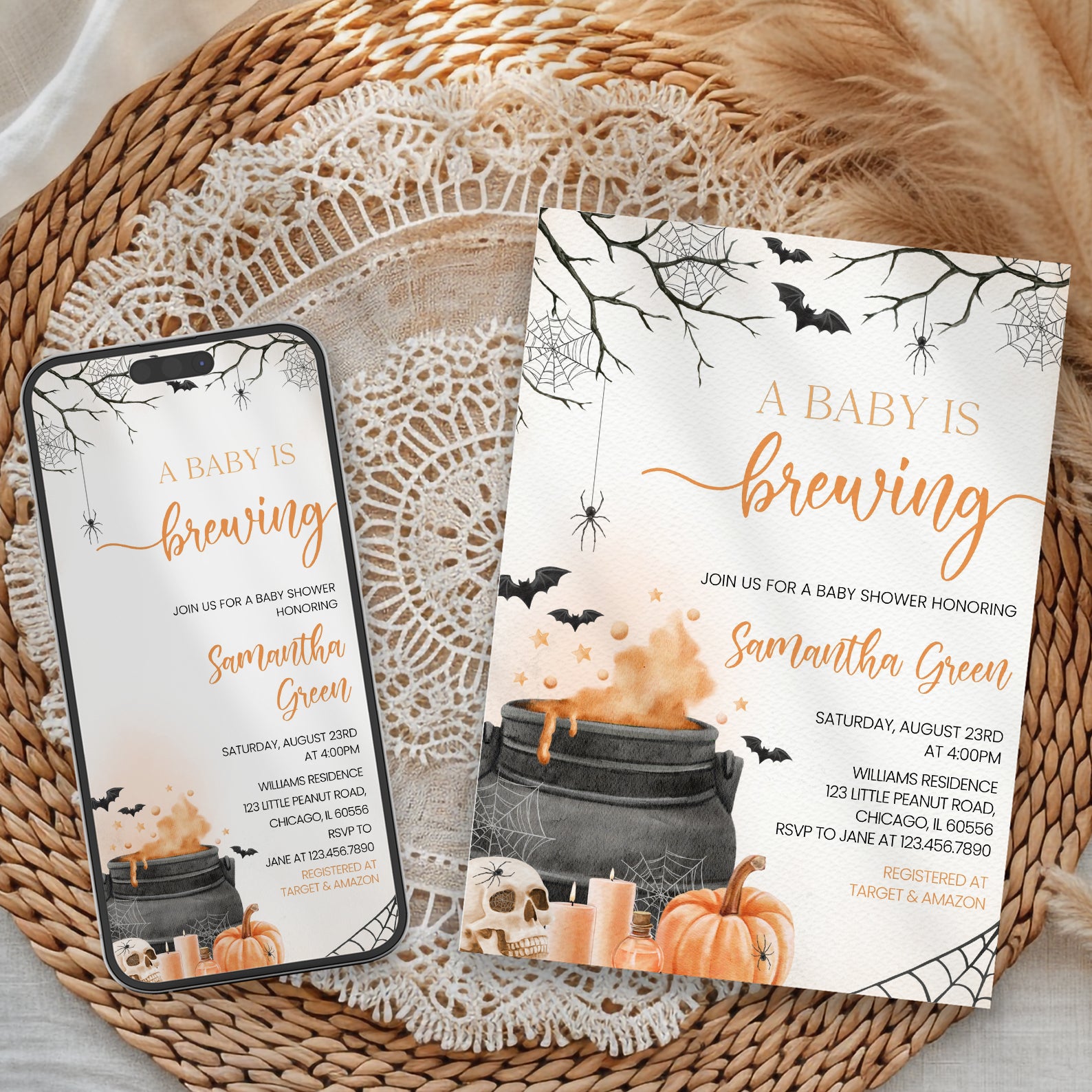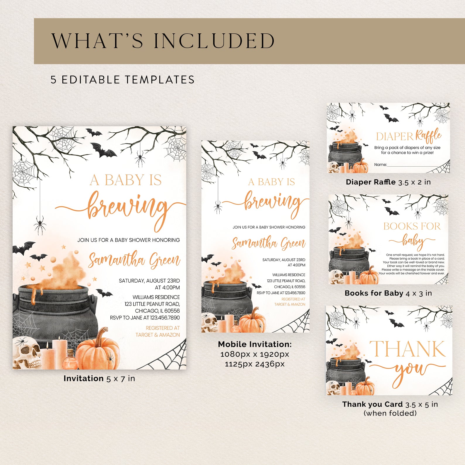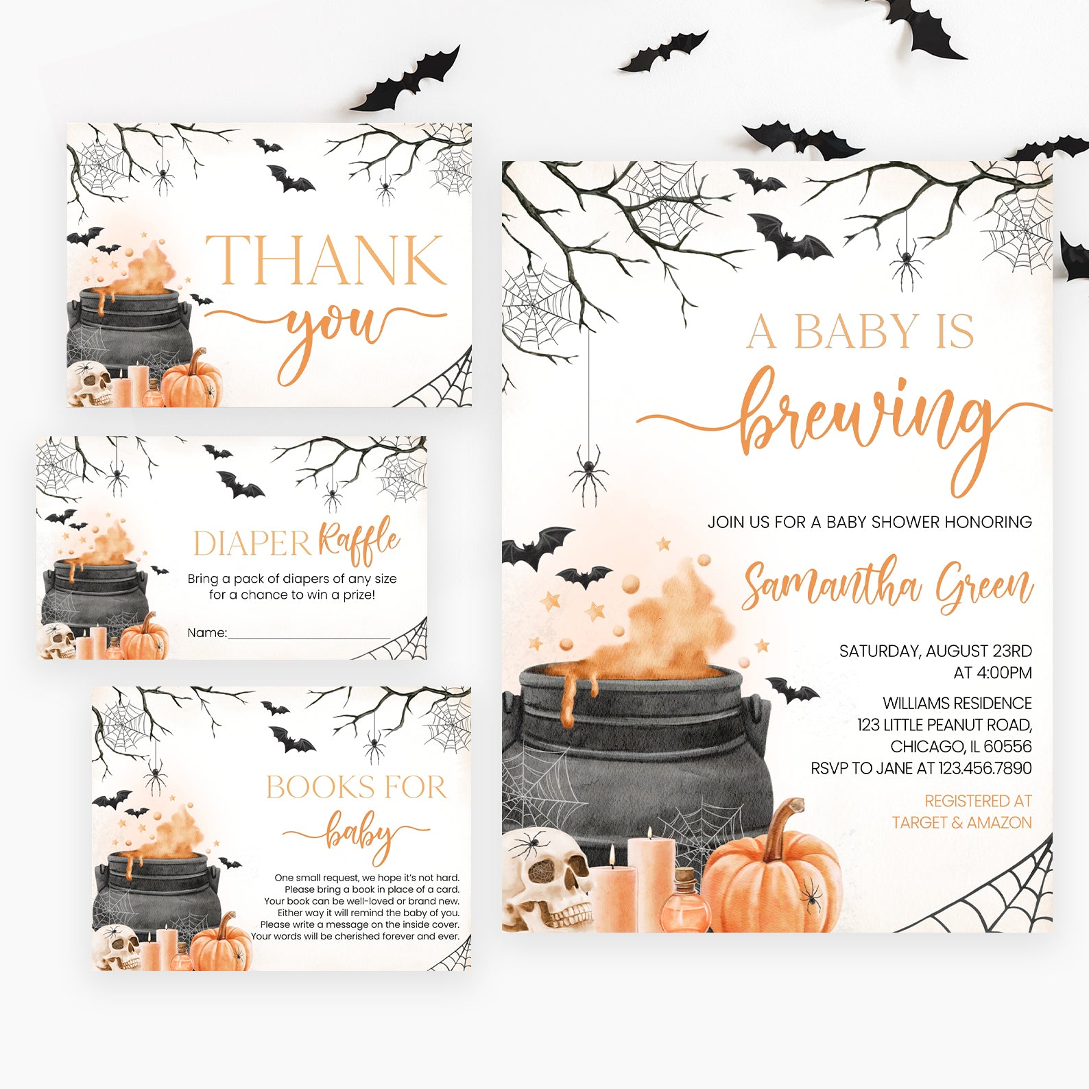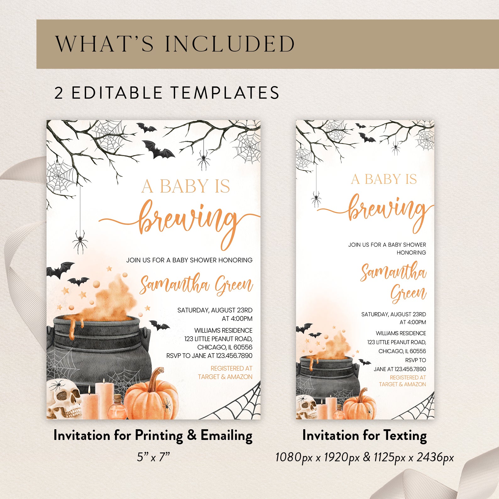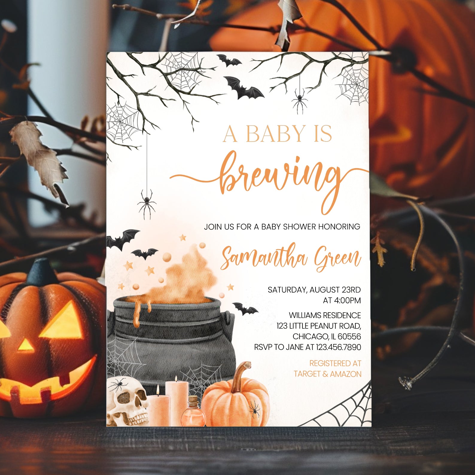 - Purchase this Orange Baby Potion Brewing Invite Bundle: Spooky Bats, Webs, & Pumpkins template