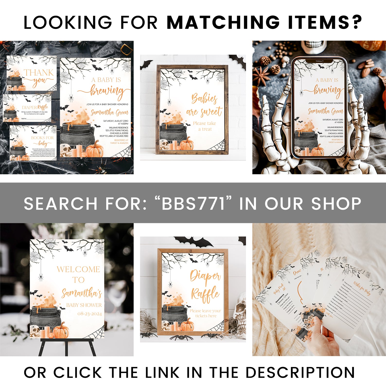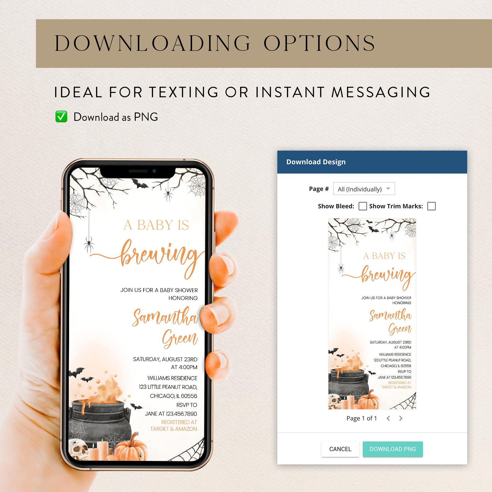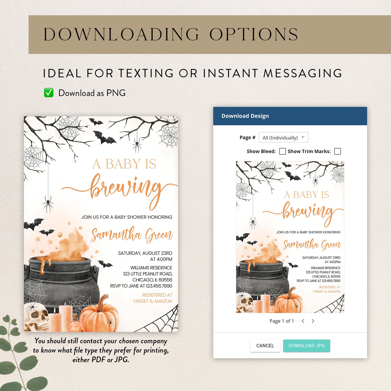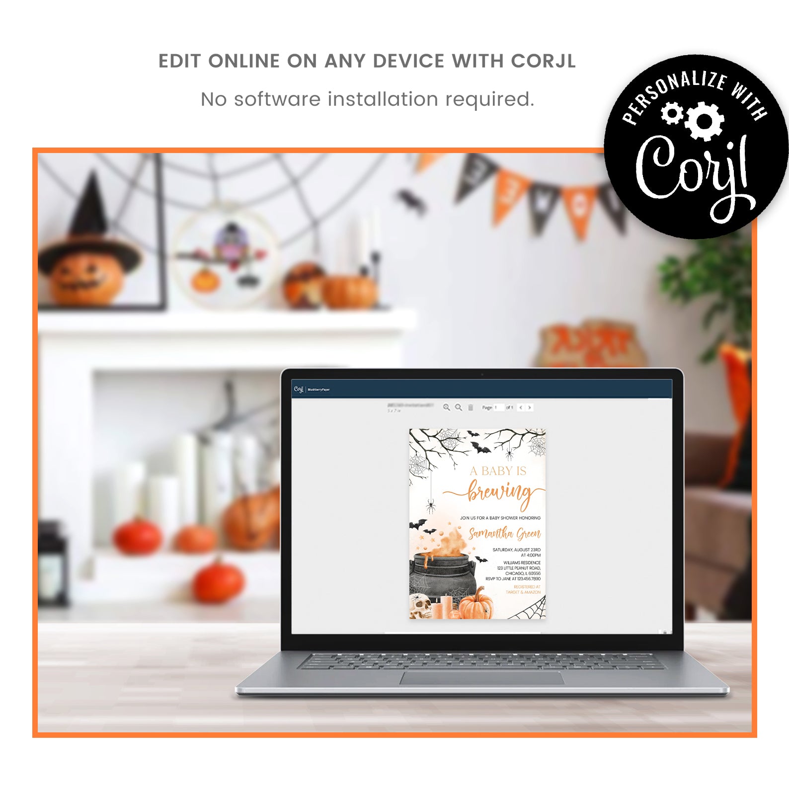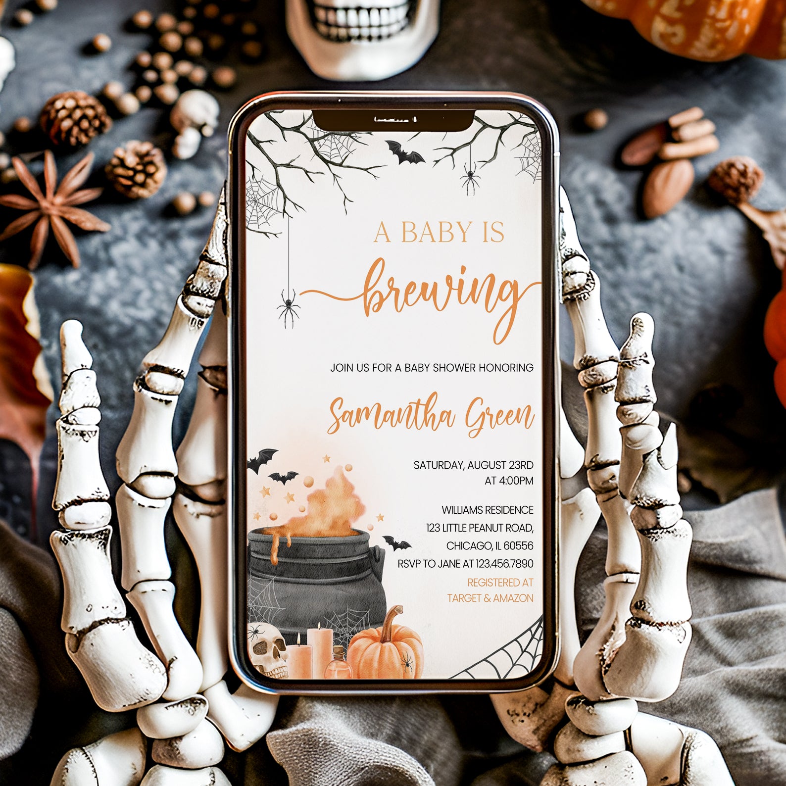 - Purchase this Orange Baby Potion Brewing Invite Bundle: Spooky Bats, Webs, & Pumpkins template