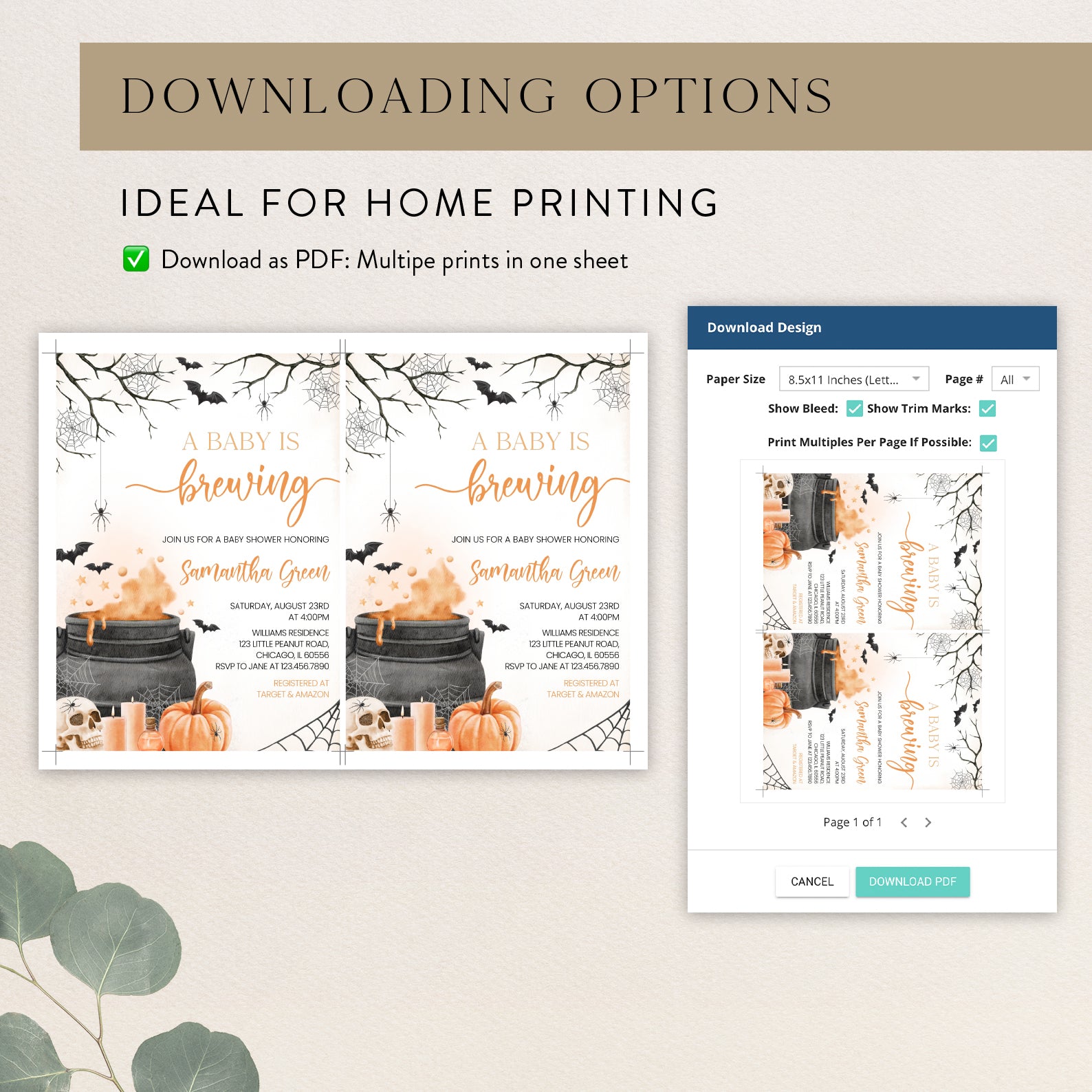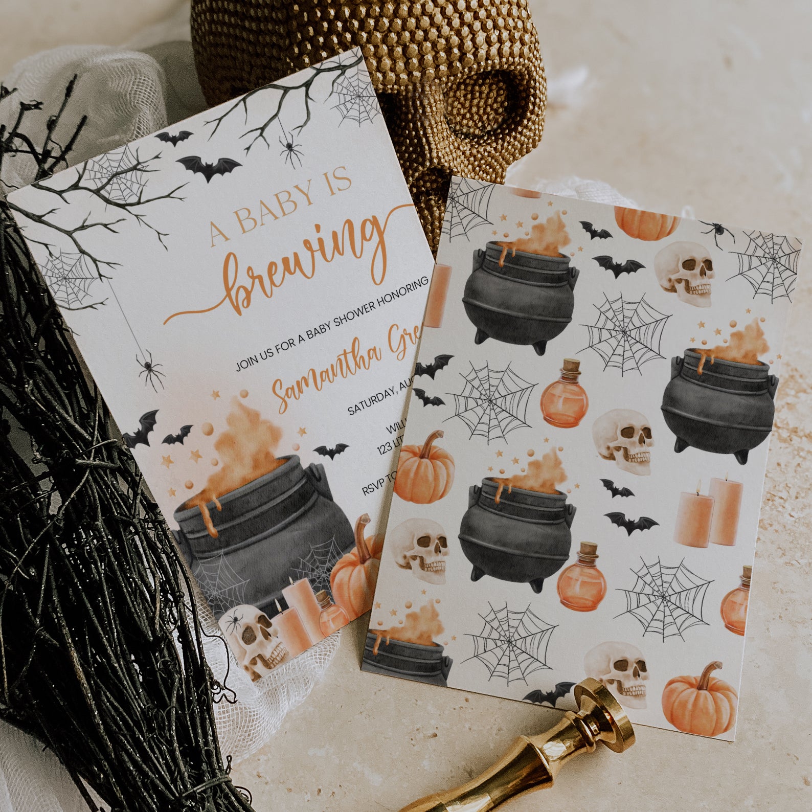 Invitation: Featuring a baby brewing in a cauldron with gender-neutral colors or shades of pink, blue, purple, or orange. Surrounded by whimsical bats, pumpkins, candles, spiders, and spider webs, this design sets a perfect Halloween mood.