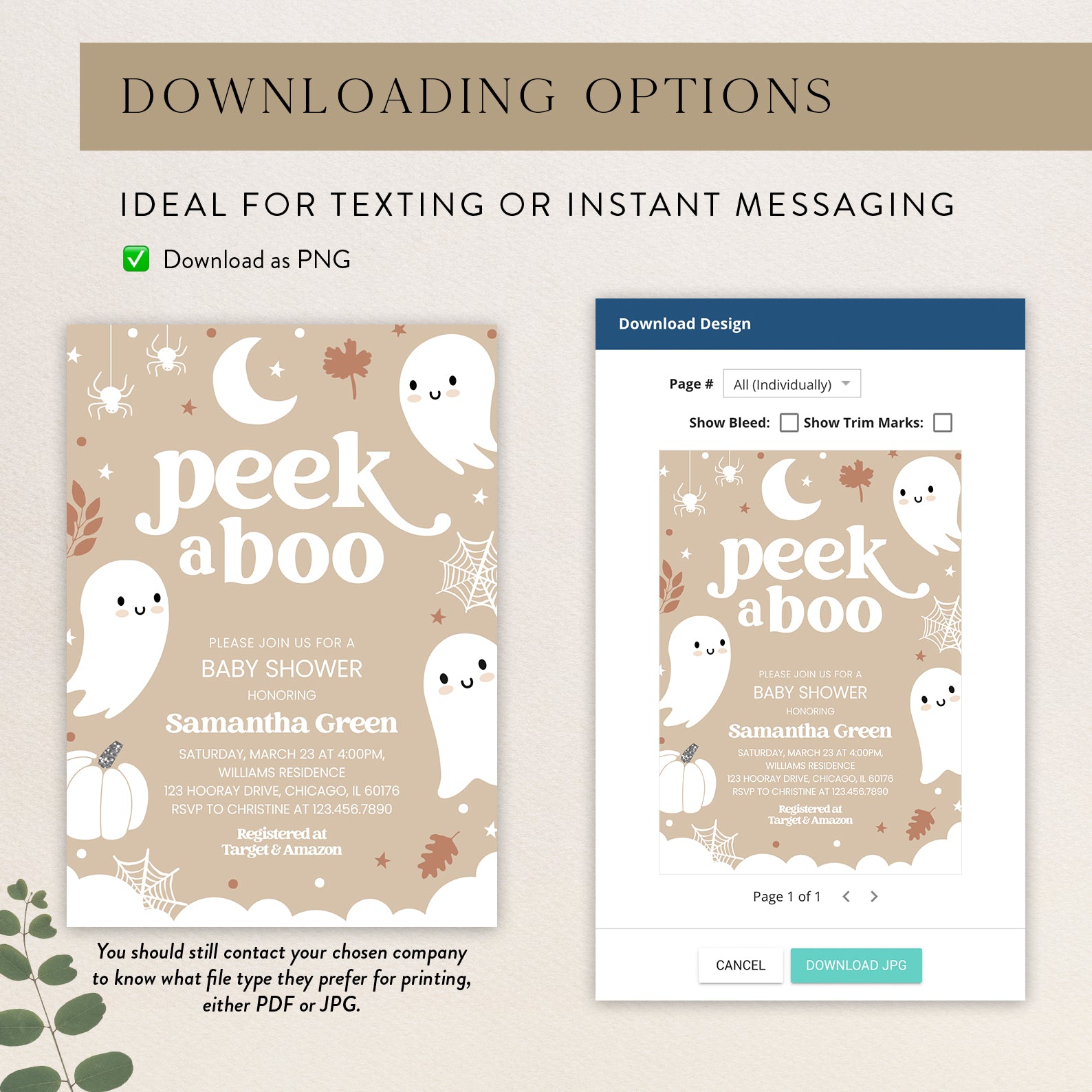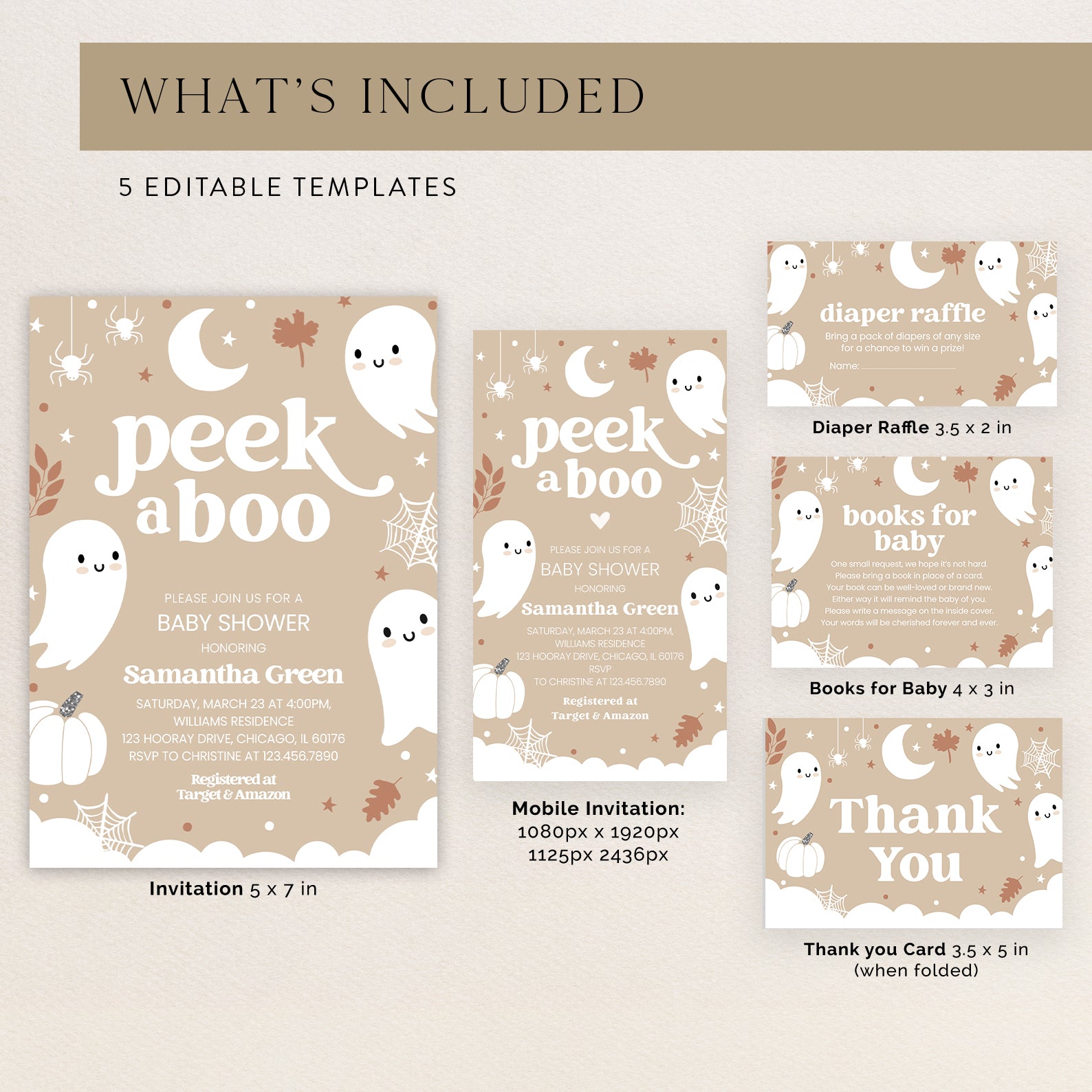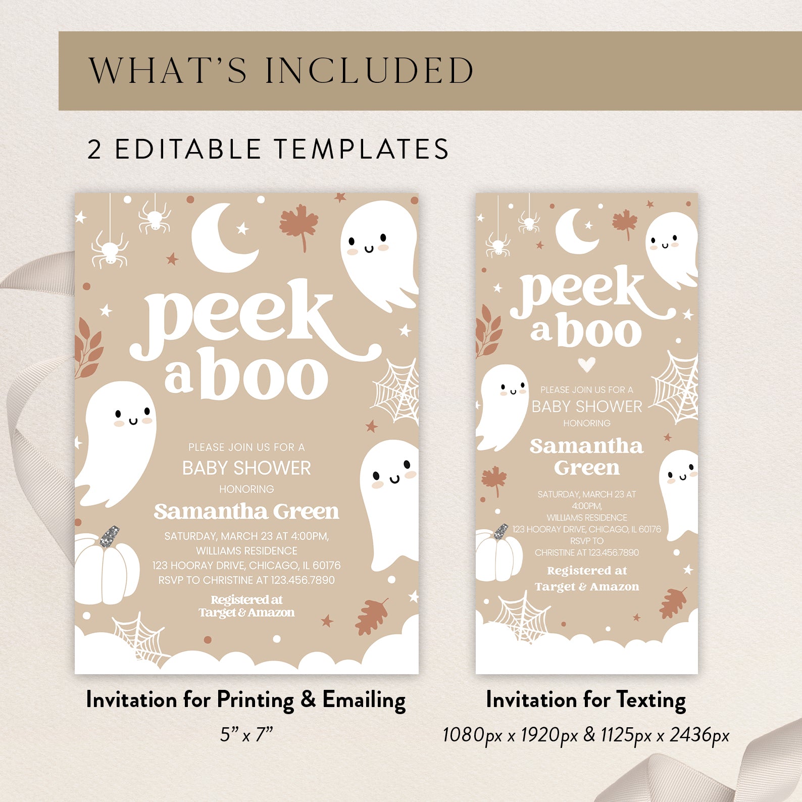 - Purchase this Peek-A-Boo Baby Shower Invite Bundle: Friendly Ghosts & Halloween Fun! template