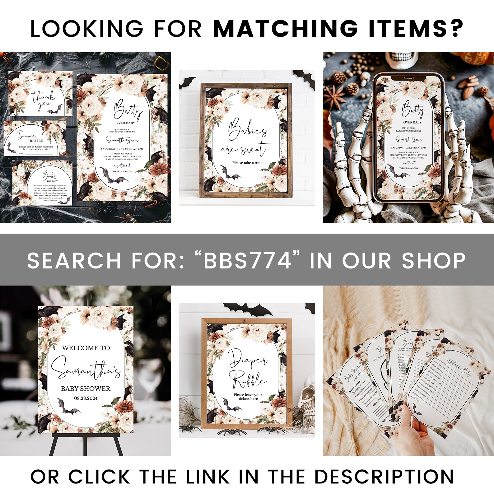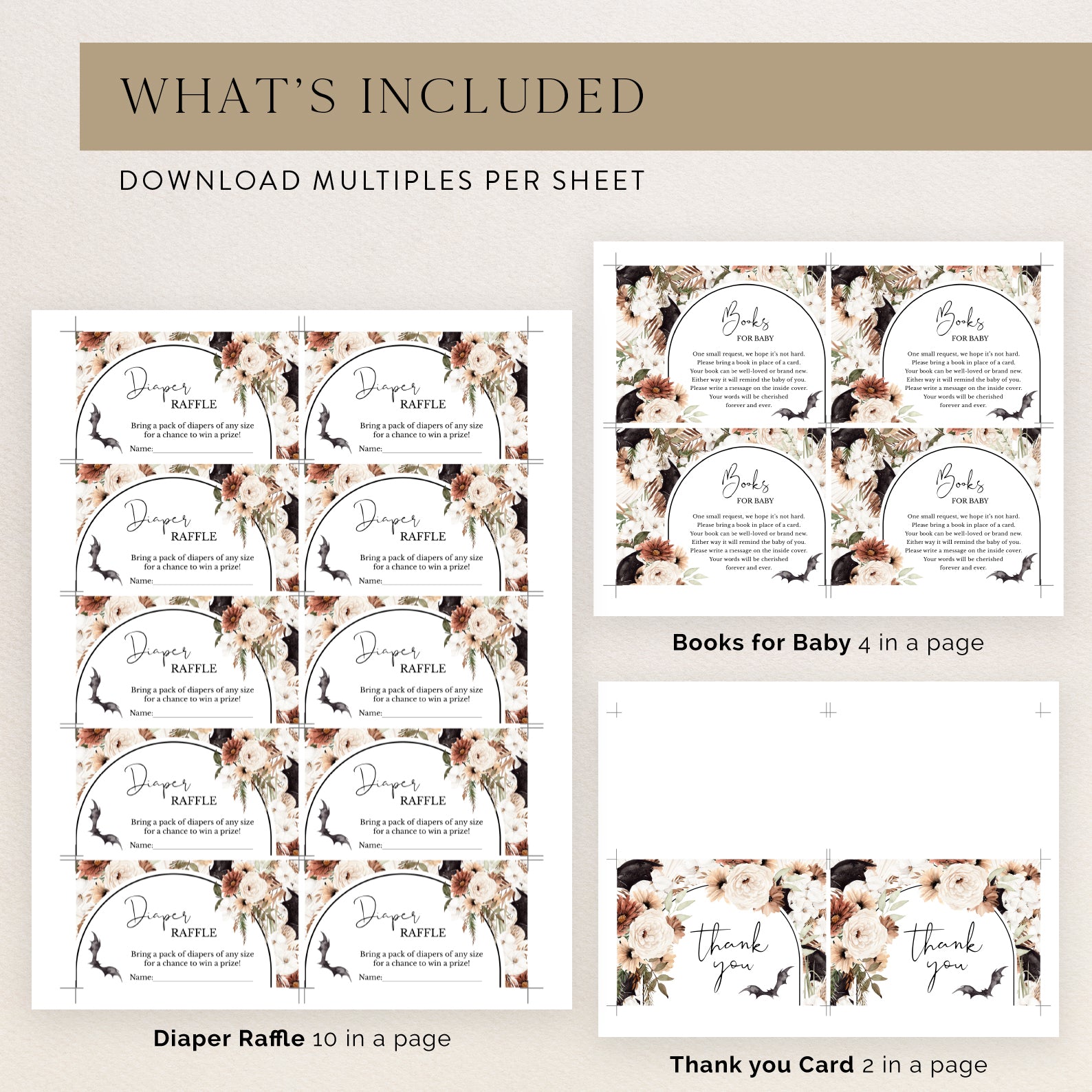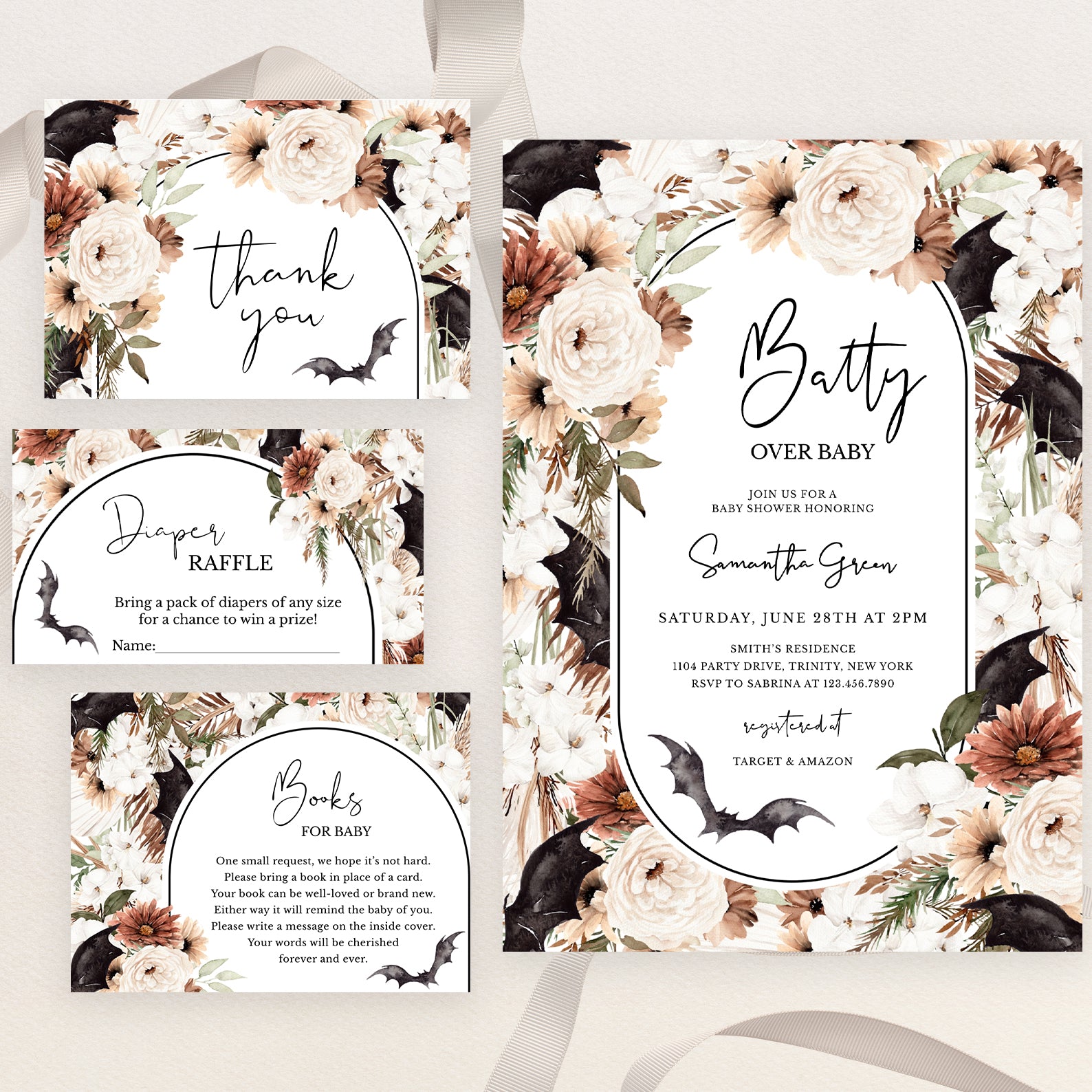 Featuring a playful combination of bats and watercolor flowers, each piece in this bundle is designed to bring a touch of Halloween magic to your event. The invitation, mobile invite, diaper raffle, books for baby card, and thank you card all share this charming theme, ensuring a cohesive and festive experience for your guests.