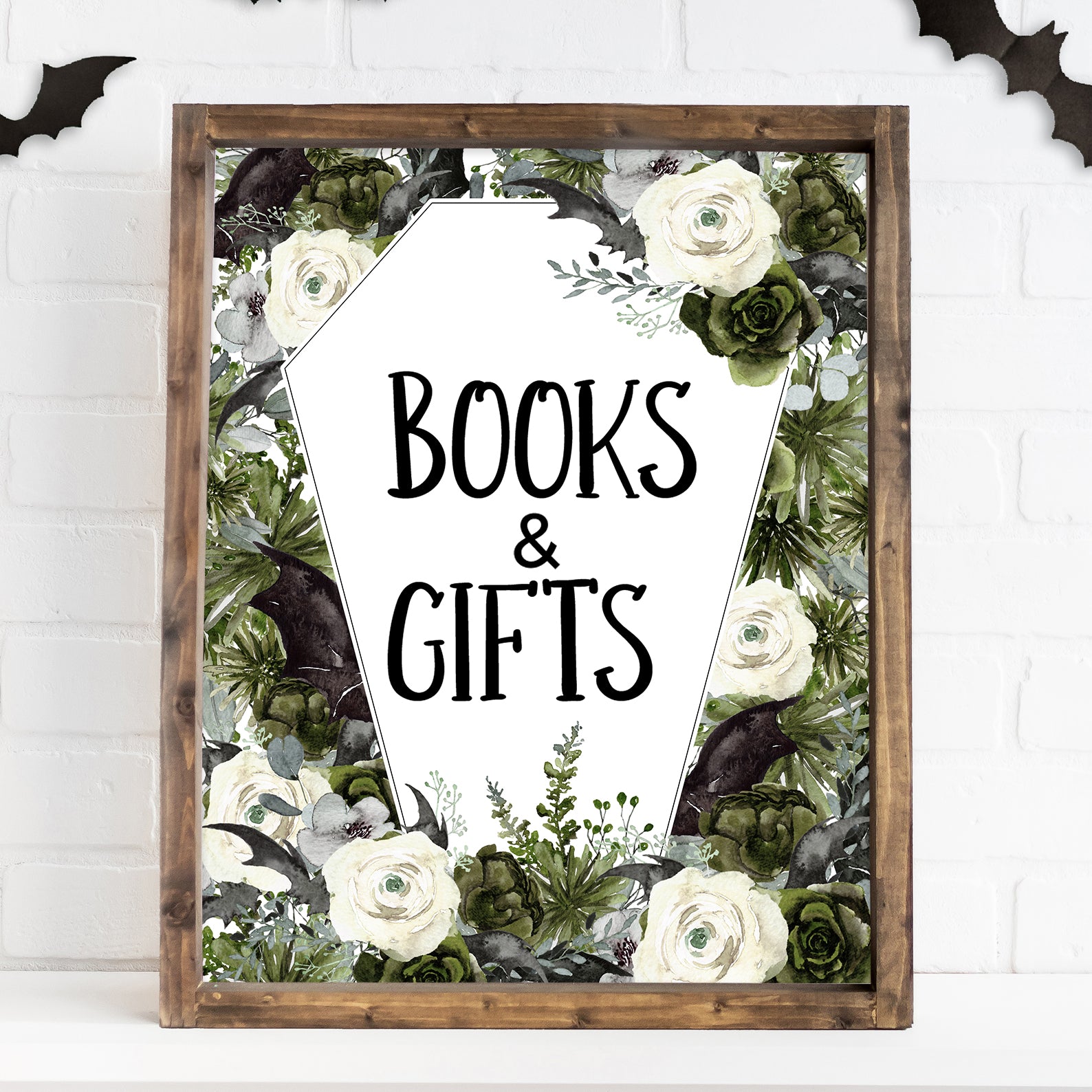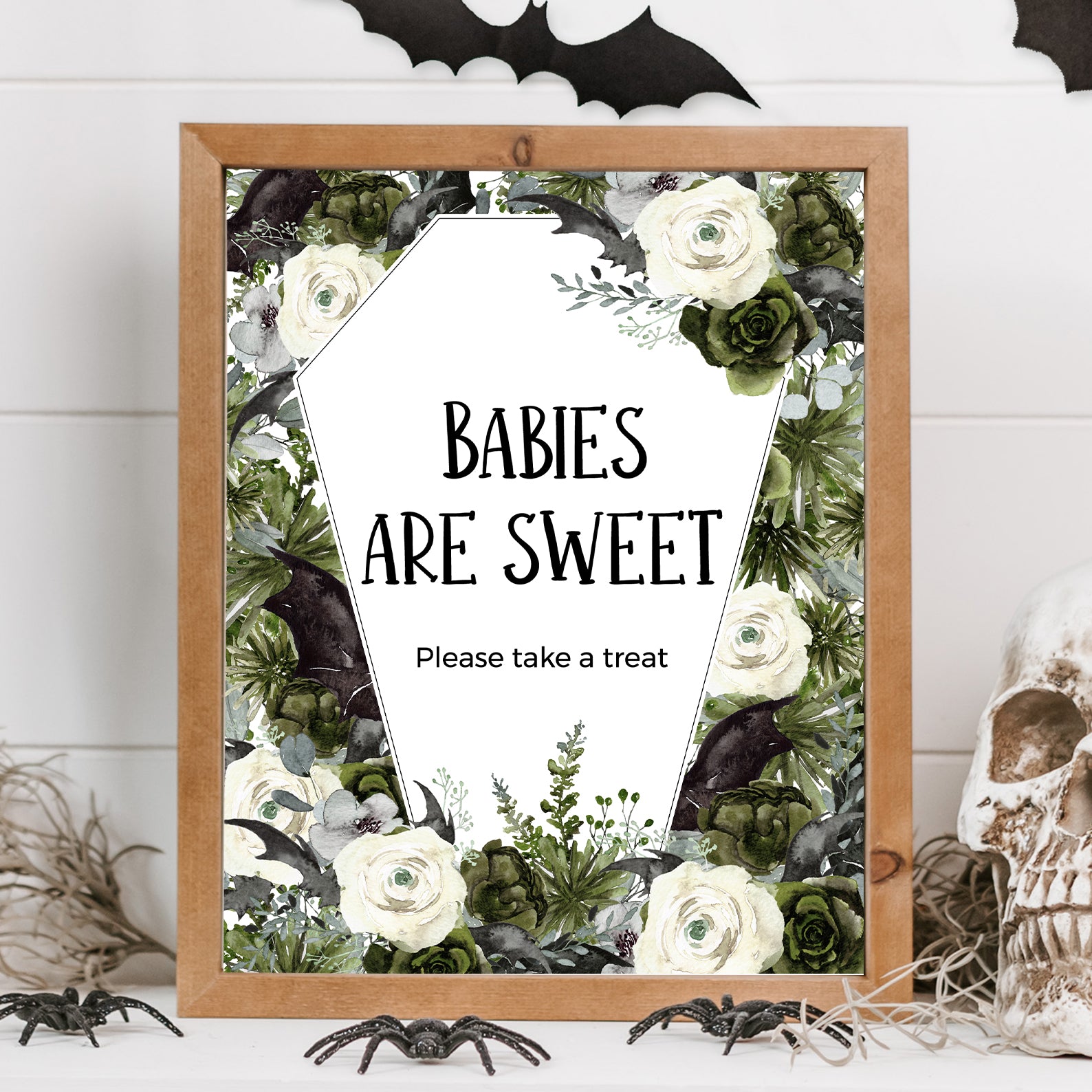 Coffin-Shaped Baby Shower Table Sign: Bats & Green Roses