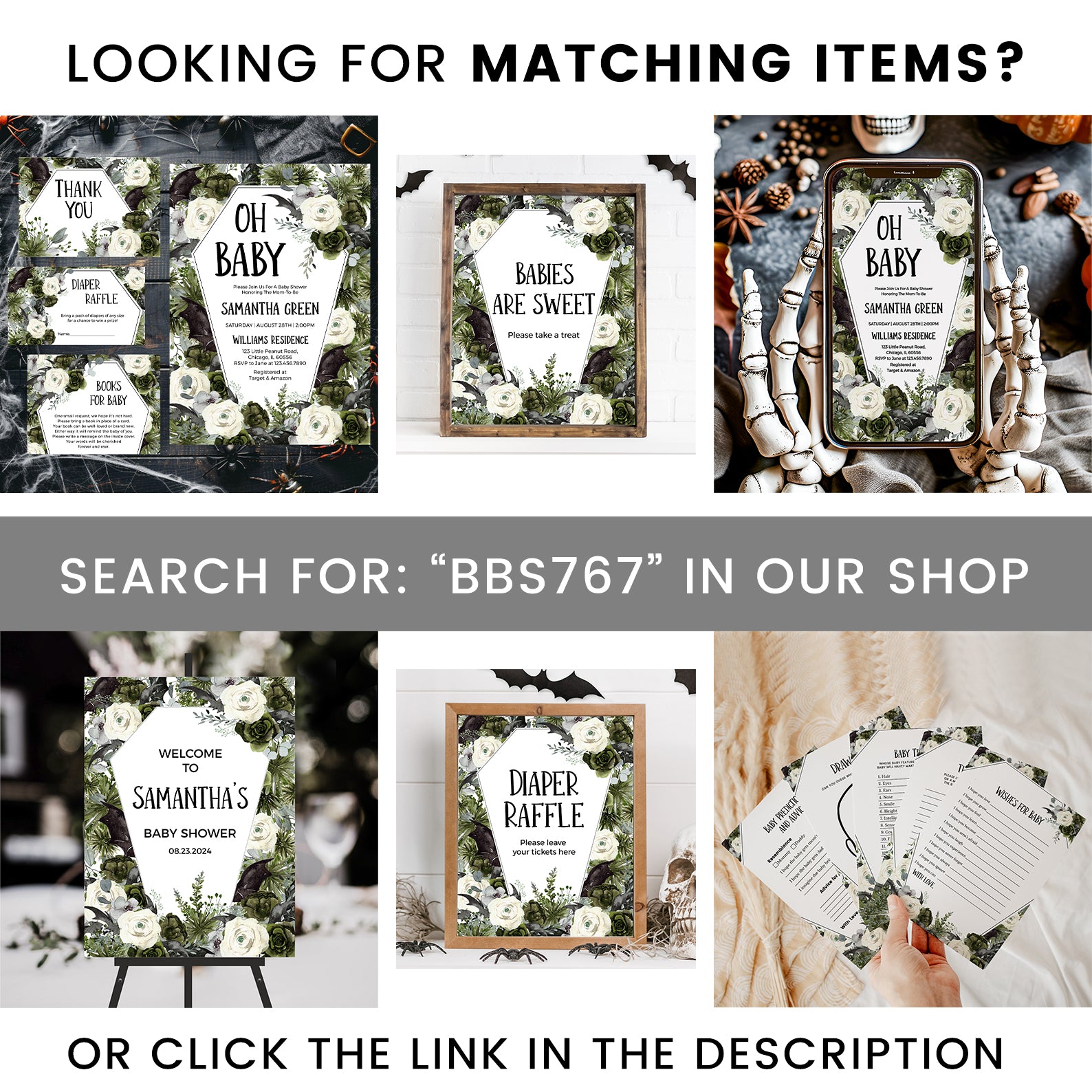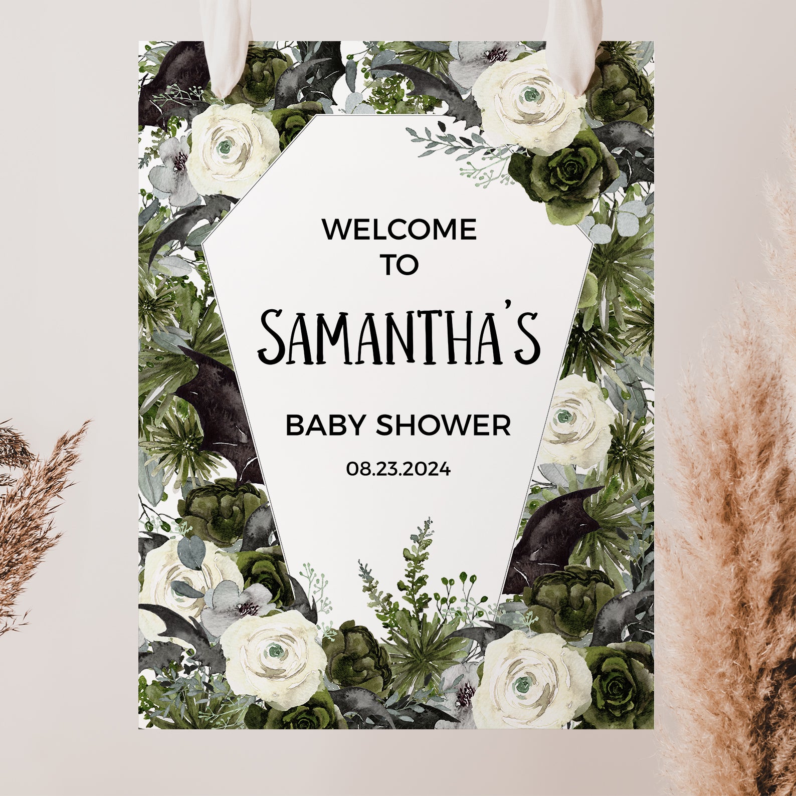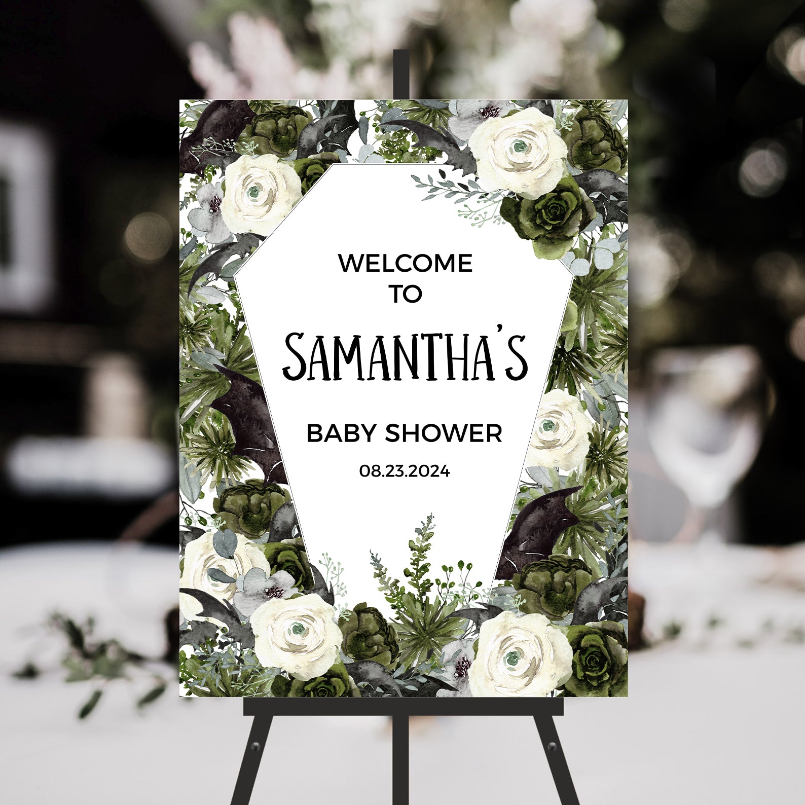- Purchase this Coffin-Shaped Baby Shower Welcome Sign: Bats & Green Roses template