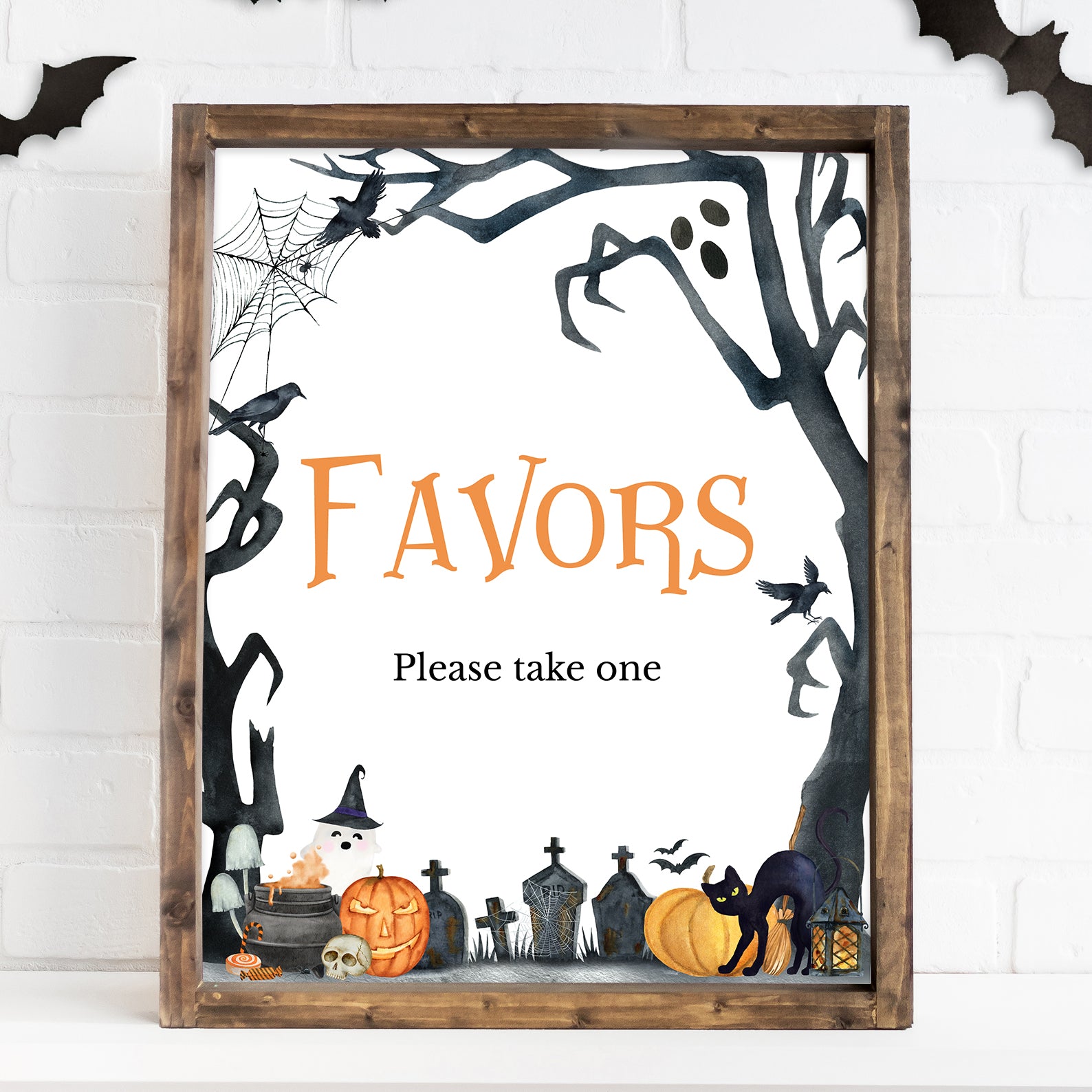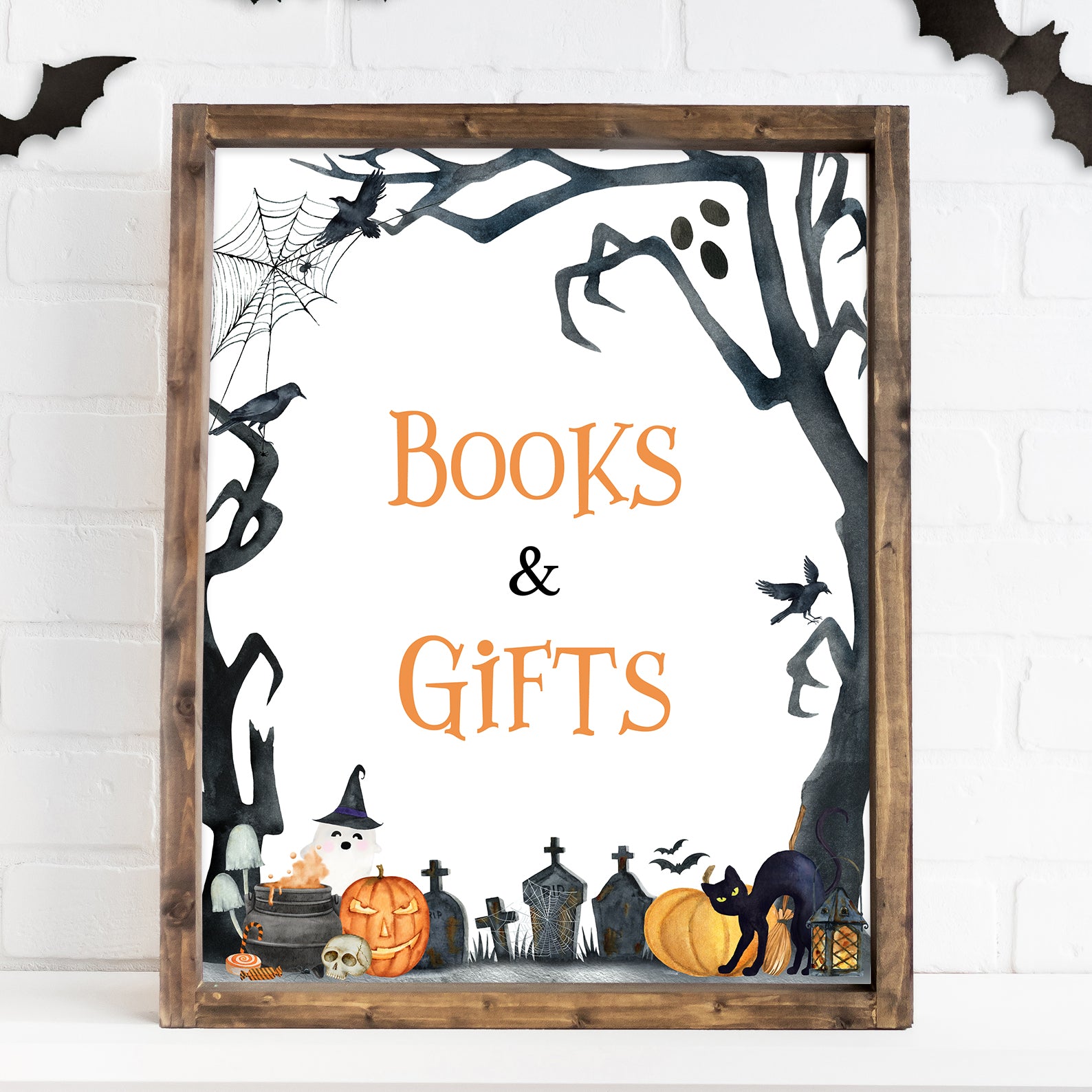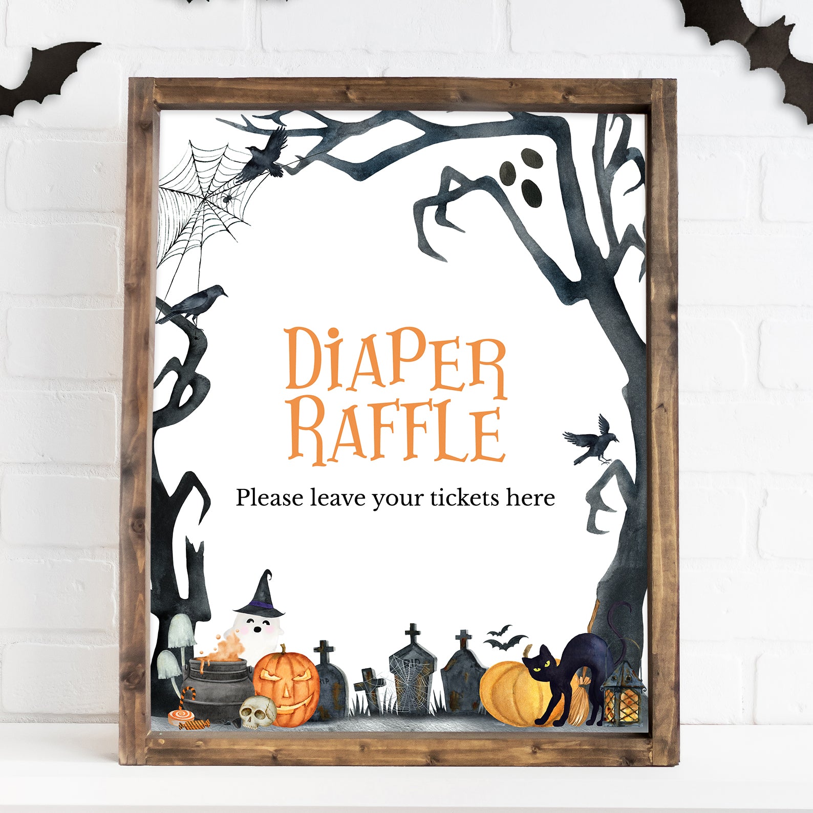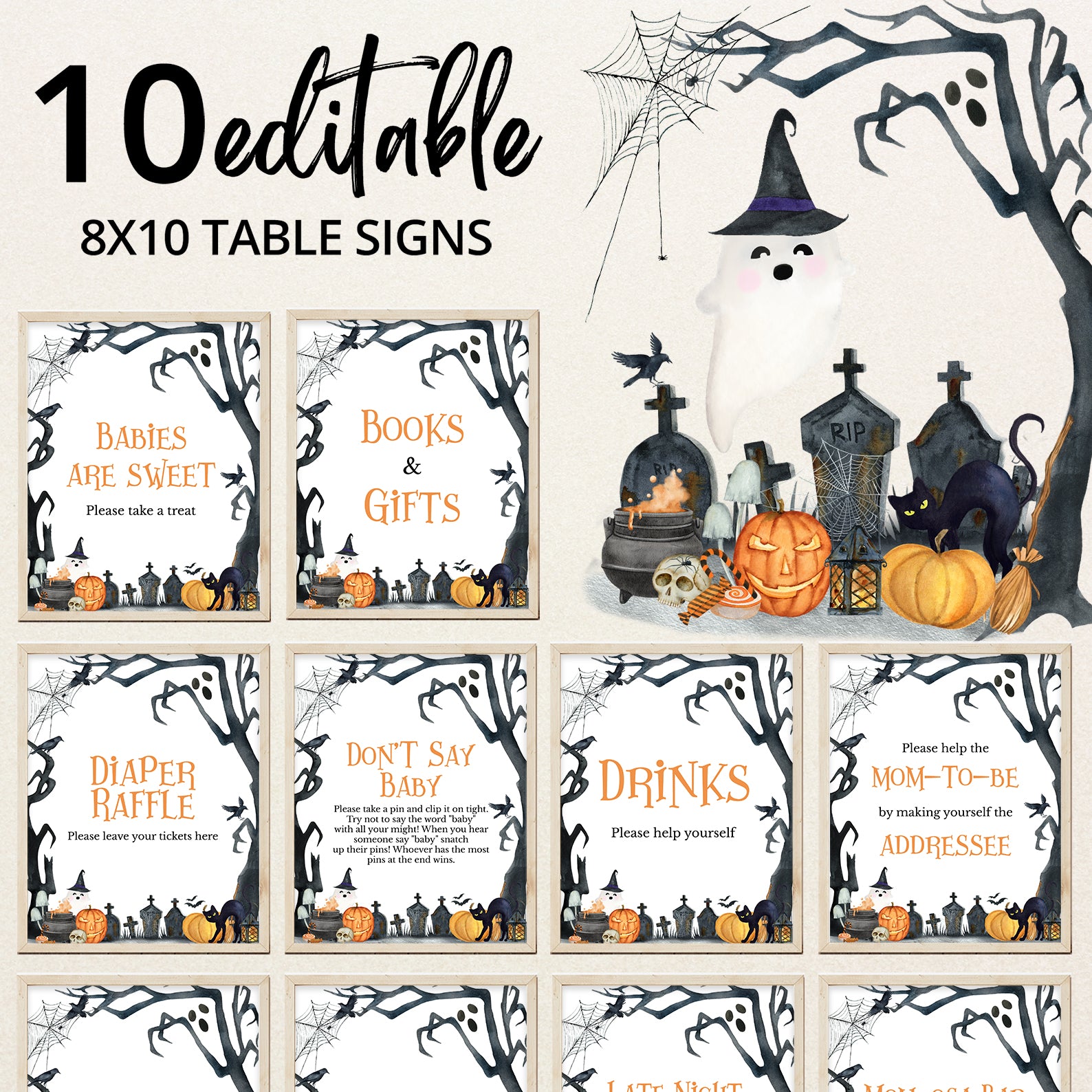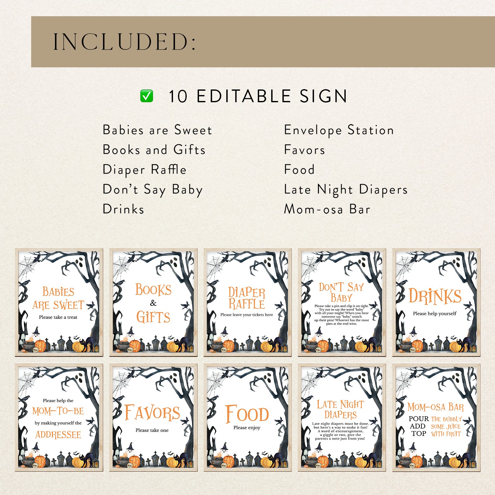 Enhance your baby shower with our "Oh Baby’s Spooky Celebration" table sign! Featuring spooky tree branches, flying crows, spider webs, tombstones, and a cute ghost in a witch hat, all set against a white background with a brewing cauldron, this sign adds an eerie yet charming touch to your table decor. It’s perfect for setting a fun and spooky tone at your event!