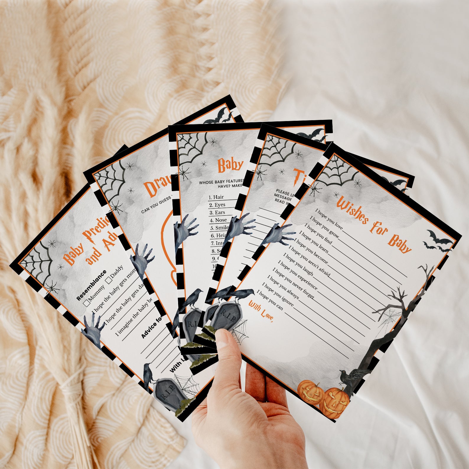 Our "Oh Baby" digital invitation is the perfect way to set the tone for your spooky celebration. The design features a striped frame adorned with chilling details: a scary hand reaching out, bats flying through the night, a spooky tree, spiders, webs, a menacing pumpkin, a flying crow, and a tombstone. Every element comes together to create a truly memorable and unique invitation. Perfect for a Halloween-themed baby shower, this bundle promises to bring a touch of frightful fun to your festivities. Get ready to spook and delight your guests with our captivating game bundle and invitation set!