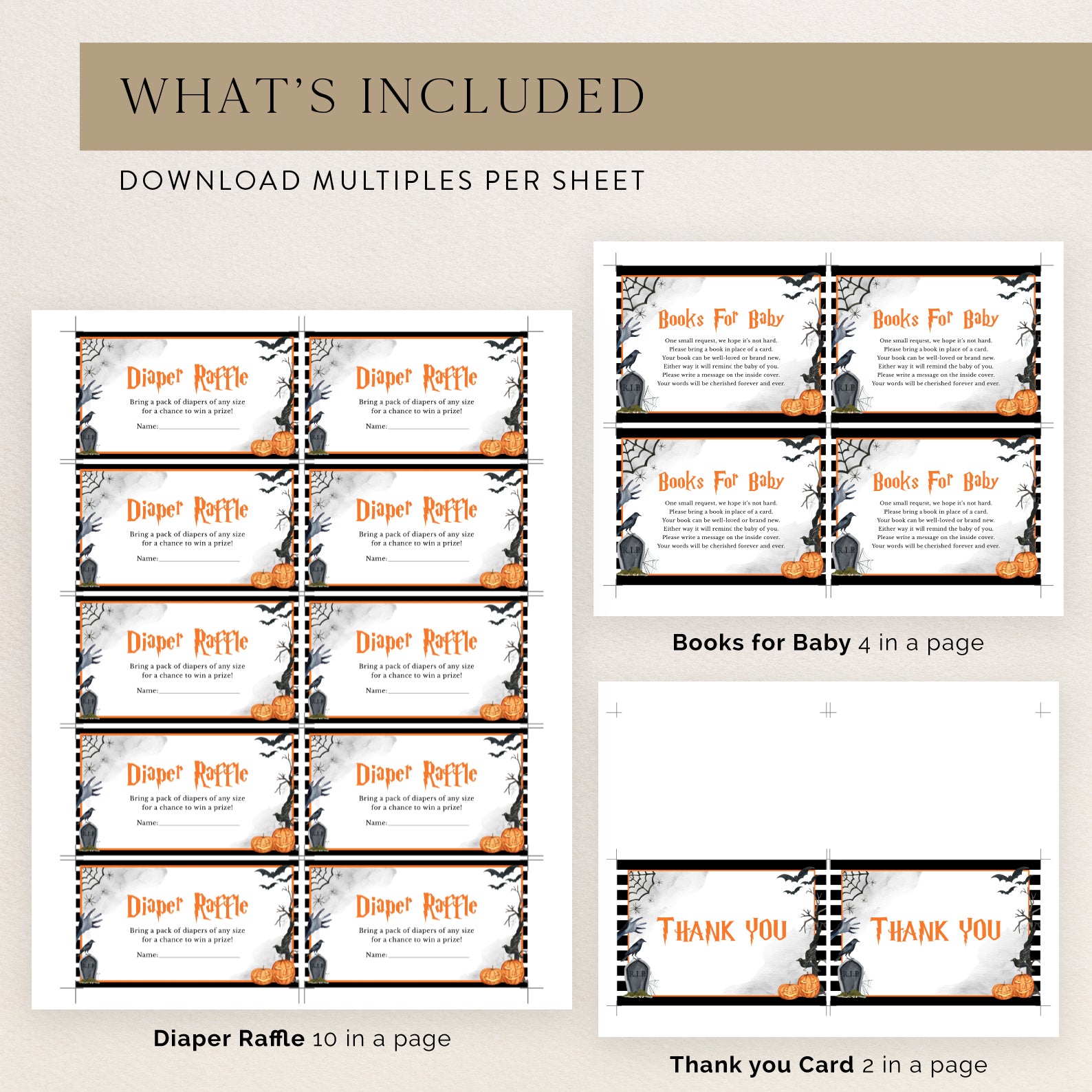 Get ready to spook your guests with our "Oh Baby" Halloween-themed baby shower invitation bundle! Featuring a striped frame with a scary hand, flying bats, a spooky tree, spiders, and a tombstone, this set includes an invitation, mobile version, diaper raffle, books for baby, and thank you card. Perfect for setting an eerie tone and ensuring a memorable, frightful celebration!