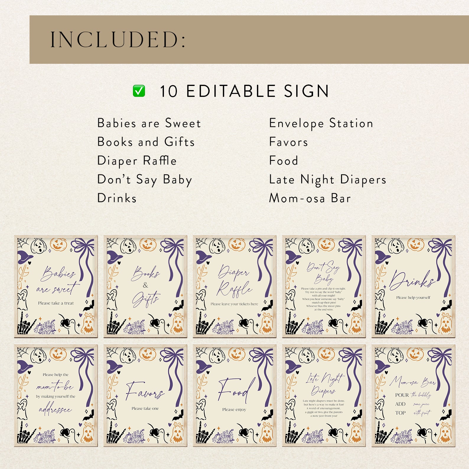 Add charm to your Halloween baby shower with our editable table sign set! Featuring pumpkins, spider webs, bats, and a festive witchy theme, this collection includes 10 signs: Babies Are Sweet, Books and Gifts, Diaper Raffle, Don’t Say Baby, Drinks, Envelope Station, Favors, Food, Late Night Diapers, and Mom-osa Bar. Designed to match your Halloween décor, these signs make your setup organized, stylish, and fun for guests.