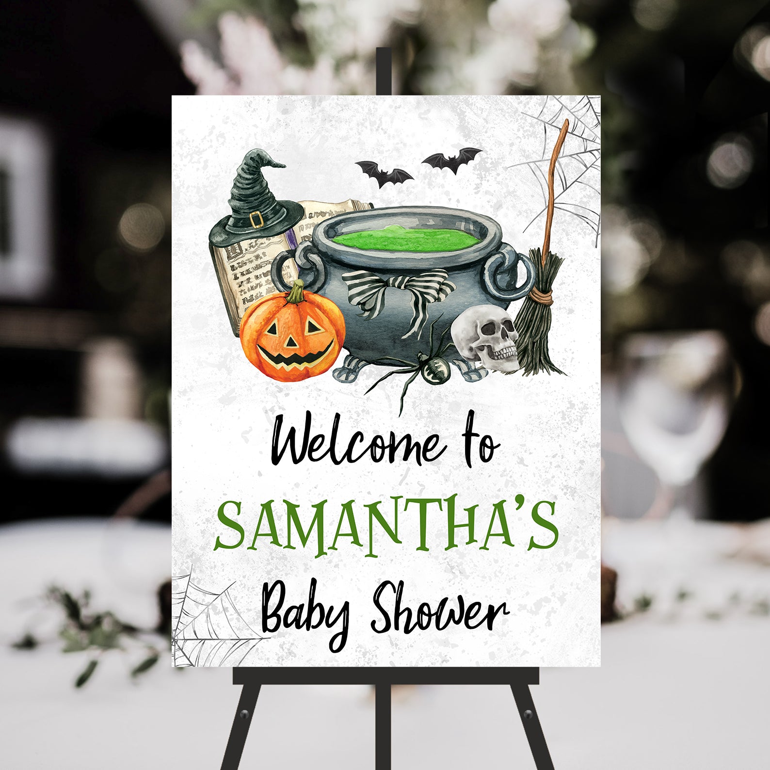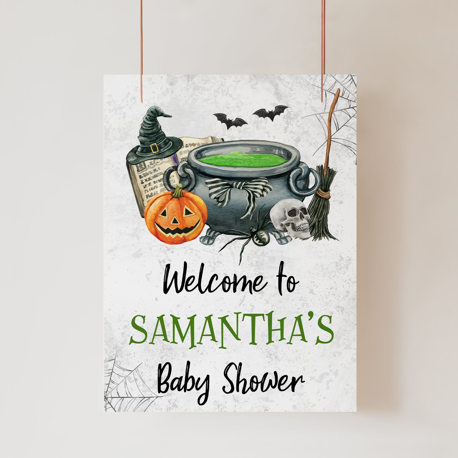 1. Purchase this A Baby is Brewing: Whimsical Halloween Green Baby Shower Welcome Sign! template