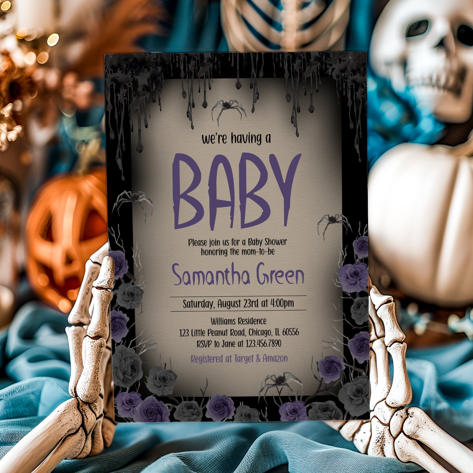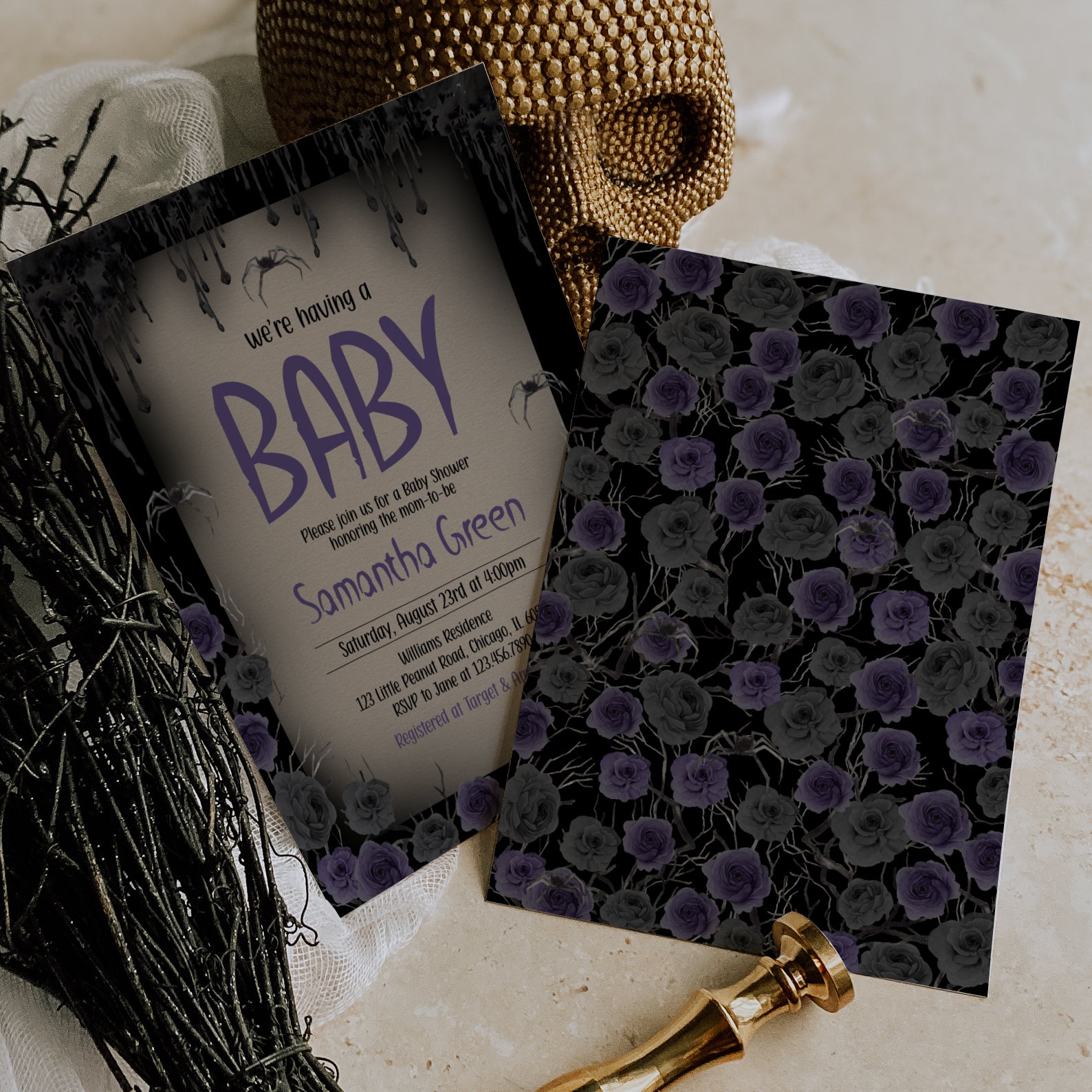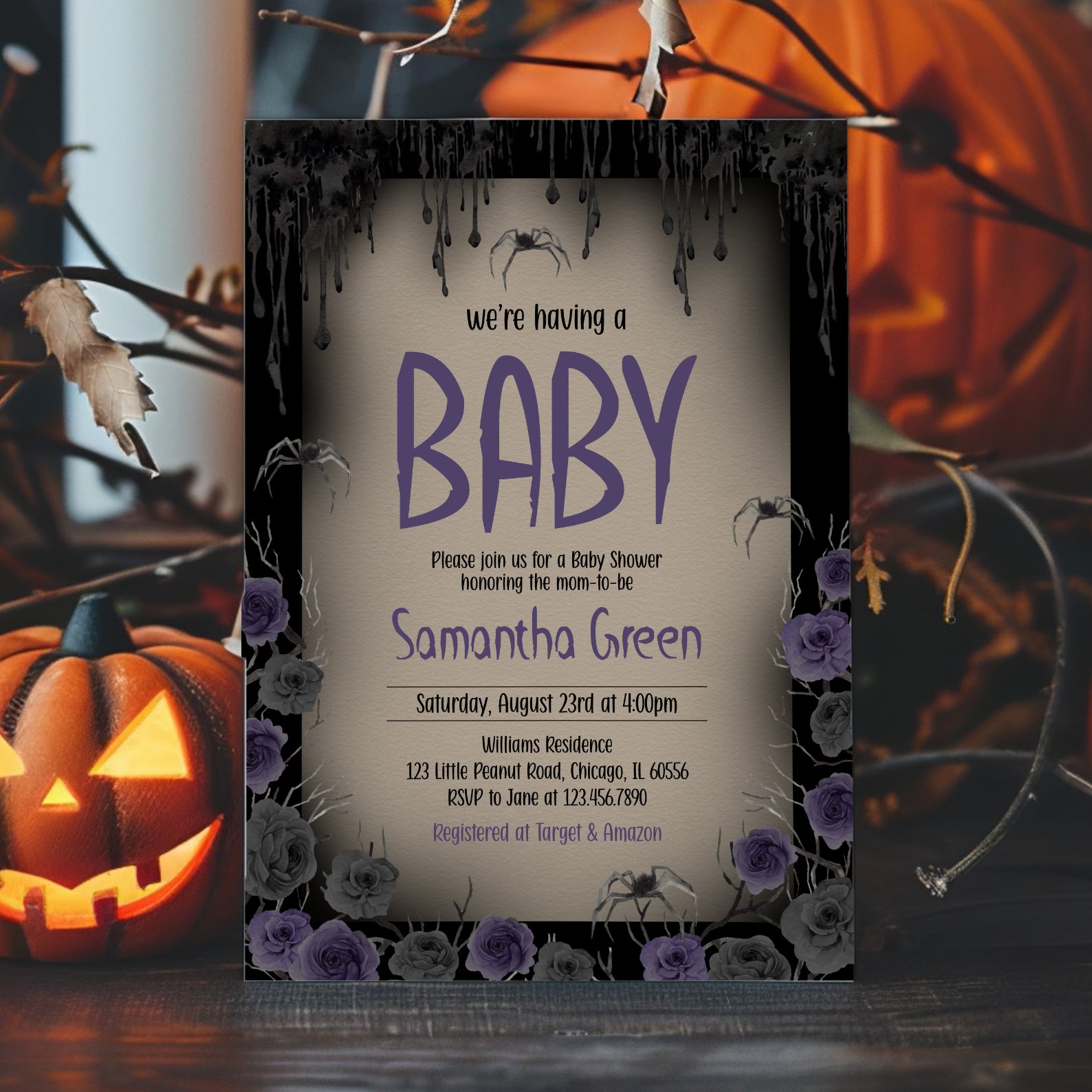 - Purchase this We're Having a Baby: Halloween Purple Roses Baby Shower Invite template