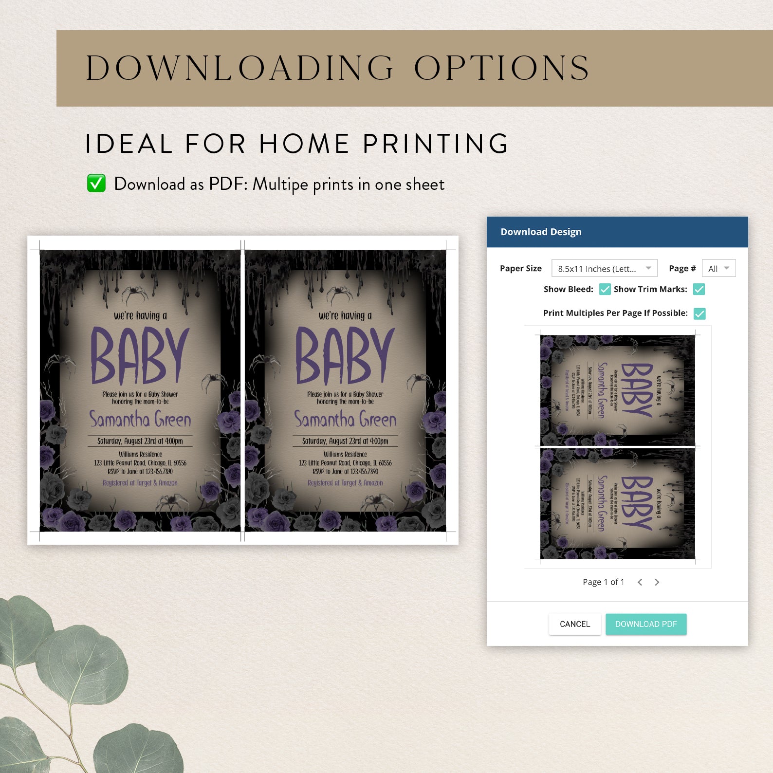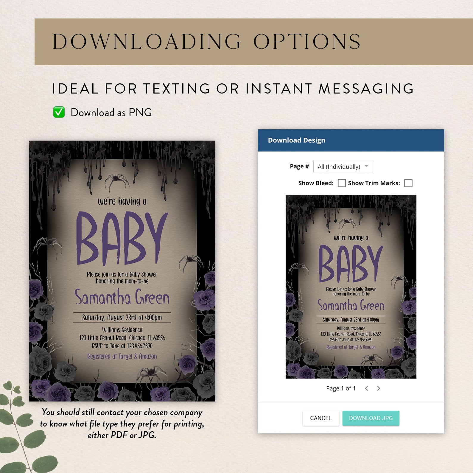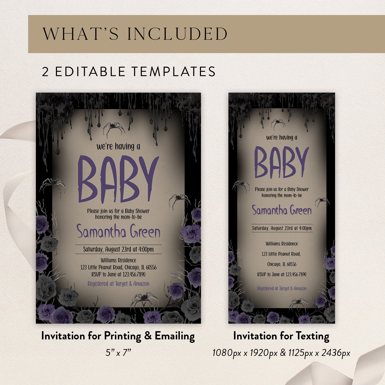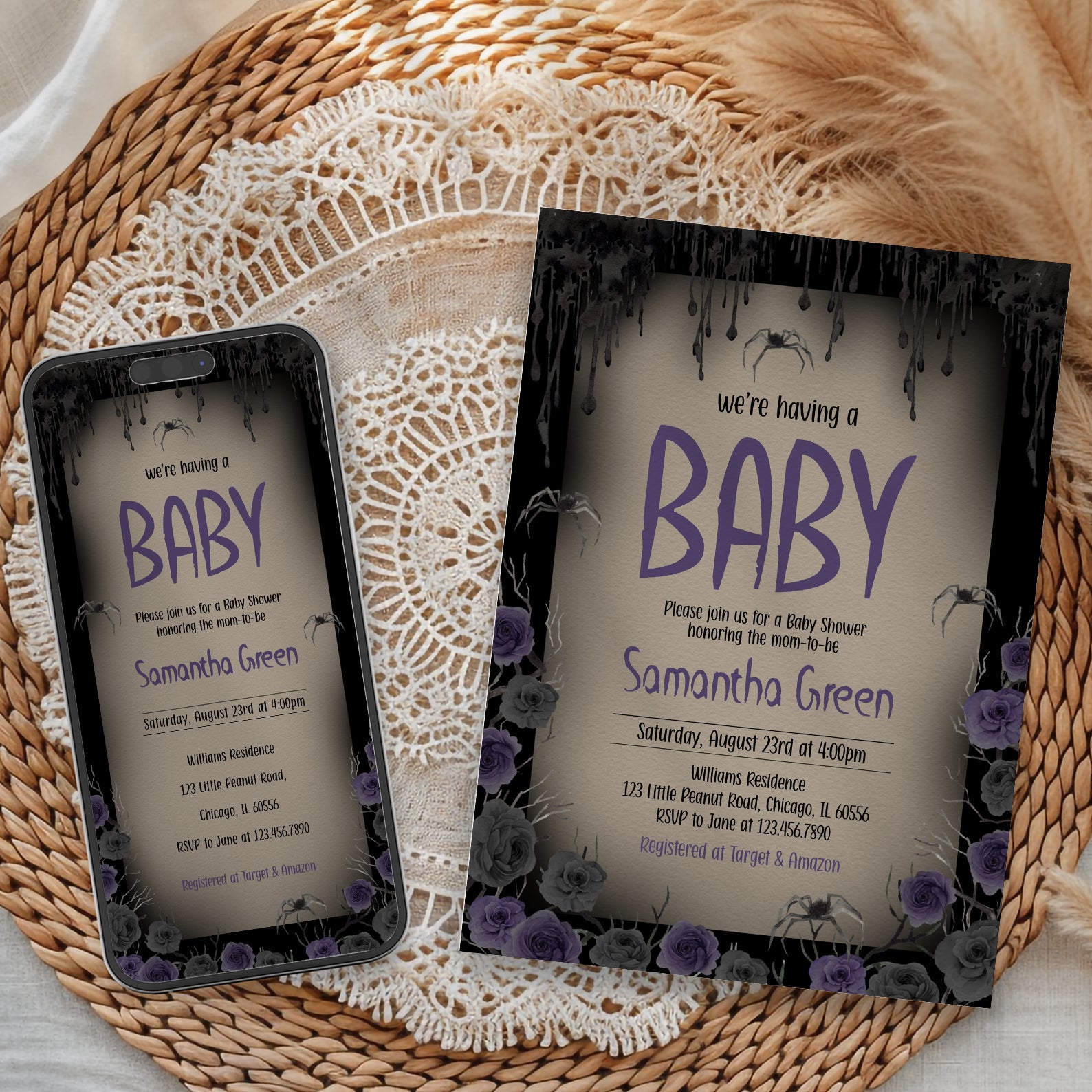 - Purchase this We're Having a Baby: Halloween Purple Roses Baby Shower Invite template