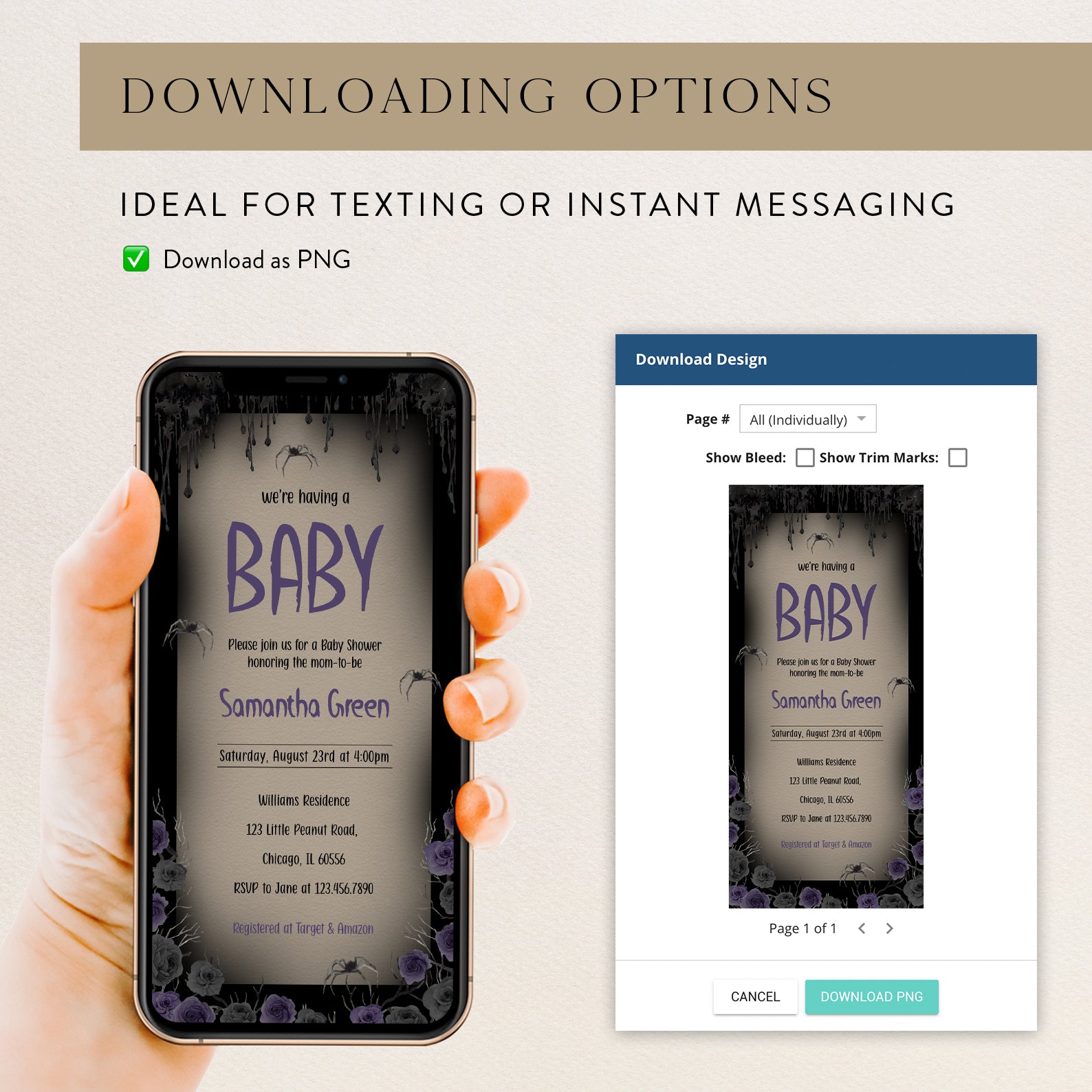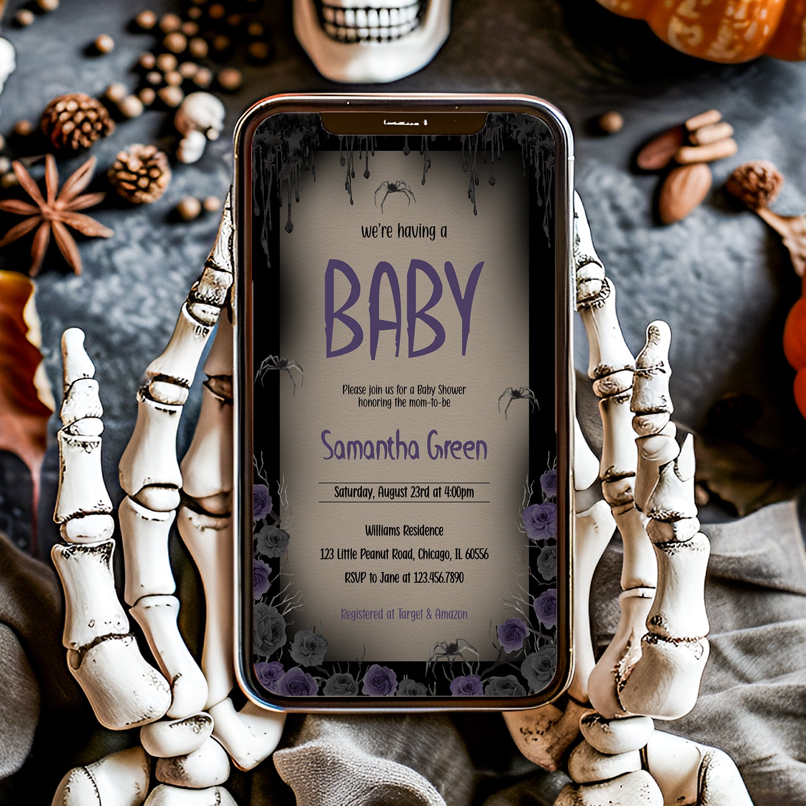Invite guests to your Halloween-themed baby shower with our "We’re Having a Baby: Halloween Purple Roses Baby Shower Invite." This digital invitation features elegant Halloween roses and a festive design, making it perfect for celebrating your little one’s arrival. Order now to plan a memorable, sweet, and spooky baby shower!