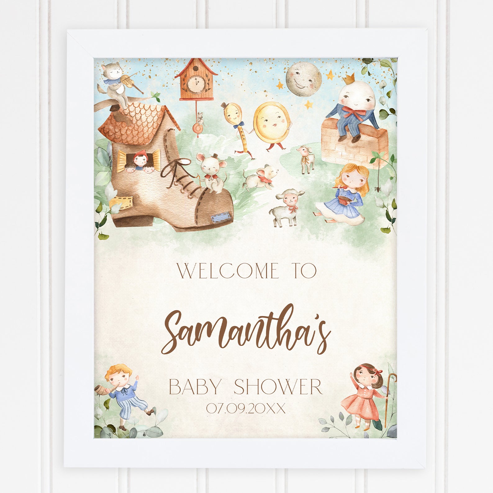 Welcome guests to your storybook-inspired baby shower with this charming Humpty Dumpty-themed welcome sign! Featuring whimsical nursery rhyme characters like an old woman in a shoe, Little Bo Peep, and Humpty Dumpty on a brick wall, this delightful design sets the perfect tone for a magical celebration.