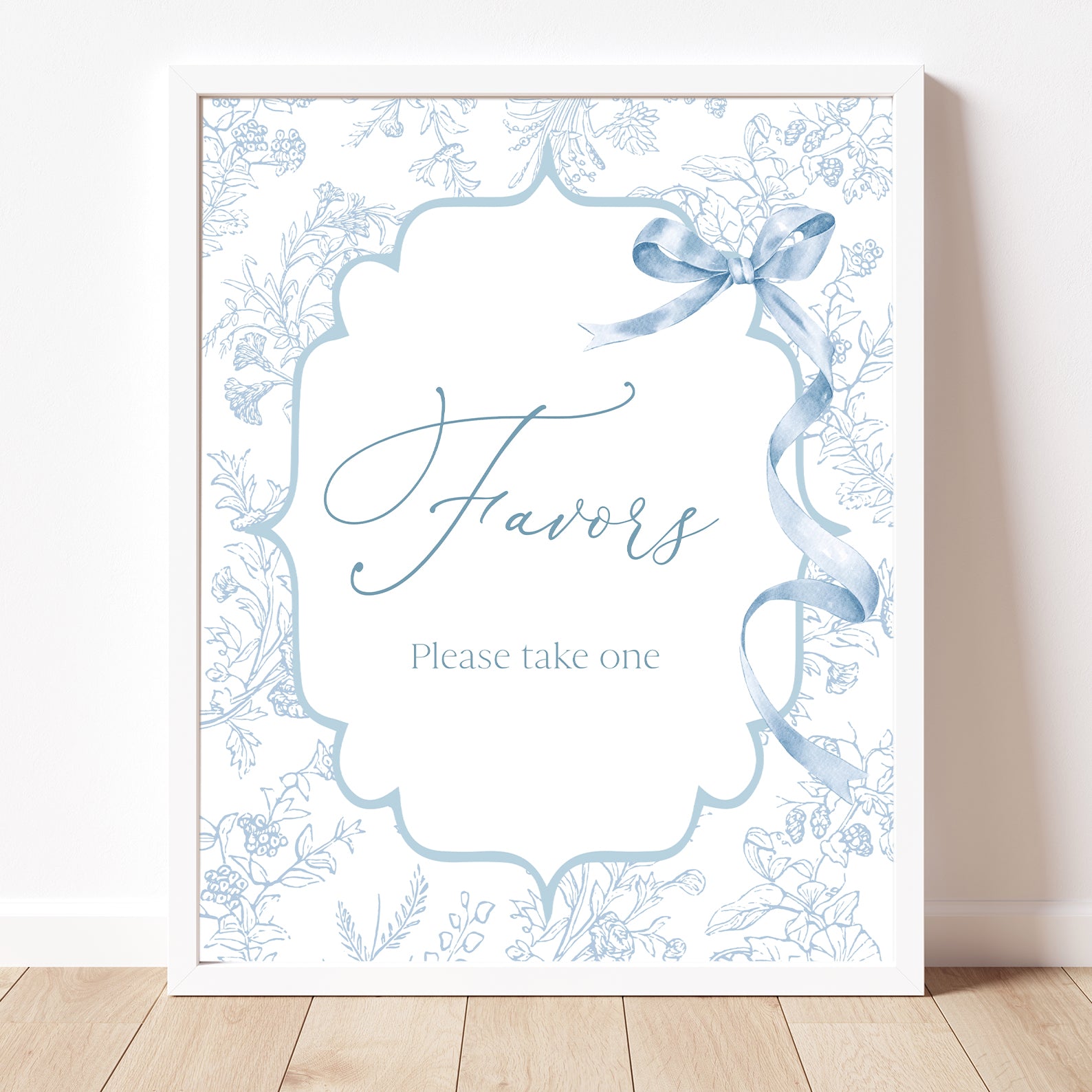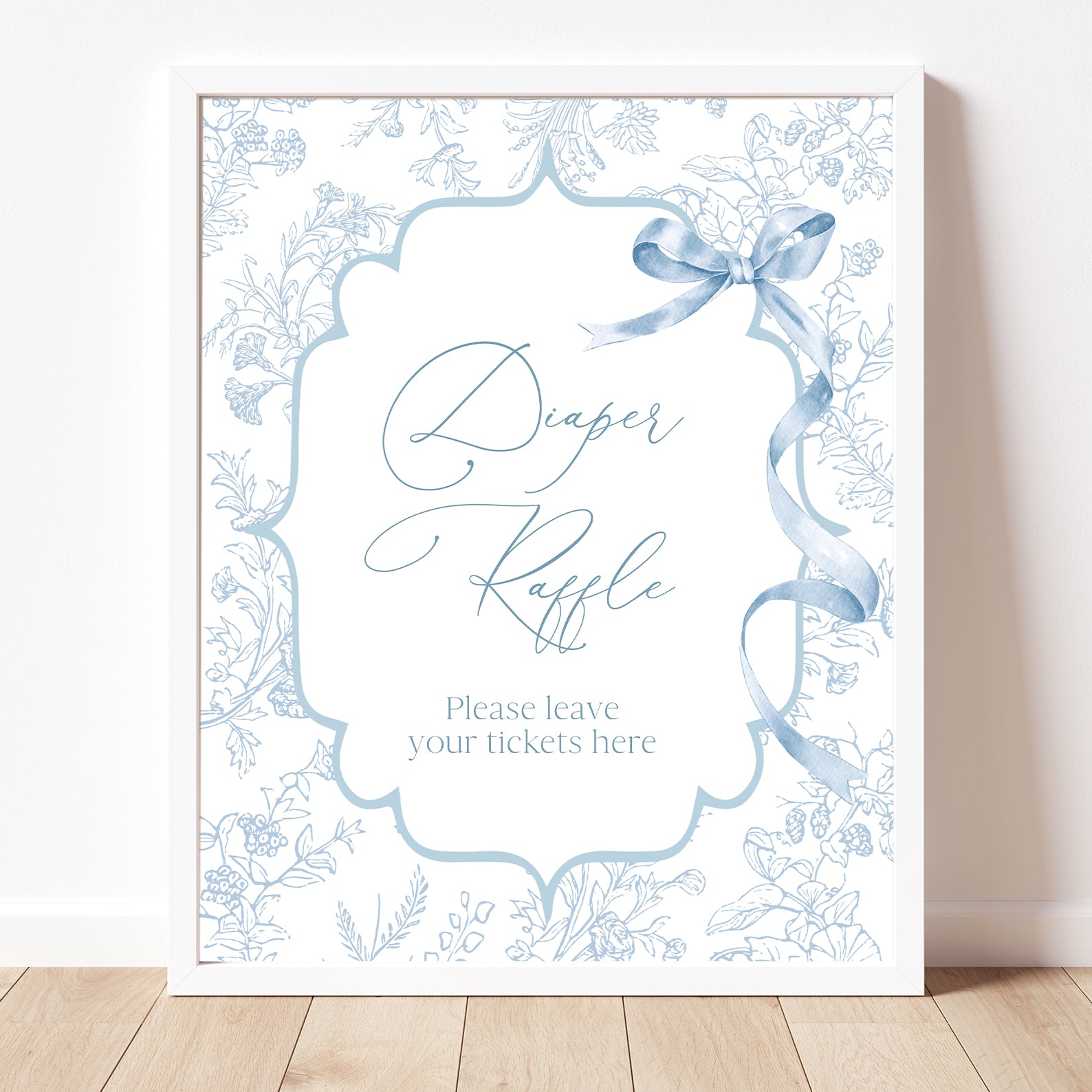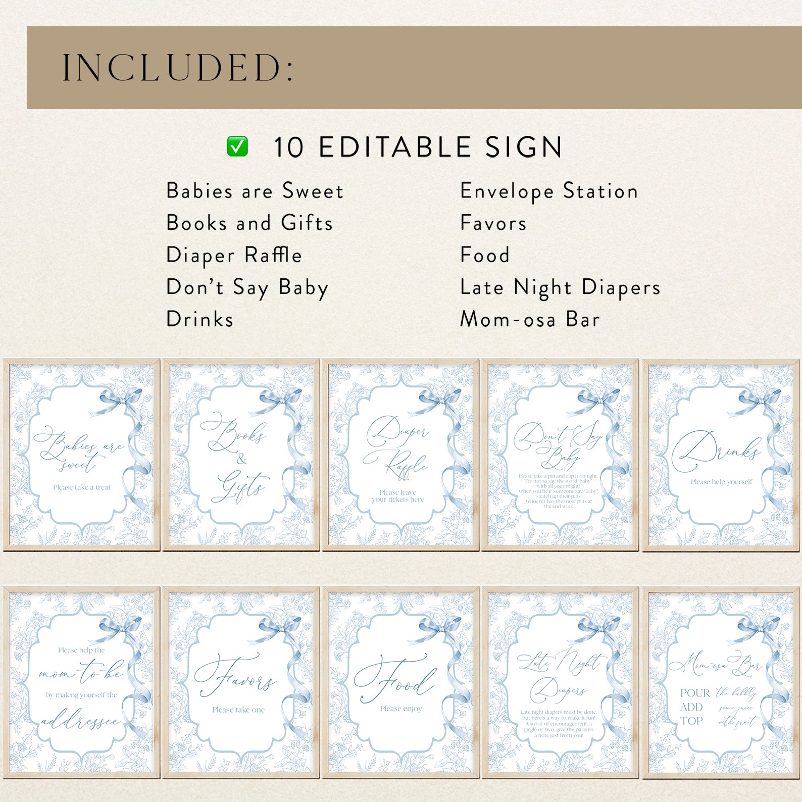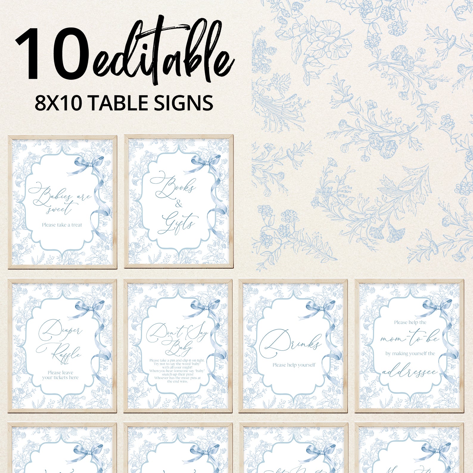 Add a royal touch to your celebration with this charming set of ten editable baby shower table signs. Designed with an elegant blue theme, featuring fancy shapes, delicate floral patterns, and a lovely ribbon accent, these signs are perfect for welcoming your little prince. The set includes Babies Are Sweet, Books and Gifts, Diaper Raffle Sign, Don't Say Baby, Drinks Sign, Envelope Station, Favors, Food Sign, Late Night Diapers, and Mom-osa Bar.