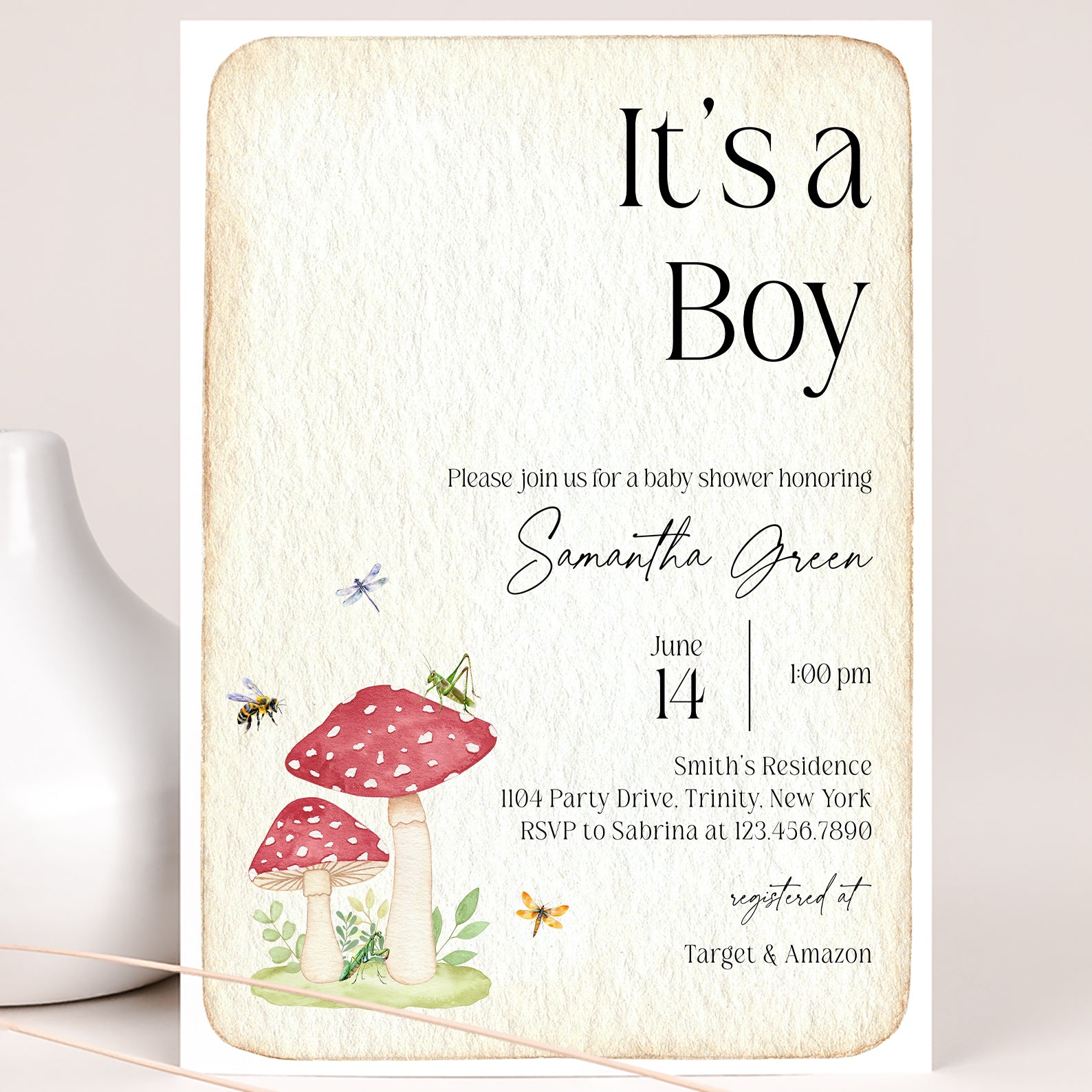 Celebrate the arrival of your little one with our charming Summer Baby Shower Digital Invitation! This minimalist design features two delightful red mushrooms at the bottom, surrounded by whimsical flying bees, a graceful dragonfly, and a playful grasshopper, all beautifully illustrated on vintage paper. Perfect for setting a joyful tone for your "It's a Boy" celebration, this invitation combines elegance with a touch of nature, making it an ideal choice for your special day. Easy to customize and send, it’s the perfect way to invite friends and family to share in your excitement!