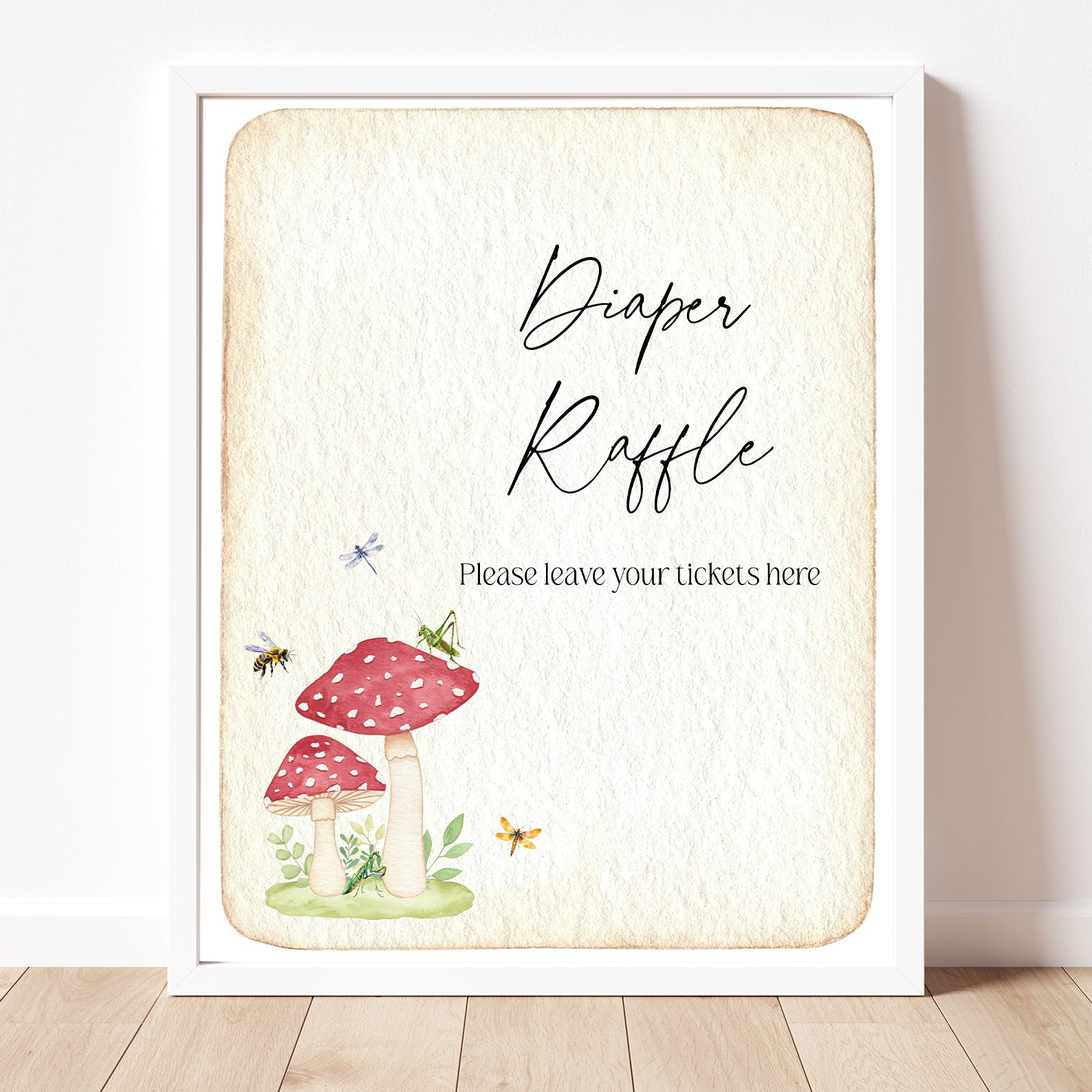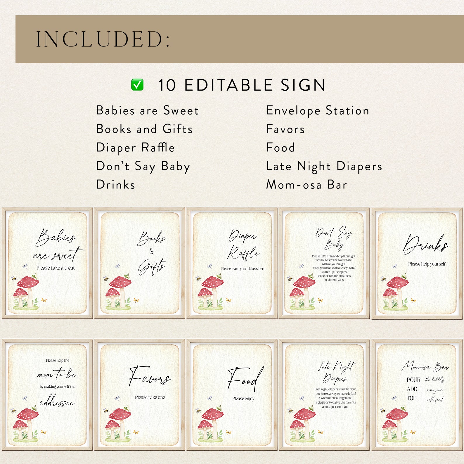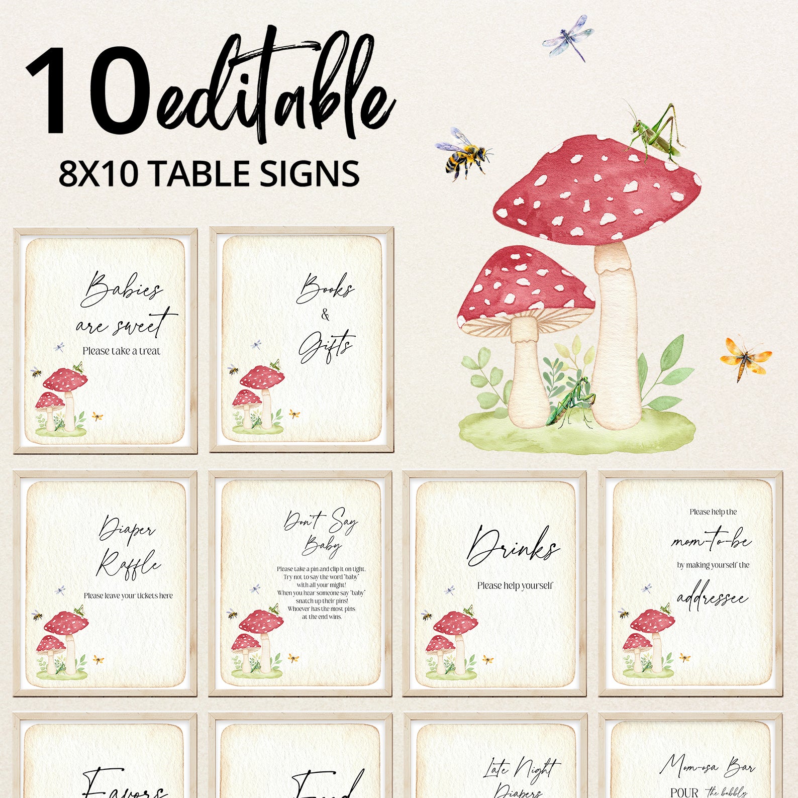 Add a touch of vintage charm to your baby shower with this set of 10 editable table signs, featuring red mushrooms, buzzing bees, a dragonfly, and a grasshopper on aged paper. This nature-inspired design includes signs for Babies Are Sweet, Books and Gifts, Diaper Raffle, Don’t Say Baby, Drinks, Envelope Station, Favors, Food, Late Night Diapers, and Mom-osa Bar. Perfectly styled for a sweet and whimsical celebration.