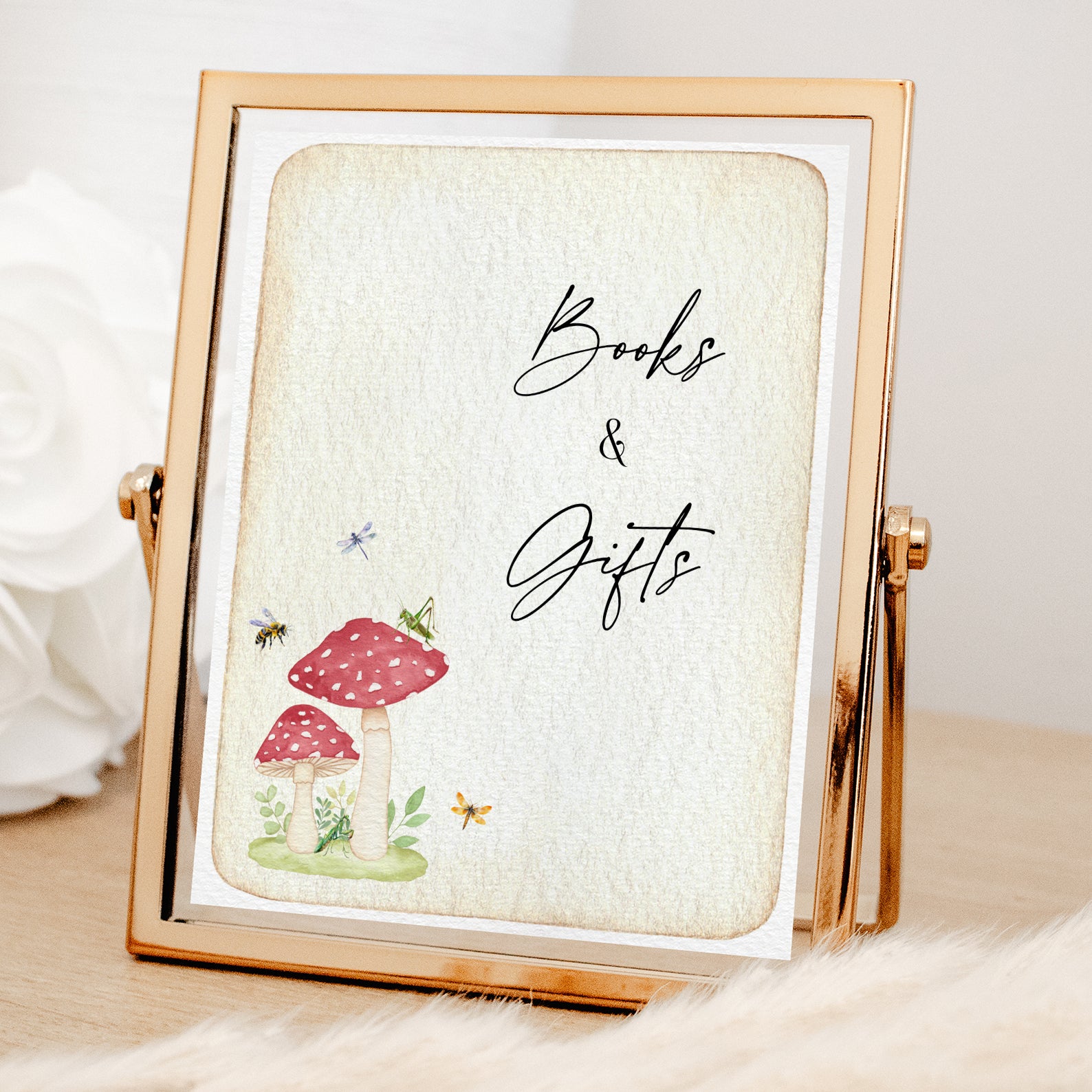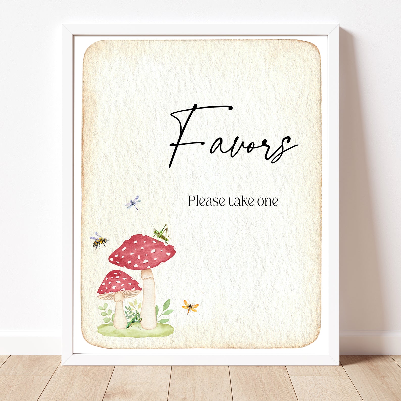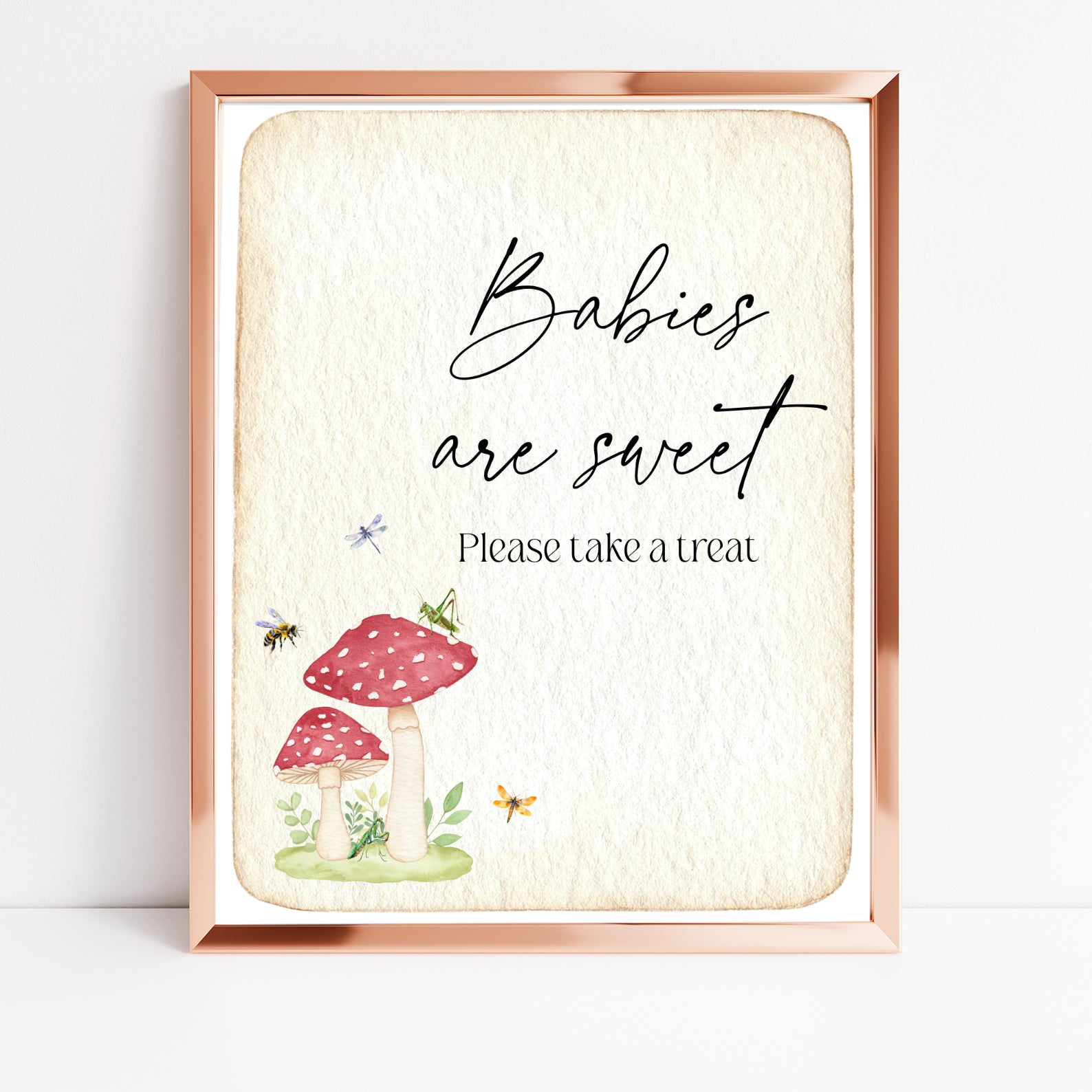 Add a touch of vintage charm to your baby shower with this set of 10 editable table signs, featuring red mushrooms, buzzing bees, a dragonfly, and a grasshopper on aged paper. This nature-inspired design includes signs for Babies Are Sweet, Books and Gifts, Diaper Raffle, Don’t Say Baby, Drinks, Envelope Station, Favors, Food, Late Night Diapers, and Mom-osa Bar. Perfectly styled for a sweet and whimsical celebration.
