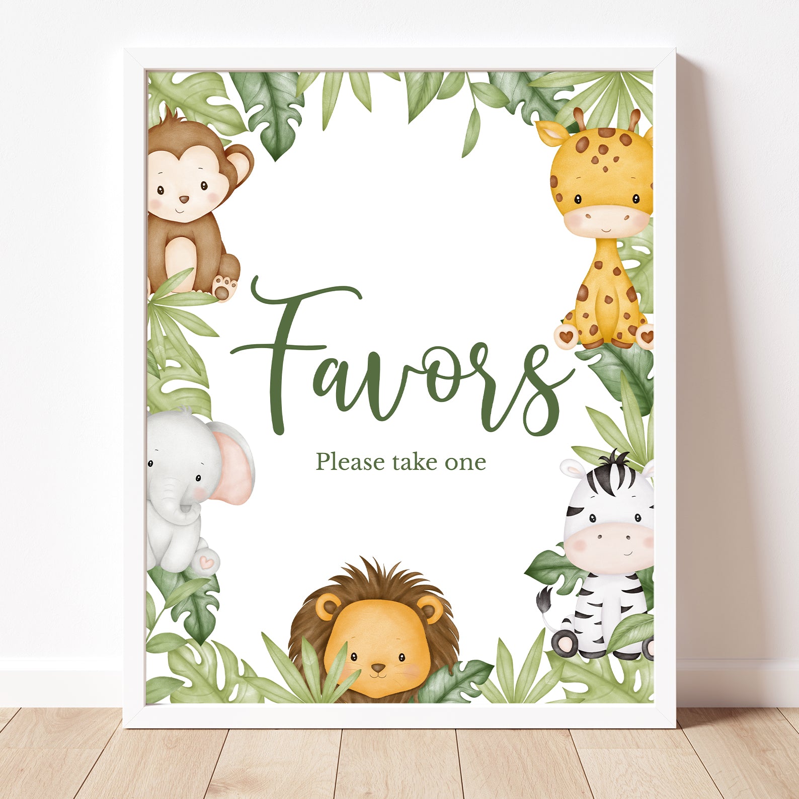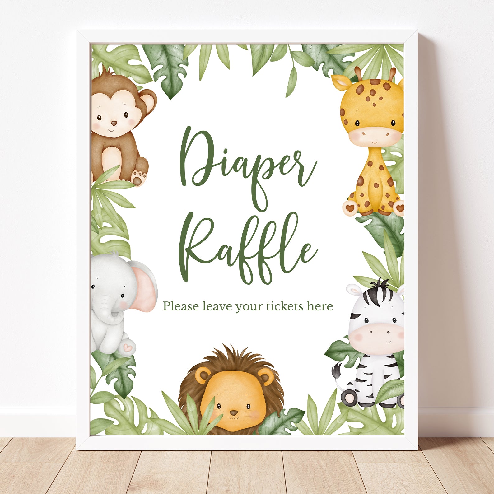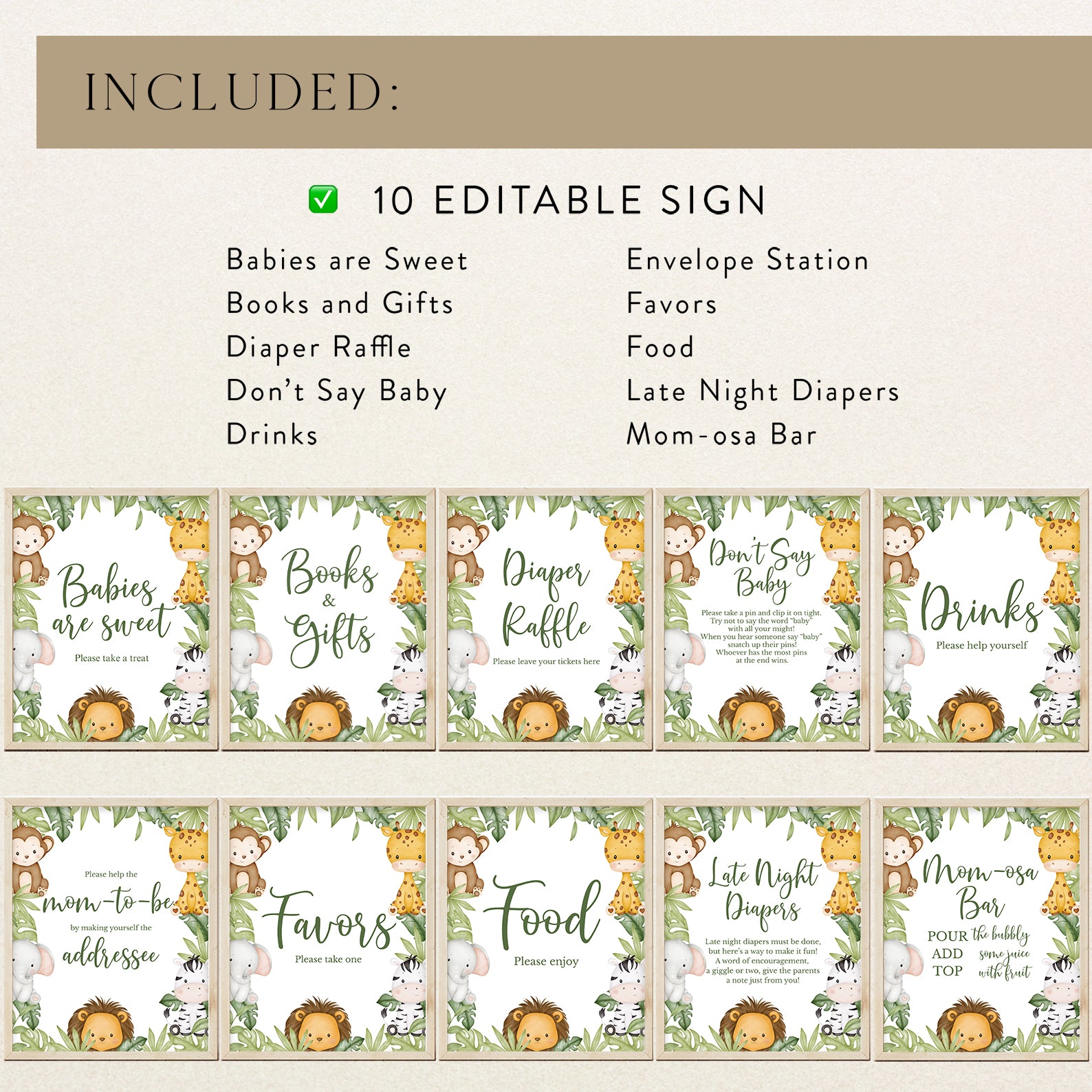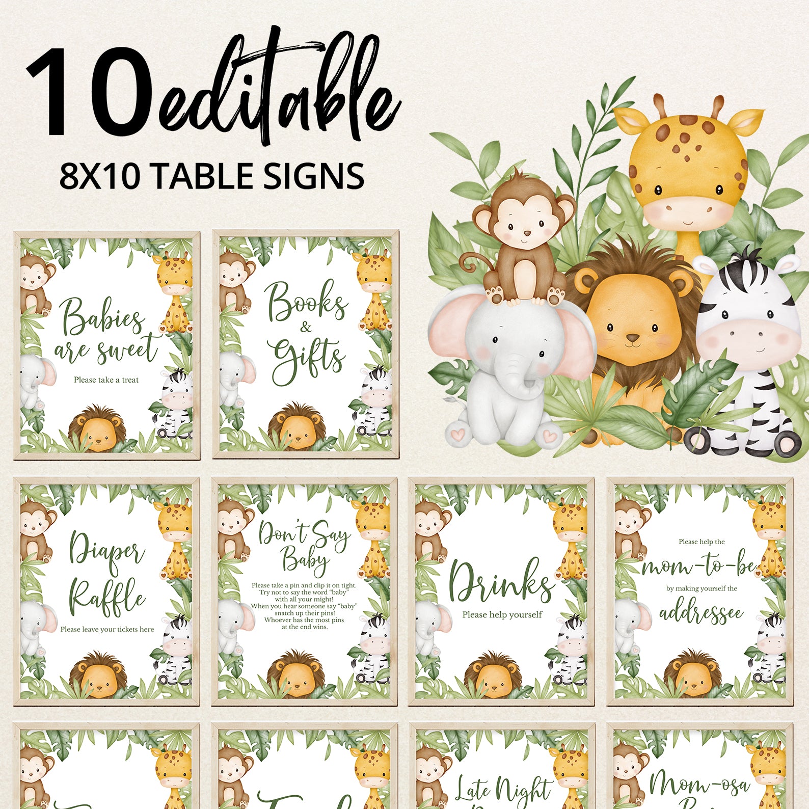 Add a playful touch to your baby shower with our Jungle Safari Table Sign Set! This editable pack includes 10 signs: Babies Are Sweet, Books and Gifts, Diaper Raffle, Don’t Say Baby, Drinks, Envelope Station, Favors, Food, Late Night Diapers, and Mom-osa Bar. Featuring adorable safari animals with leafy jungle accents, these signs beautifully match your theme while keeping everything organized. A stylish and functional addition to your celebration!