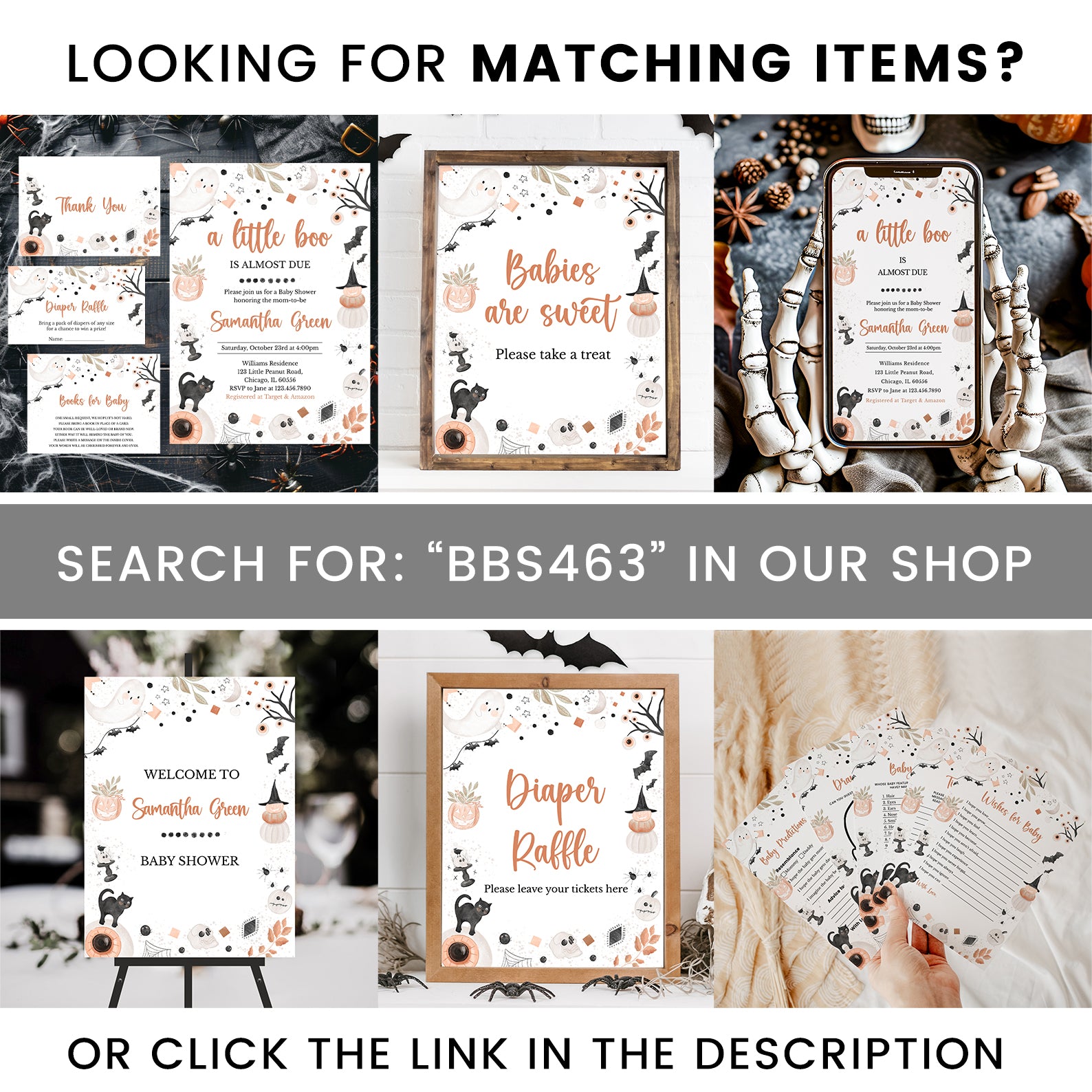 Our Boho Halloween Baby Shower Invitation sets the stage with its charming design elements: a cute ghost, flying bats, a spooky cute pumpkin, a black cat, spiders, spider webs, and spooky tree branches with eyeballs. These whimsical and spooky elements, combined with a bohemian flair, create a unique and eye-catching invitation. Set the perfect tone for your Halloween-themed baby shower with this playful and festive design that captures the spirit of the season while celebrating the upcoming arrival of your little one. Get ready for a spooktacular celebration with our Little Boo is Almost Due Boho Halloween Baby Shower Game Bundle!