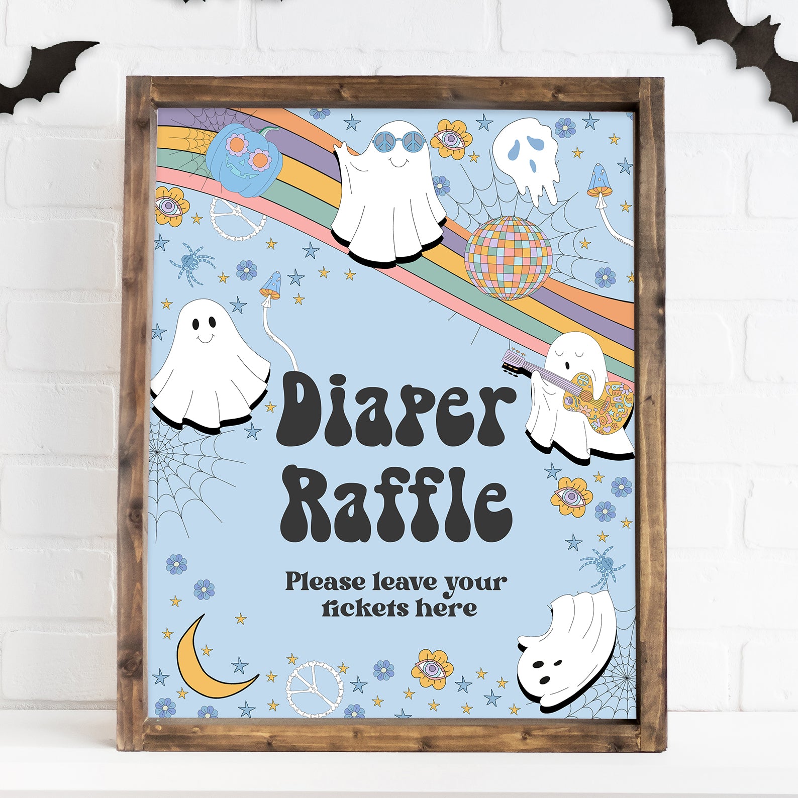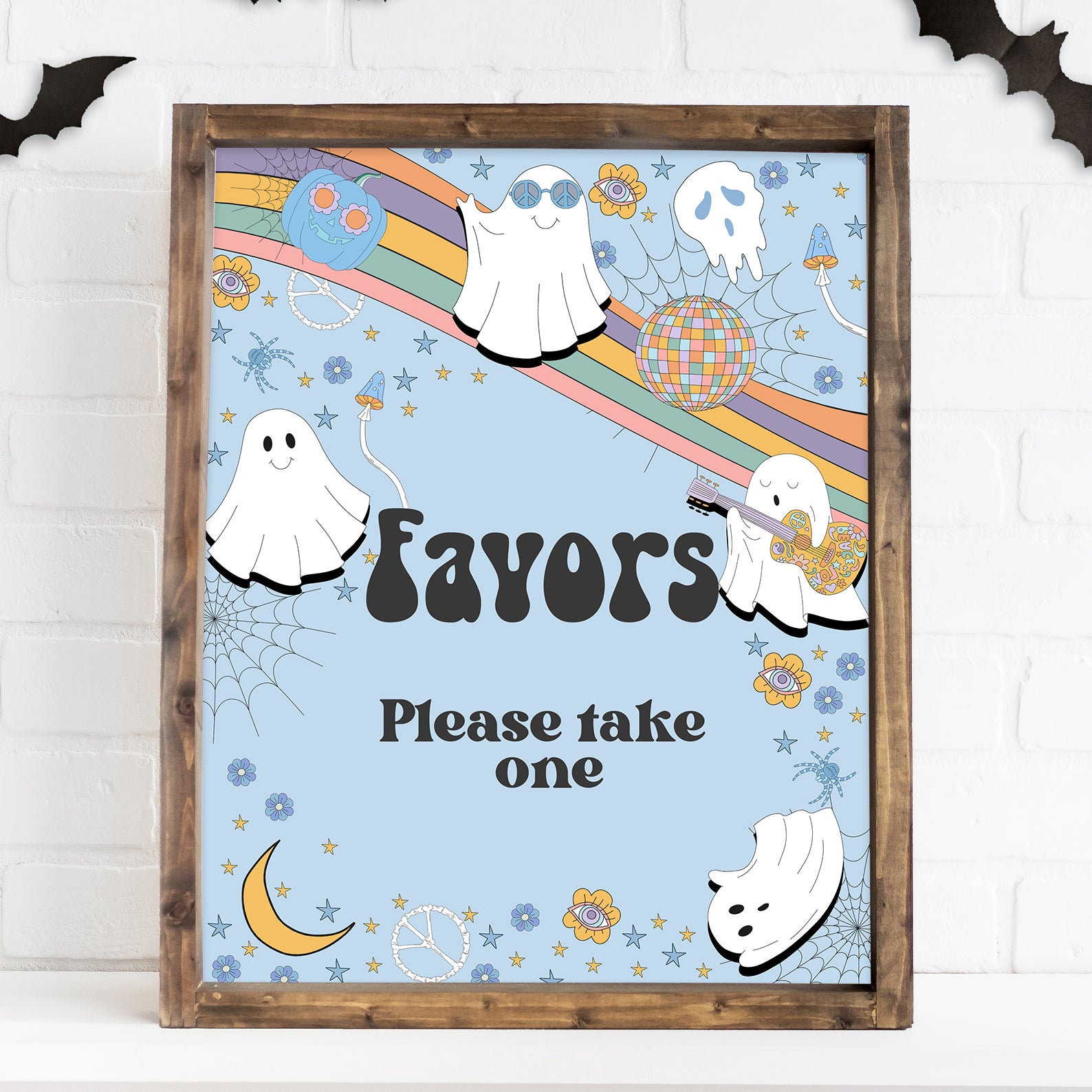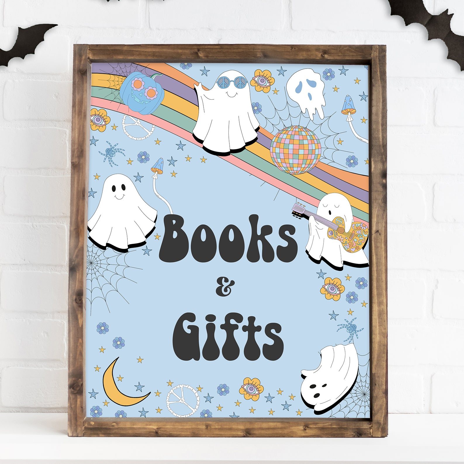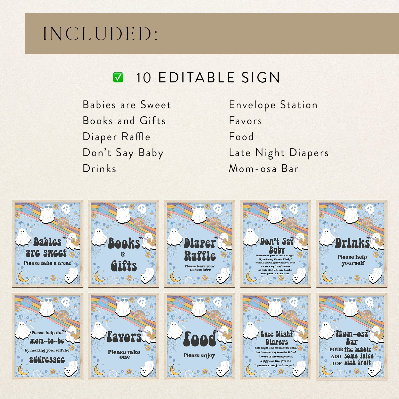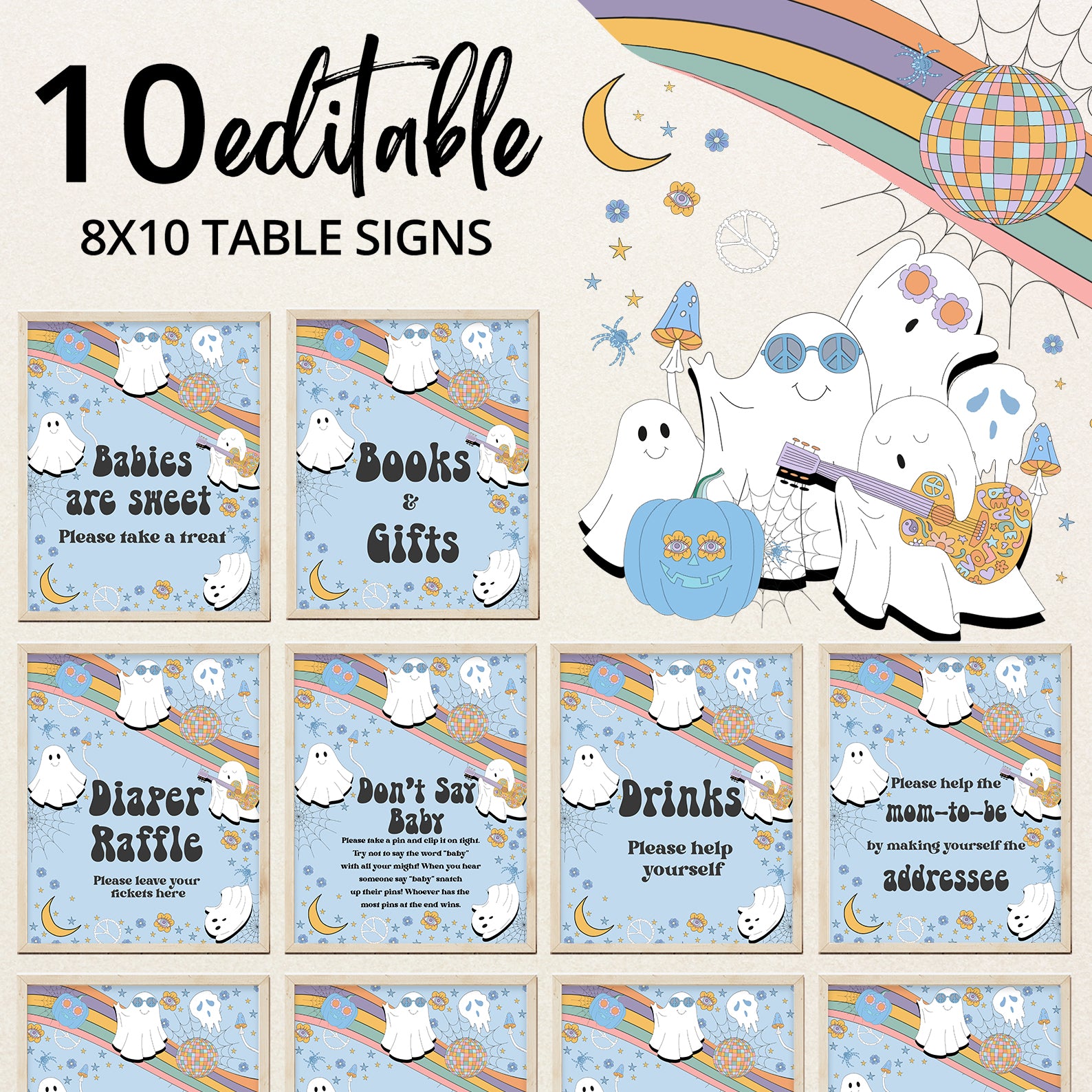 - Purchase this Groovy Blue Baby Shower Table Sign: Spooky Playful Halloween Ghosts template
