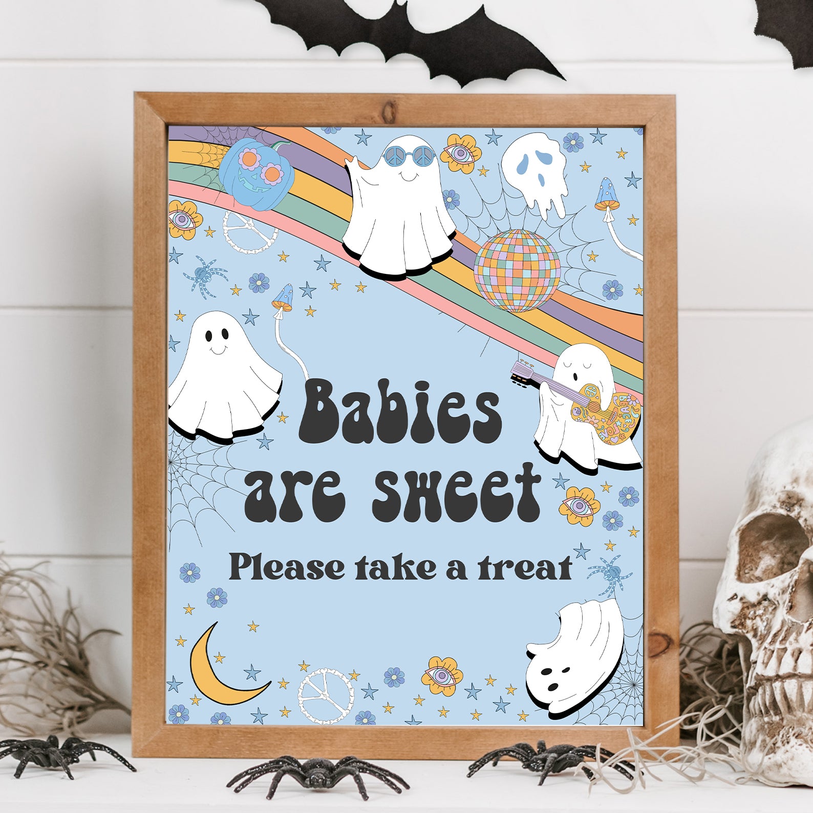 Groovy Blue Baby Shower Table Sign: Spooky Playful Halloween Ghosts