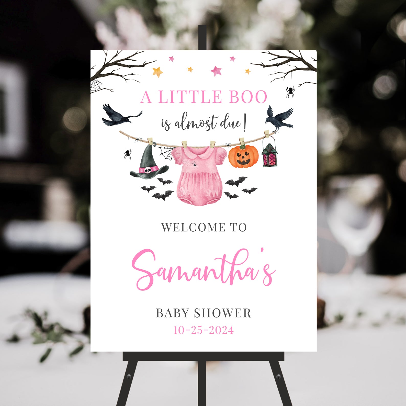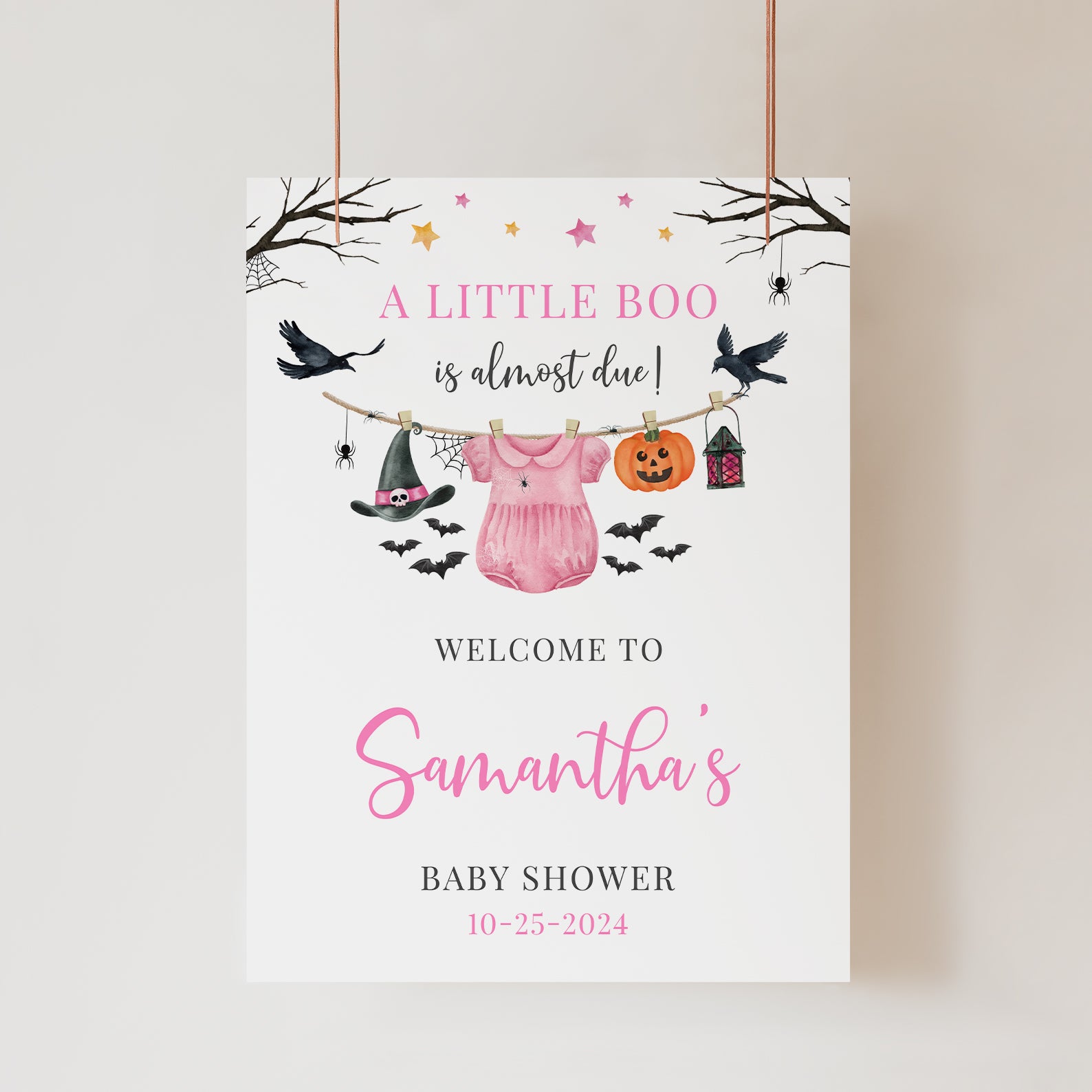 - Purchase this Pink Halloween Baby Shower Welcome Sign: Stars, Crows & Jumpsuit template