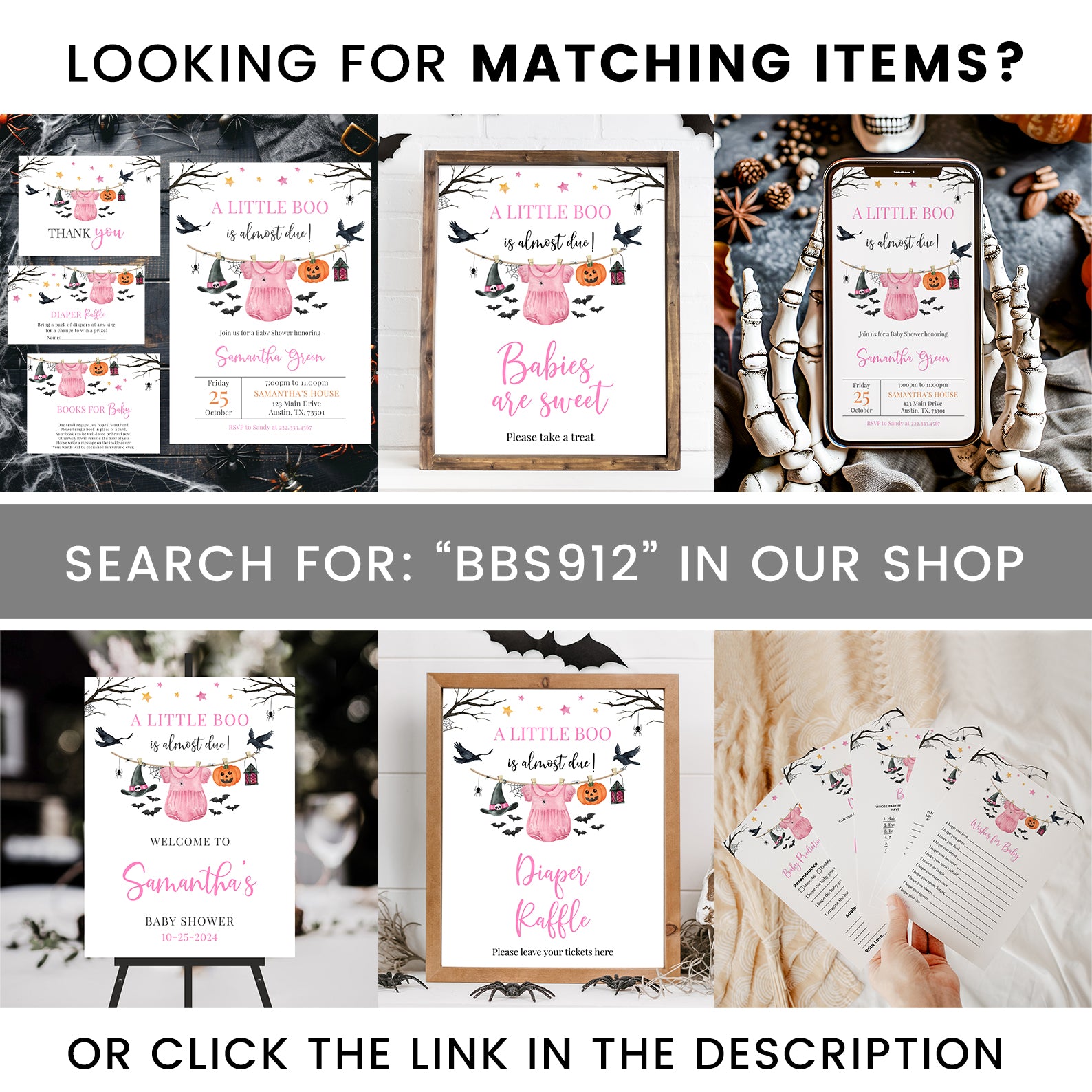Welcome guests in style with our charming Halloween baby shower welcome sign! Available in a choice of pink or blue, this design features whimsical stars, spooky tree branches, and playful Halloween accents like a baby jumpsuit, witch hat, and flying bats. It’s a delightful way to set the mood for your festive celebration!