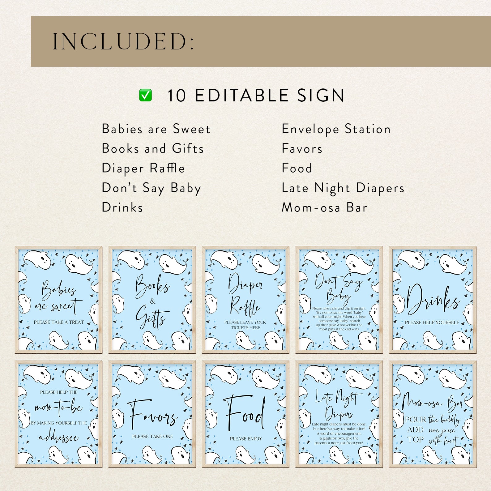 • (1) Babies Are Sweet (2) Books and Gifts (3) Diaper Raffle Sign (4) Don't Say Baby (5) Drinks Sign (6) Envelope Station (7) Favors (8) Food Sign (9) Late Night Diapers (10) Mom-osa Bar