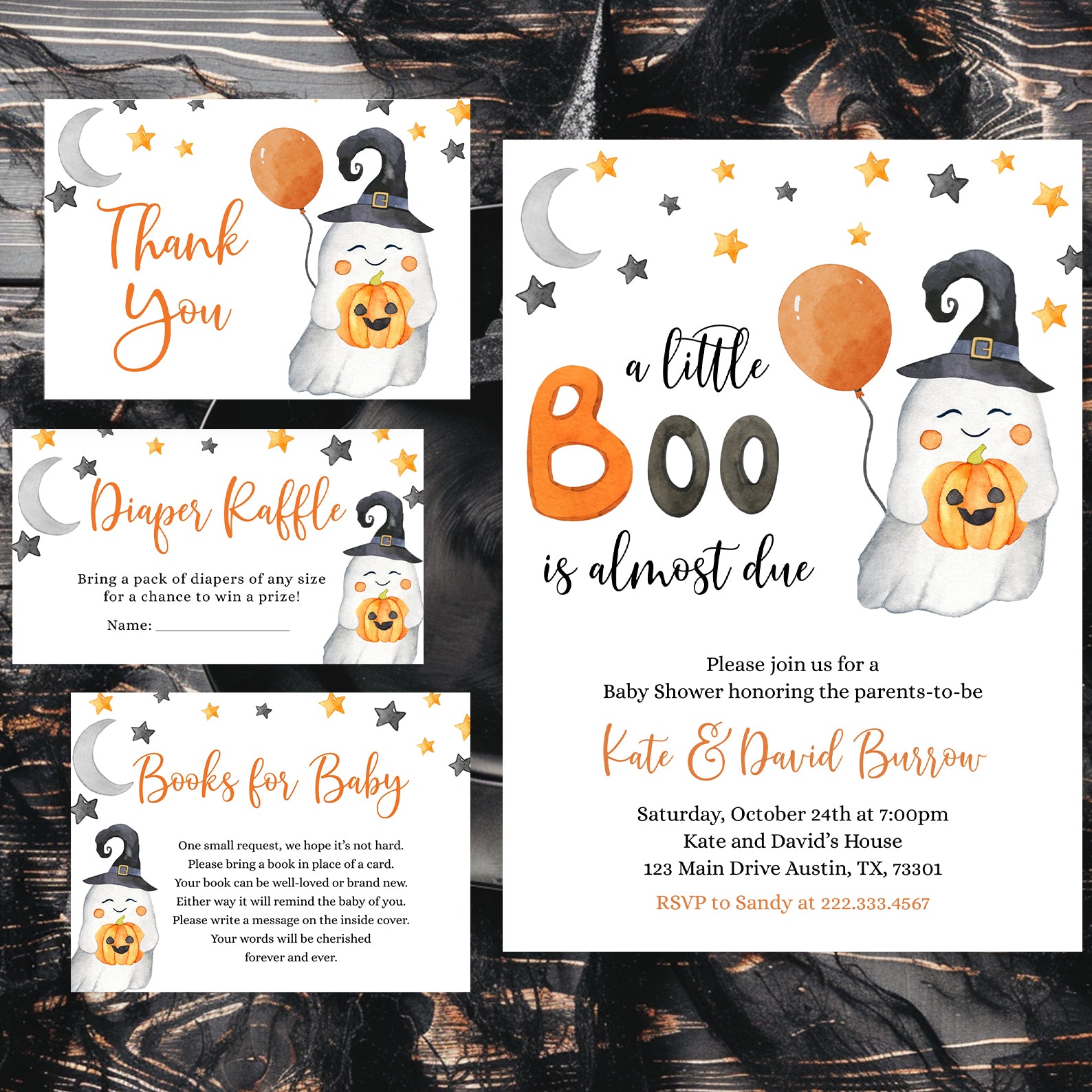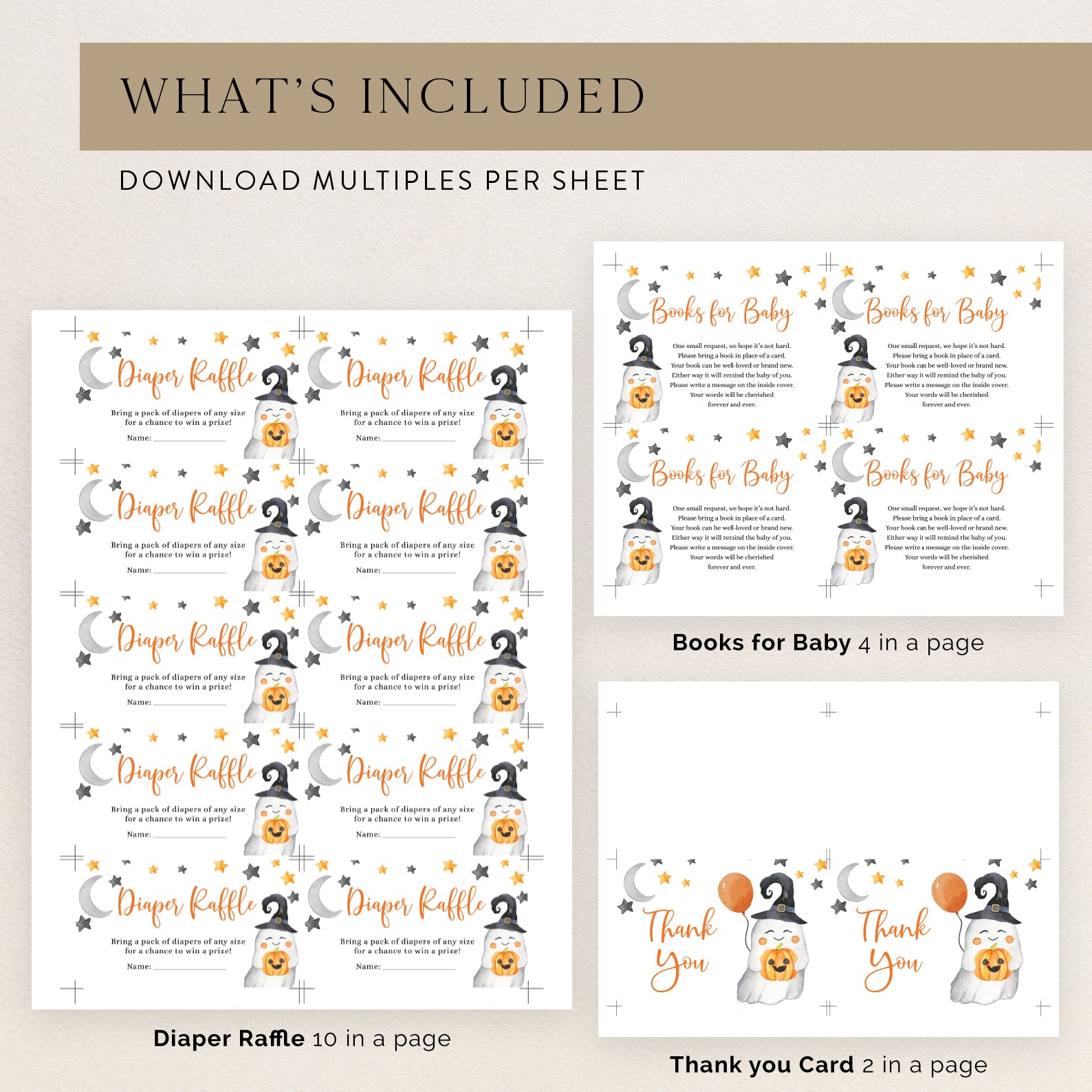 Celebrate your little one’s arrival with our adorable digital baby shower invitation bundle! This festive design features a smiling ghost with a pumpkin and witch hat, set against a backdrop of orange and black stars and a grey half moon. The playful orange balloon adds a vibrant touch to the white background, perfect for a Halloween-themed baby shower. This bundle includes invitations, mobile invites, a diaper raffle, books for baby, and thank you cards to make your event truly special.