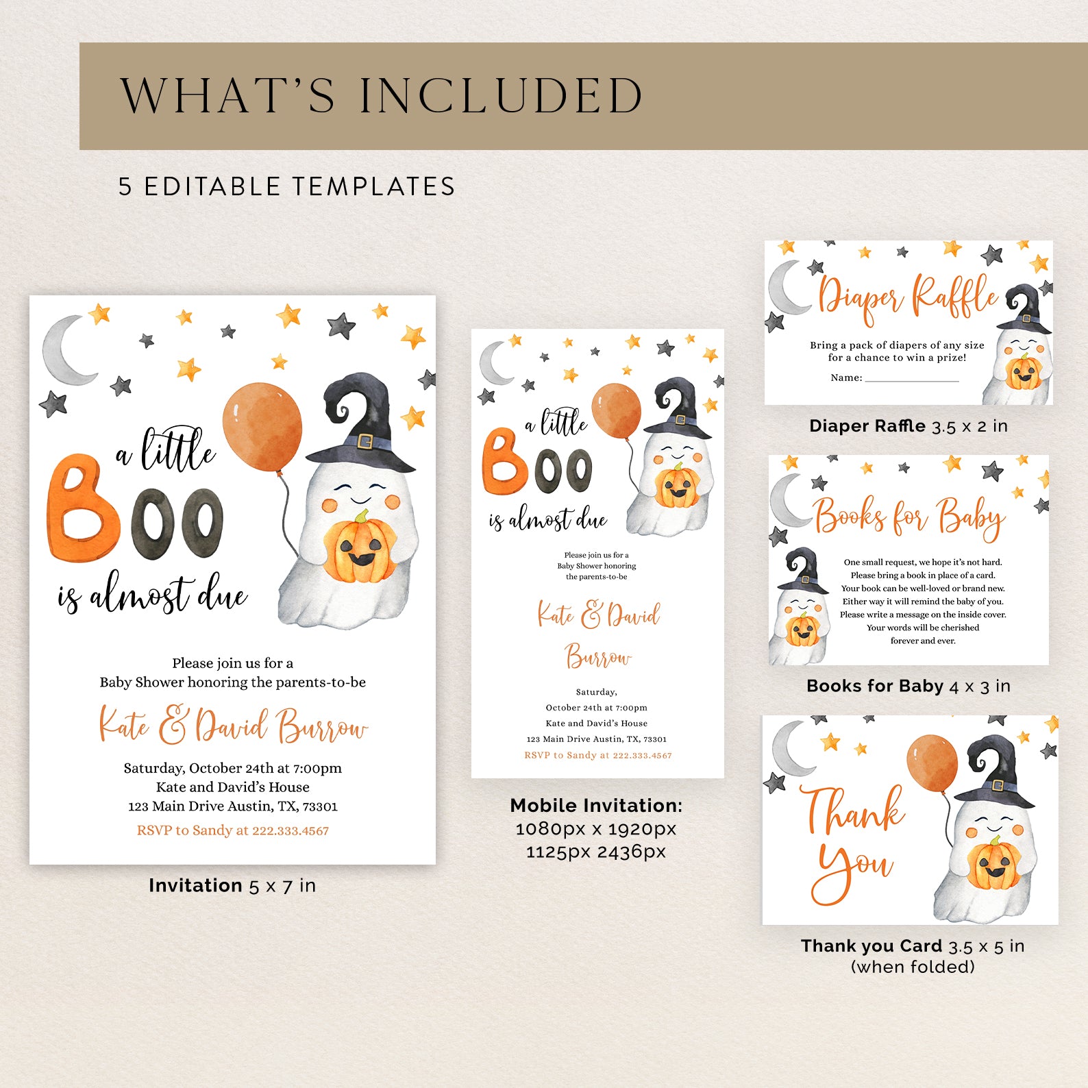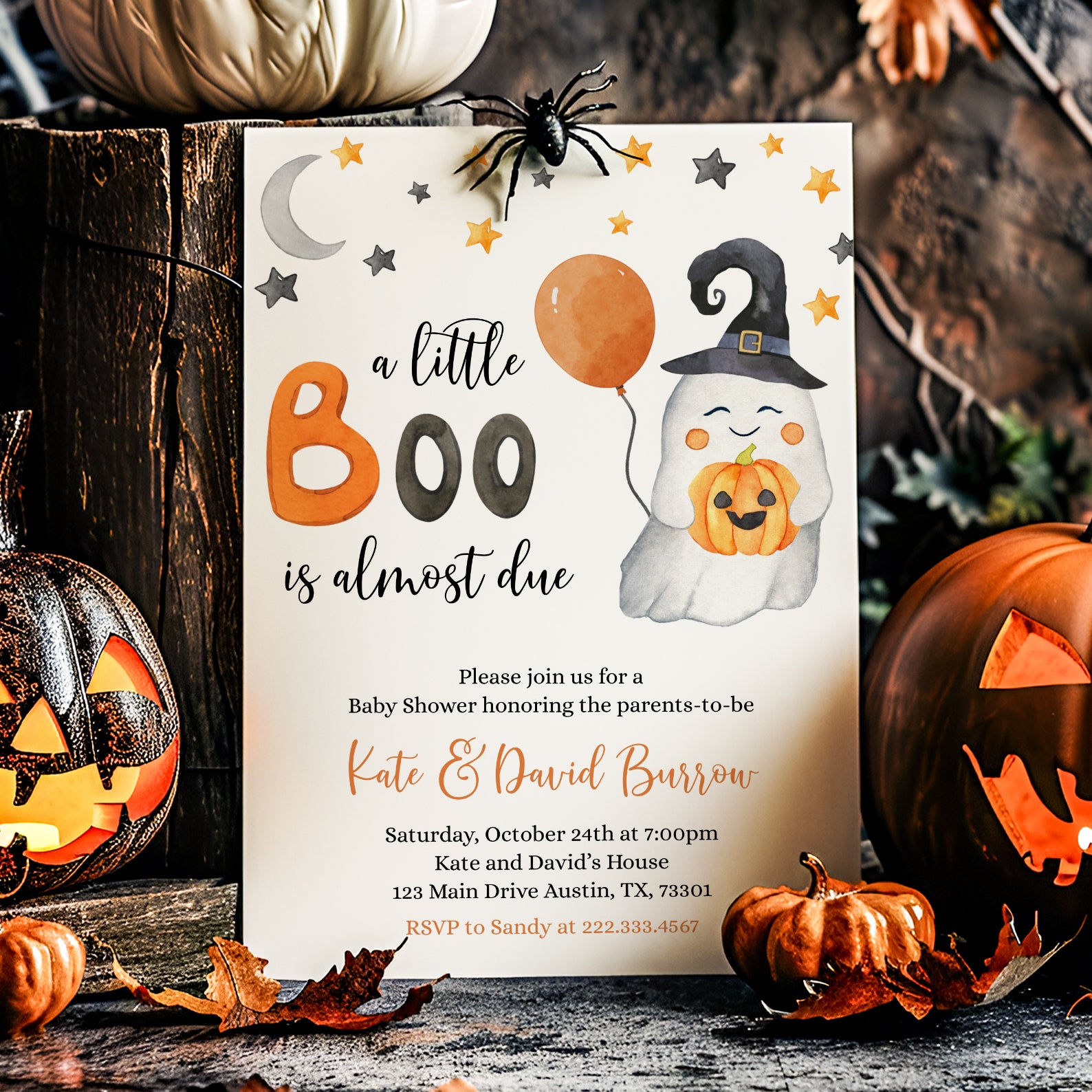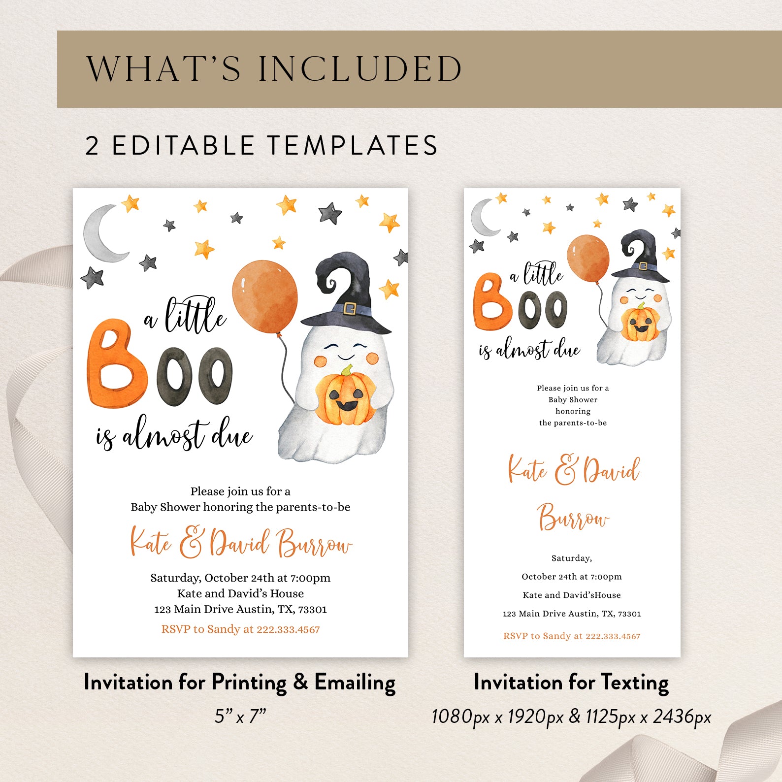 - Purchase this Sweet Baby Shower Digital Invite Bundle: A Little Boo is Almost Due! template