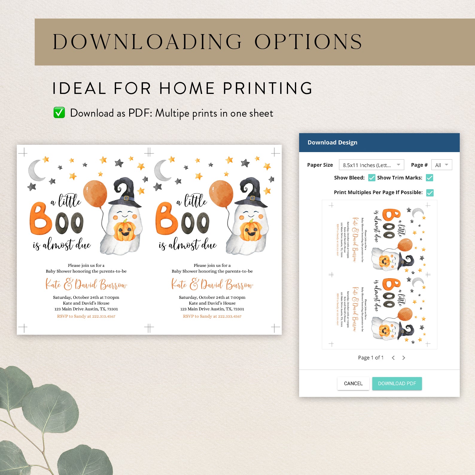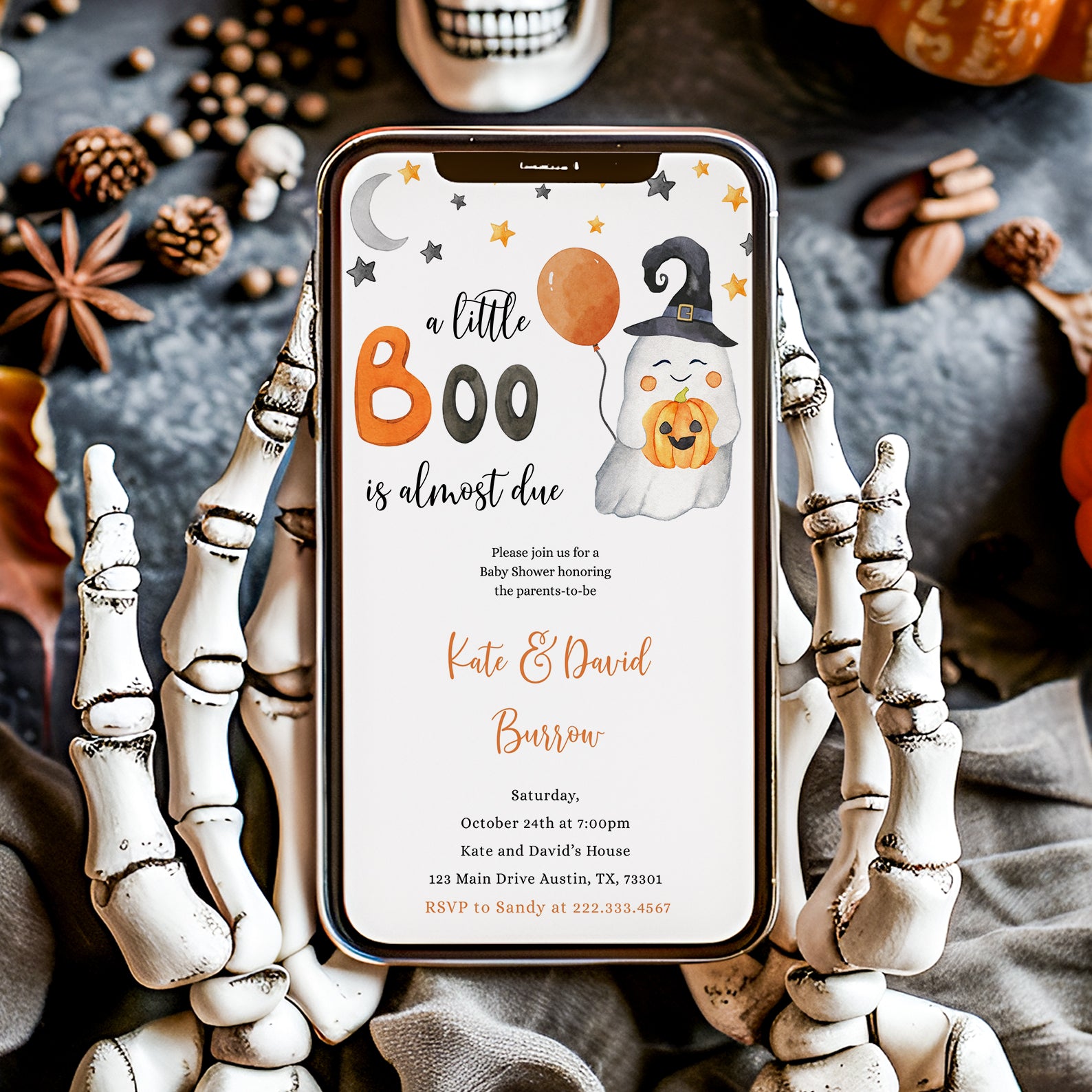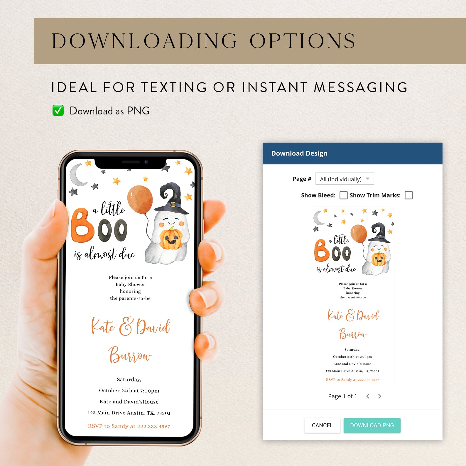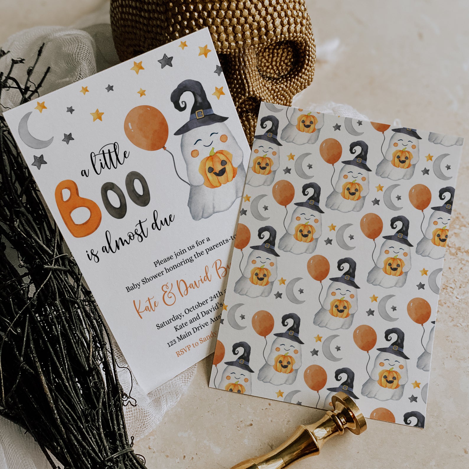- Purchase this Sweet Baby Shower Digital Invite Bundle: A Little Boo is Almost Due! template