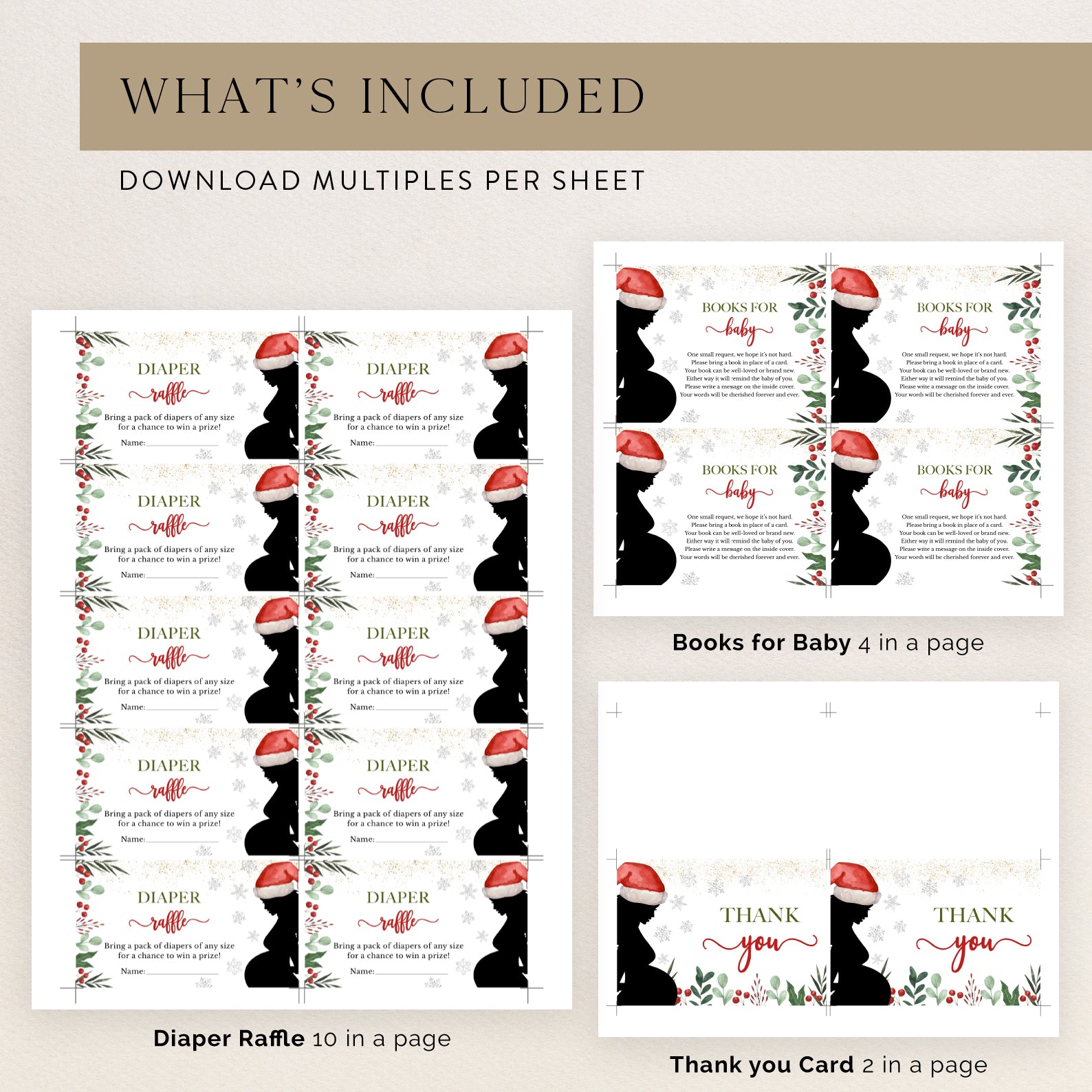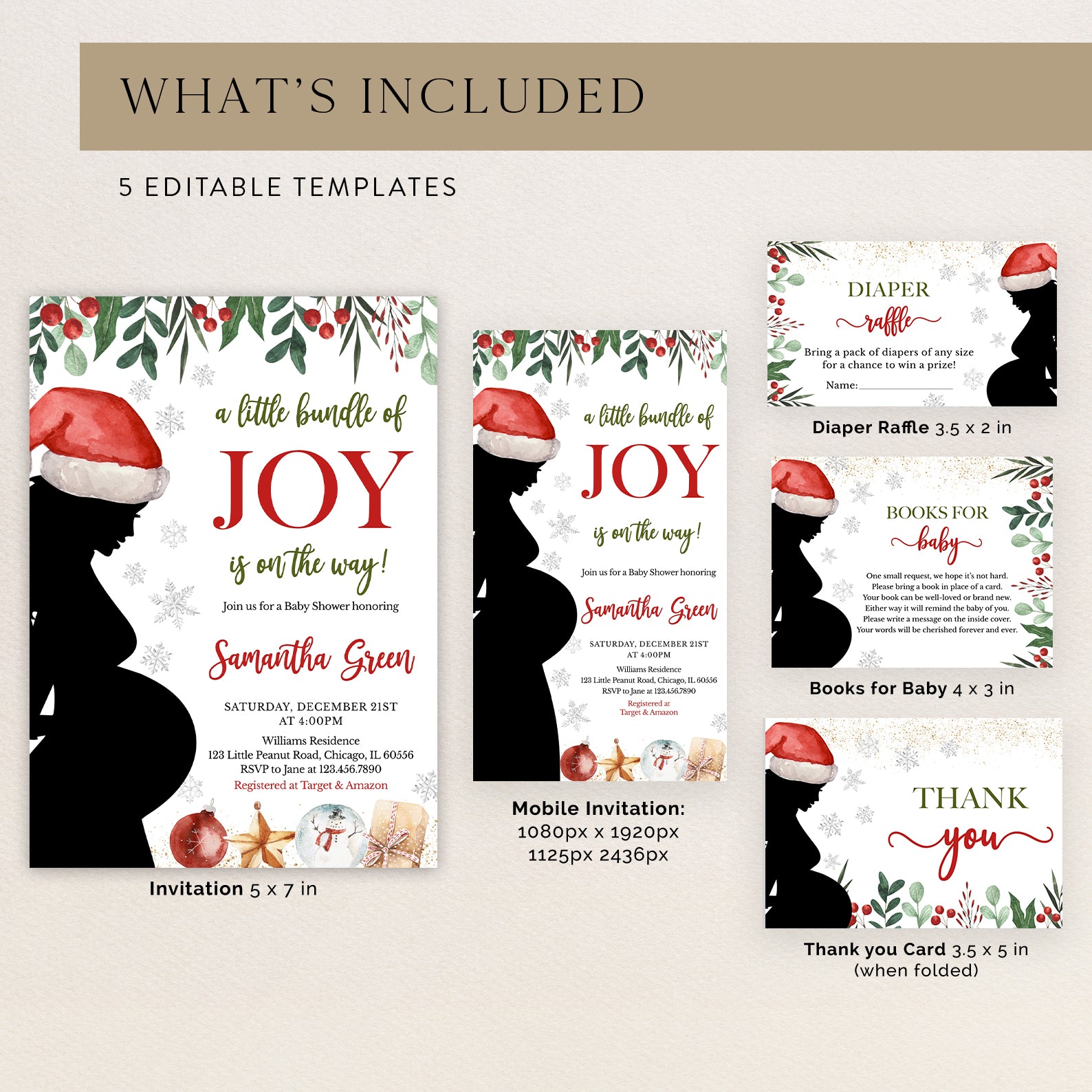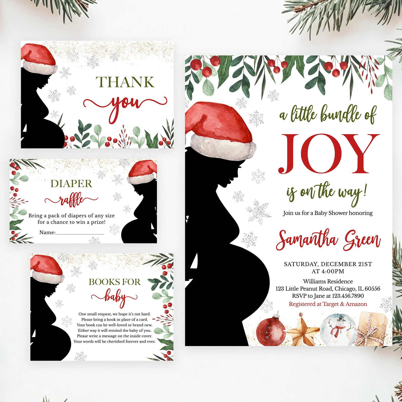 Get ready to celebrate your little one with our winter baby shower invitation bundle! This charming collection includes a digital invitation, mobile invite, diaper raffle, books for baby cards, and thank you cards. Featuring a festive green leaves border and an illustration of a pregnant woman in a Santa hat, this bundle beautifully captures the holiday spirit. With falling silver snowflakes and whimsical Christmas decorations, it's the perfect way to invite friends and family to your joyful winter gathering!