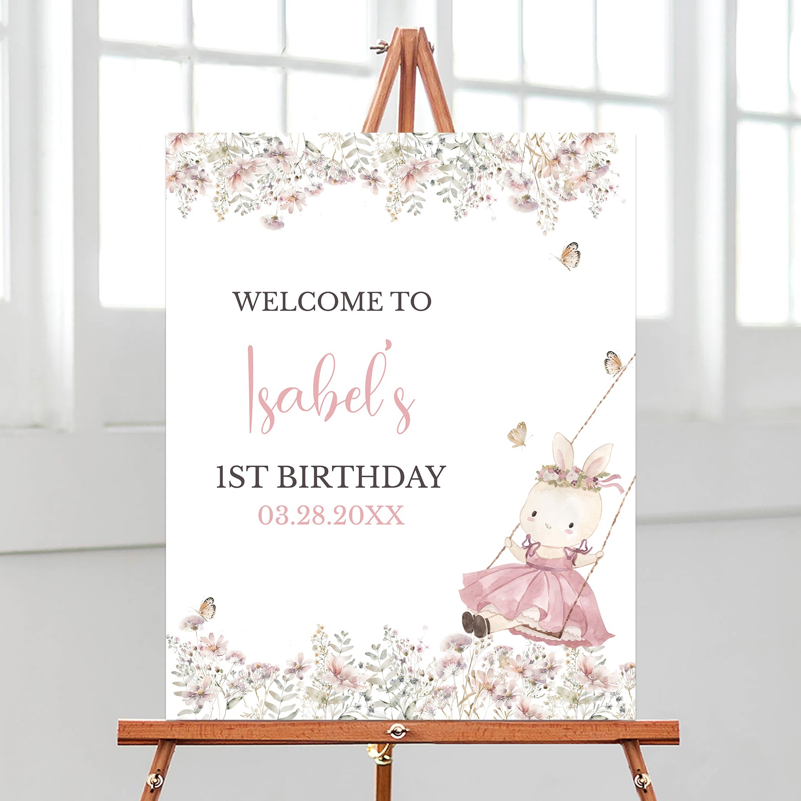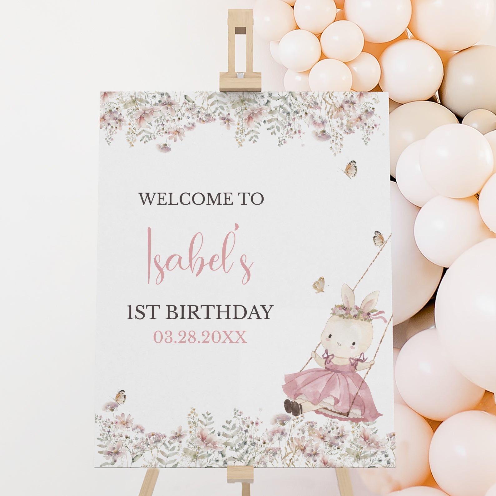 Welcome guests to a magical first birthday celebration with this charming spring-themed welcome sign! Designed in a soft pink palette, it features a whimsical bunny in a flowing pink dress, joyfully swinging amidst blooming florals and fluttering butterflies. This enchanting design sets the perfect tone for a delightful gathering, creating a warm and inviting atmosphere for friends and family. Celebrate your little one's special milestone with a touch of springtime magic!