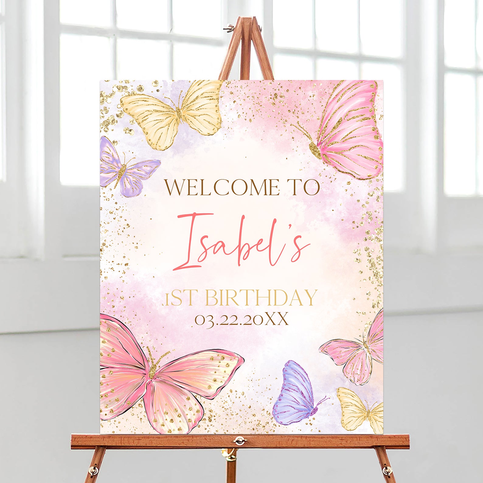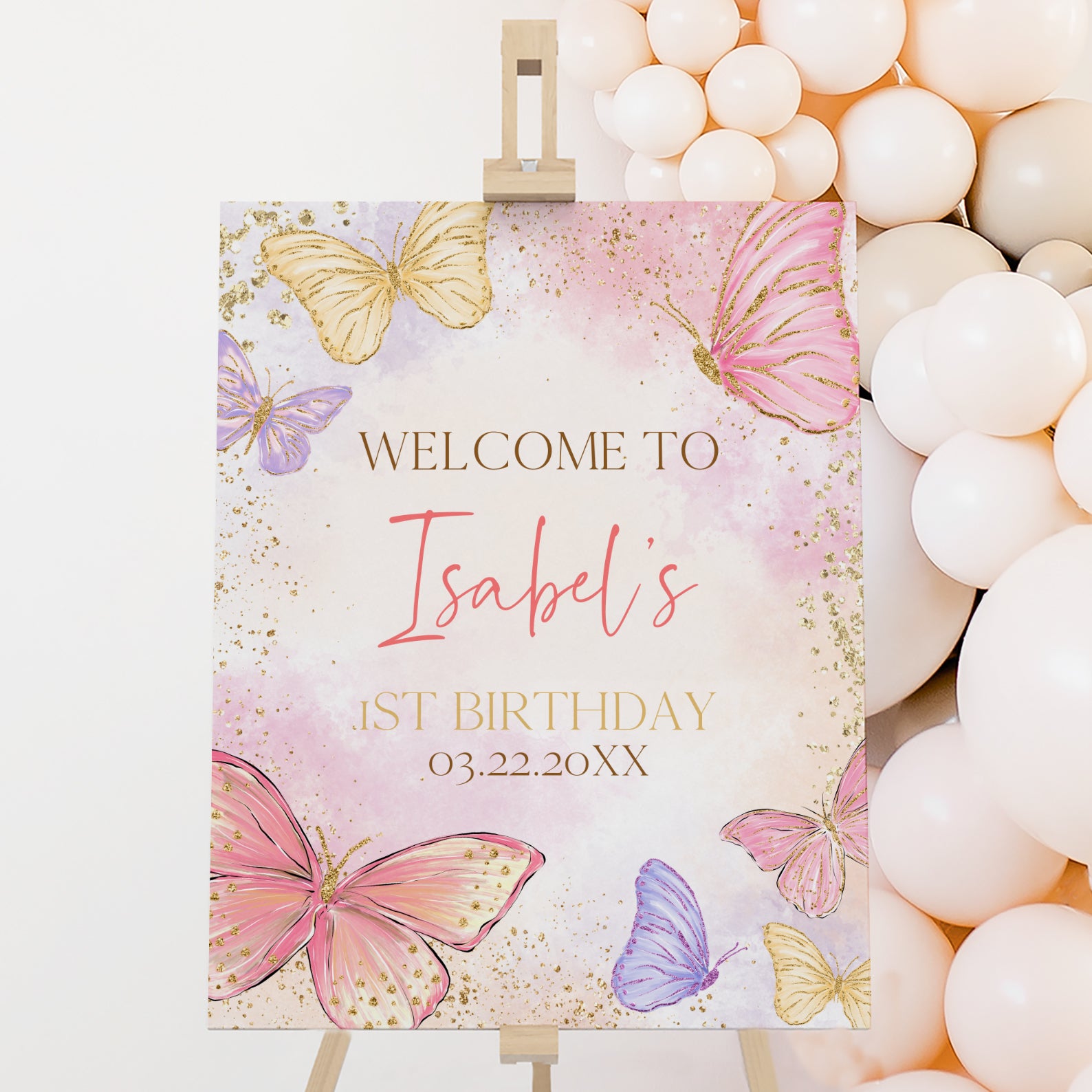 Welcome guests to your little one's first birthday with this enchanting butterfly-themed welcome sign! Featuring a soft watercolor background, delicate flying butterflies, and elegant gold accents, this design sets the perfect tone for a magical spring celebration. Whether displayed at the entrance or as part of your party décor, this charming sign adds a whimsical touch, inviting friends and family to a joyful and unforgettable celebration.