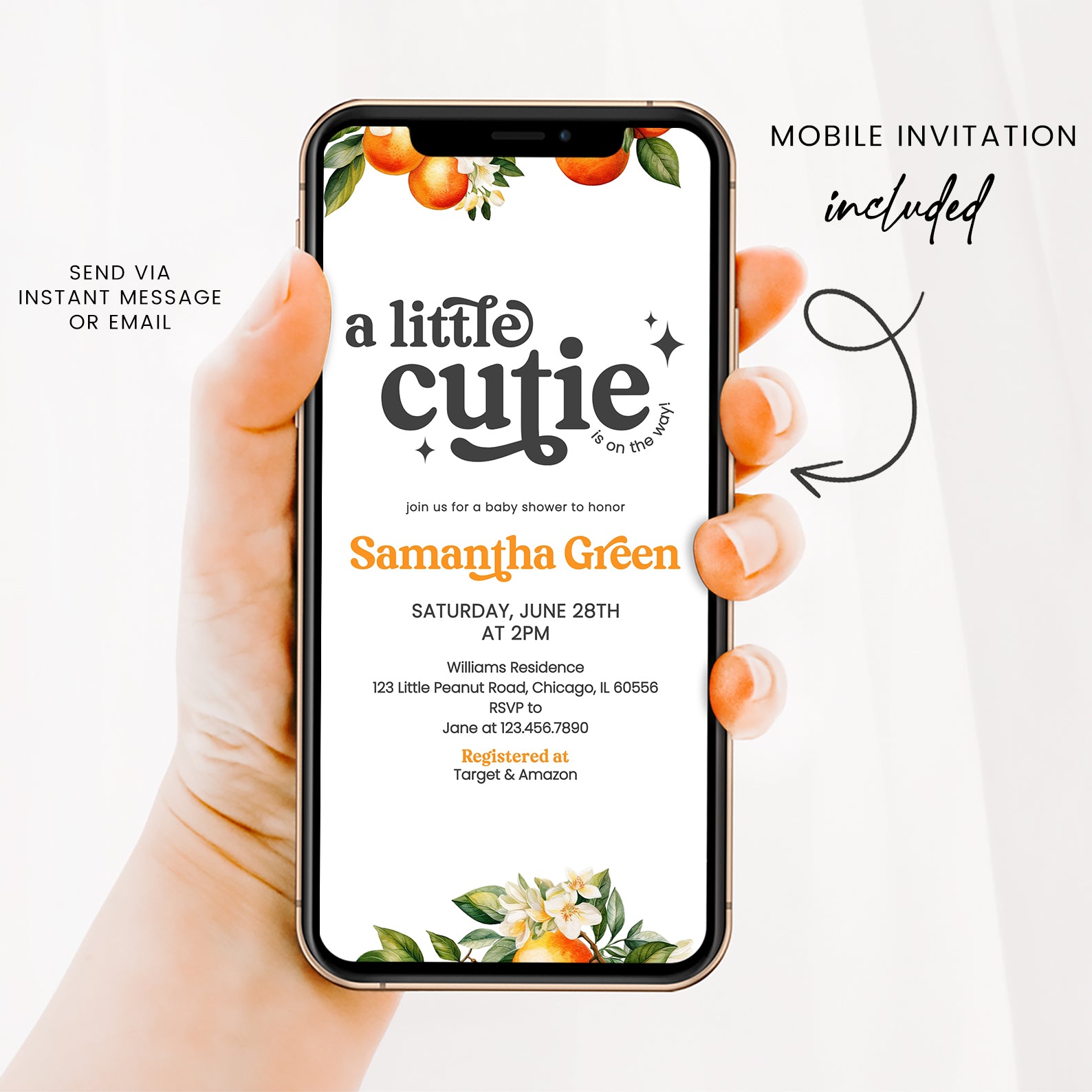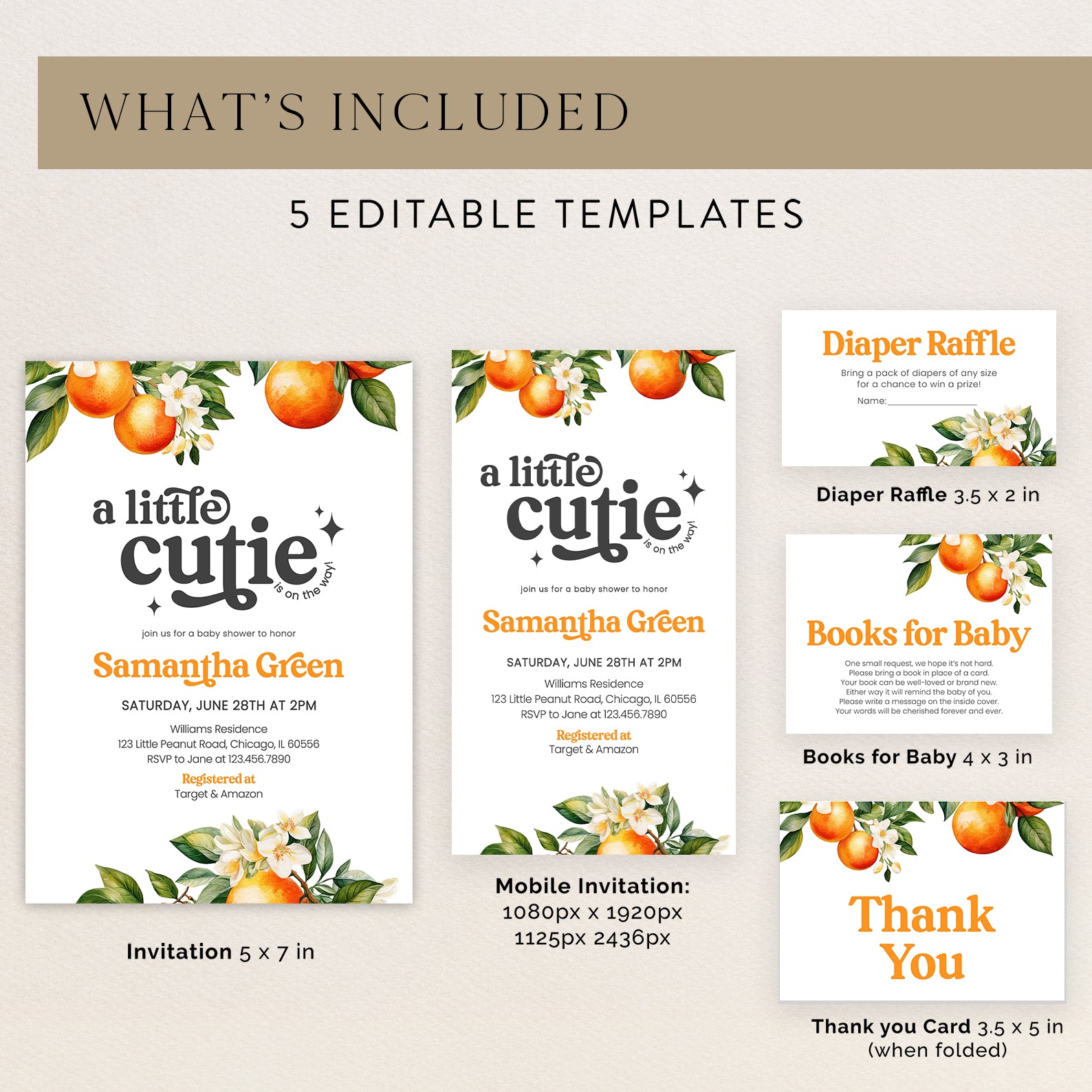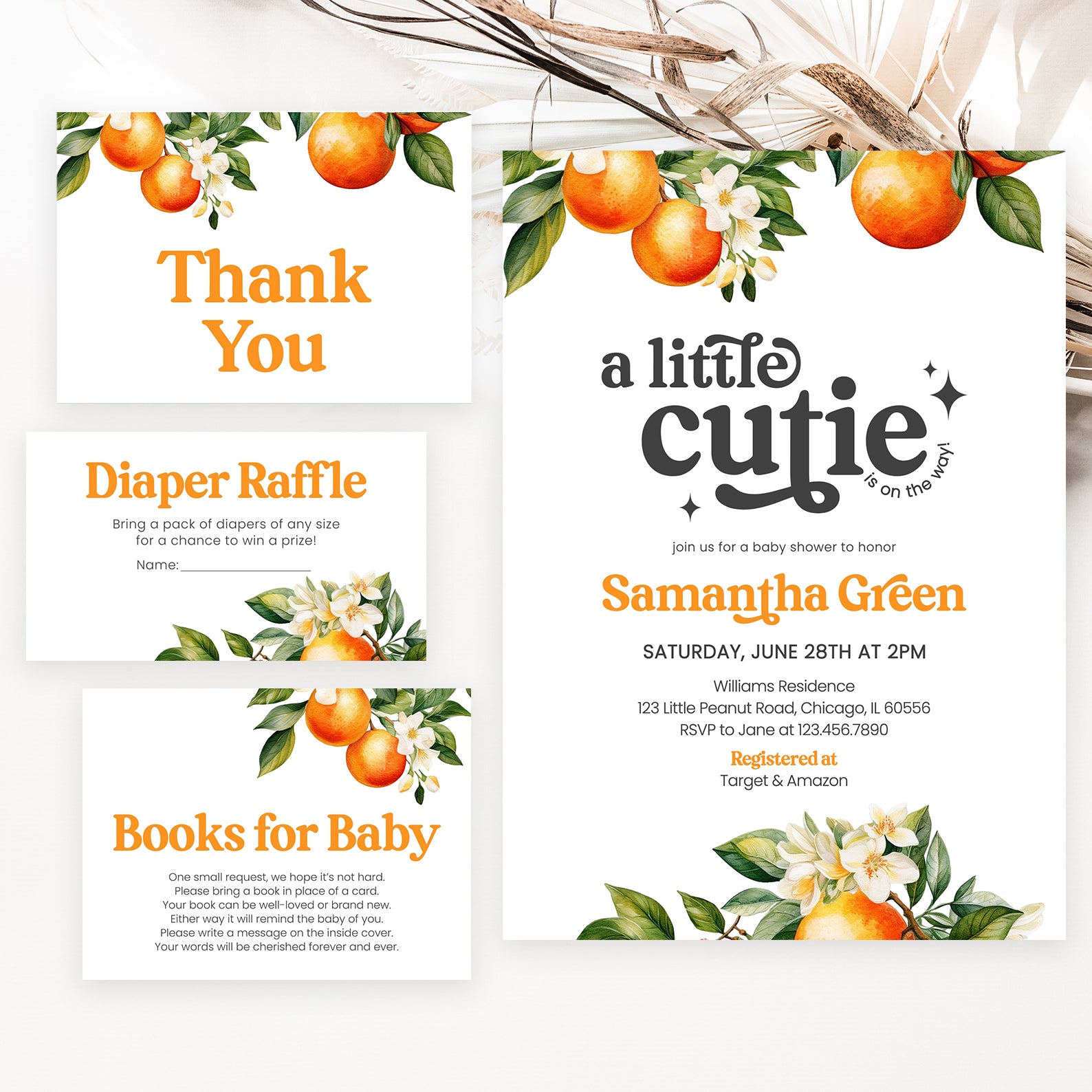 Celebrate your little cutie with our charming summer baby shower digital invitation bundle. Featuring vibrant oranges, orange flowers, and green leaves, this design brings a joyful, warm vibe to your celebration. The bundle includes the invitation, mobile invite, diaper raffle, books for baby sign, and thank you card—all customizable and easy to share. Make your baby shower unforgettable with this fresh and fun set!