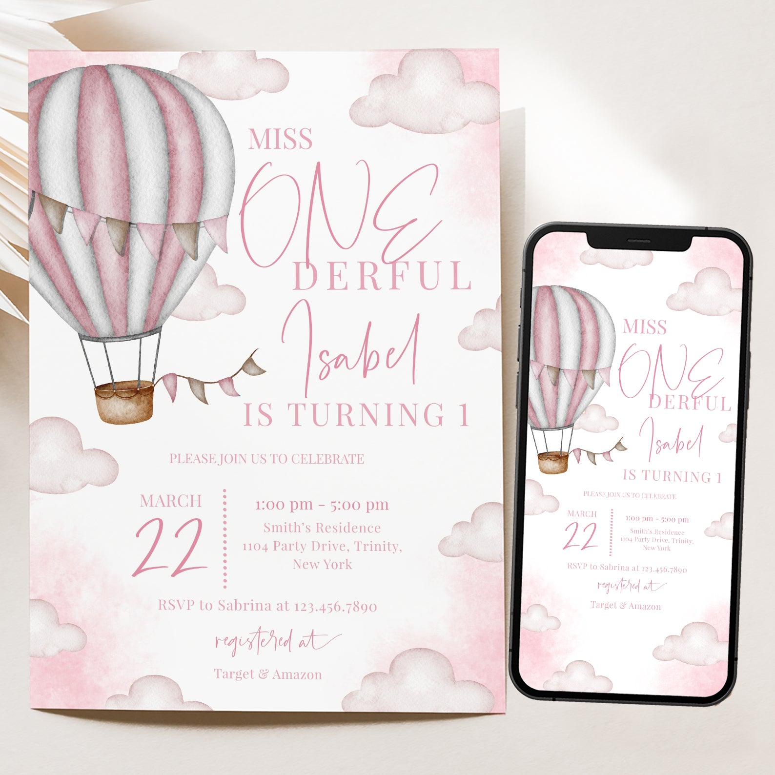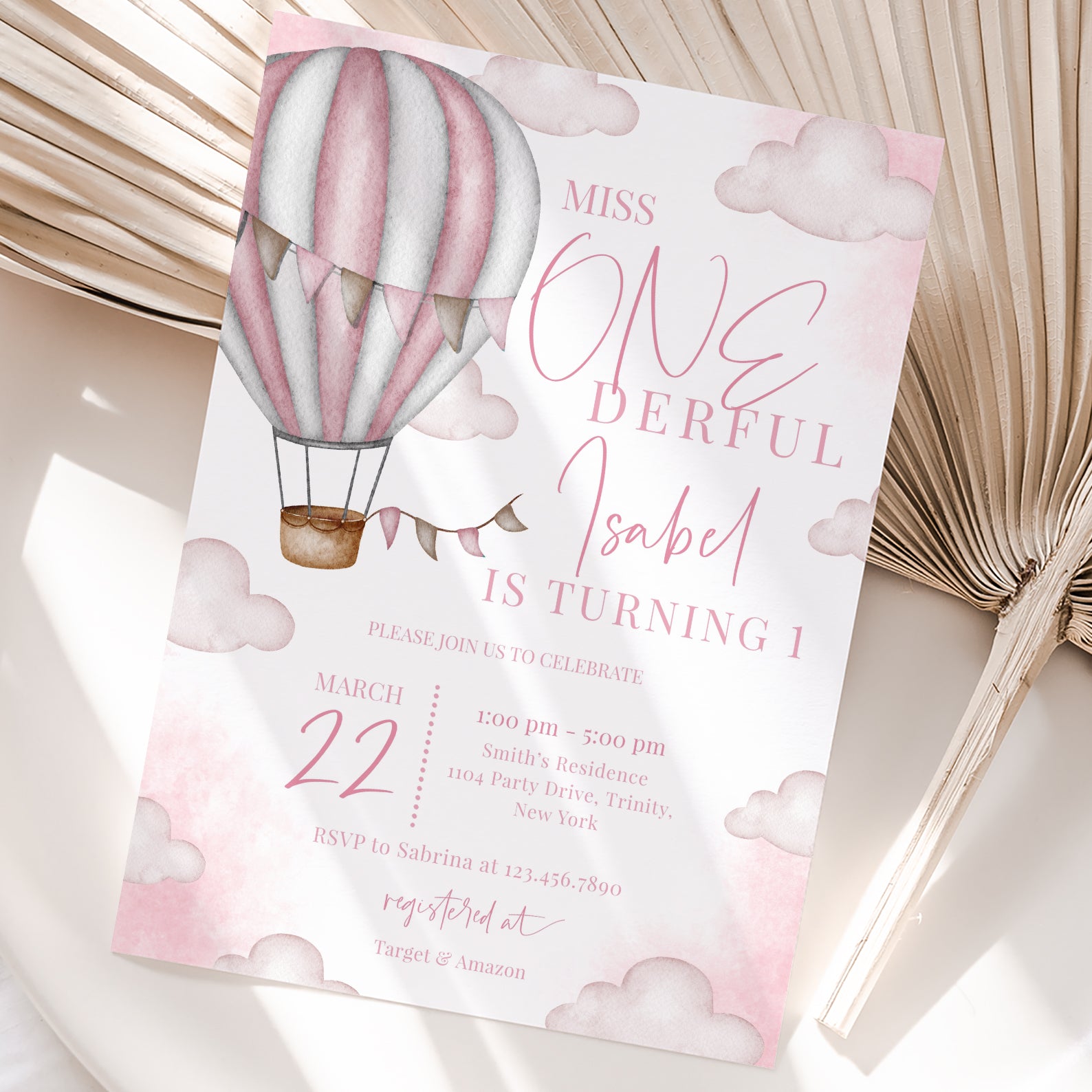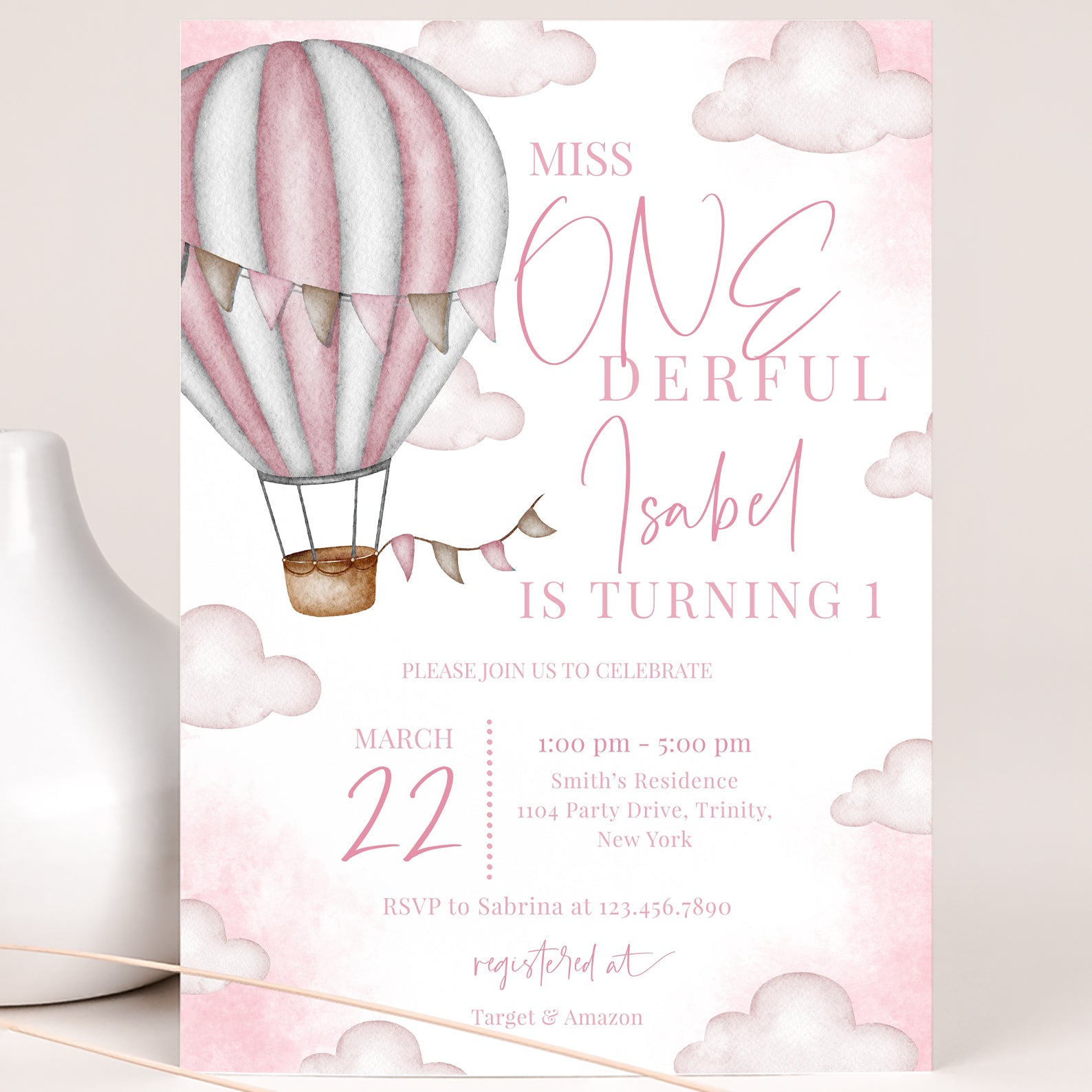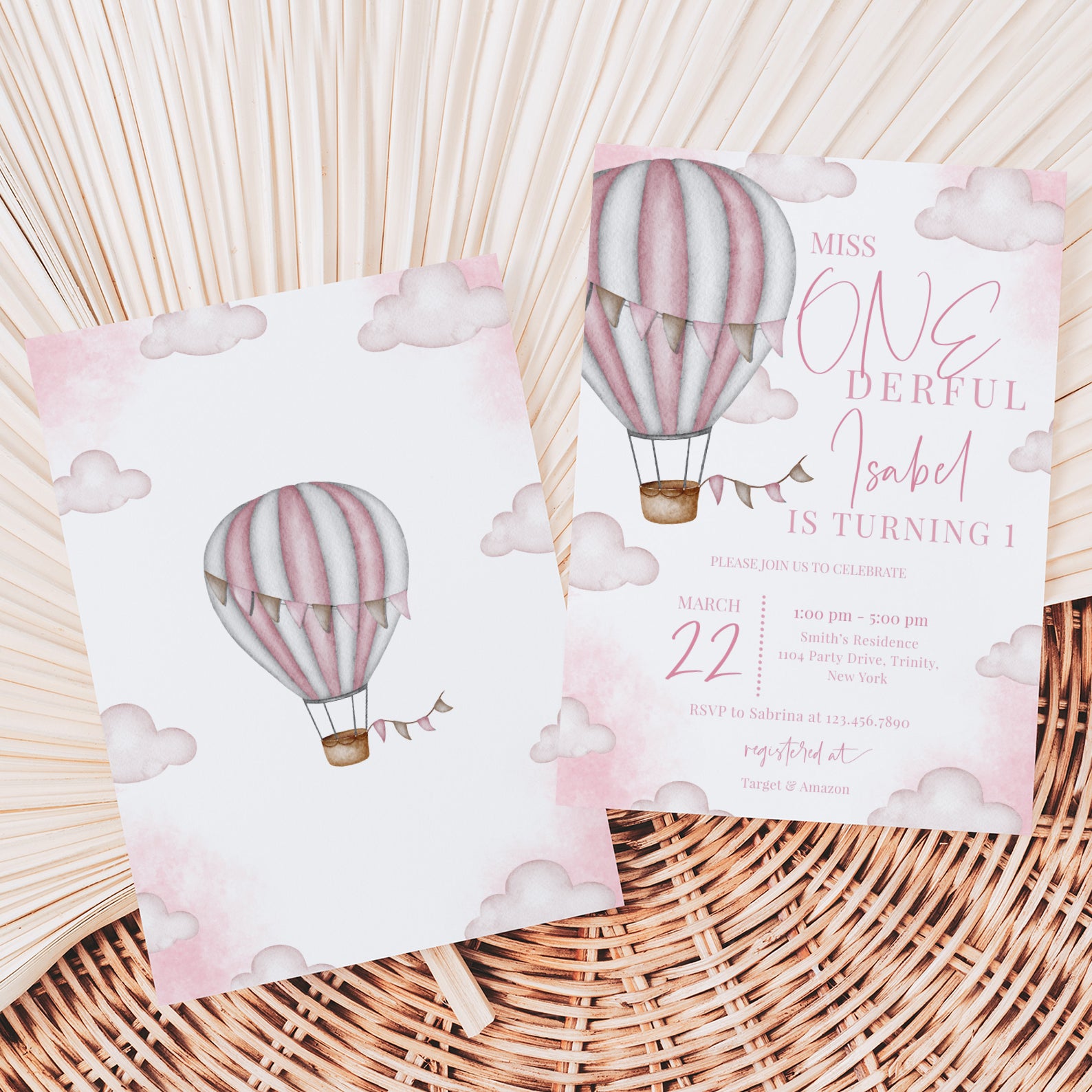 - Purchase this Onederful Birthday Invite: Pink Hot Air Balloon Theme template