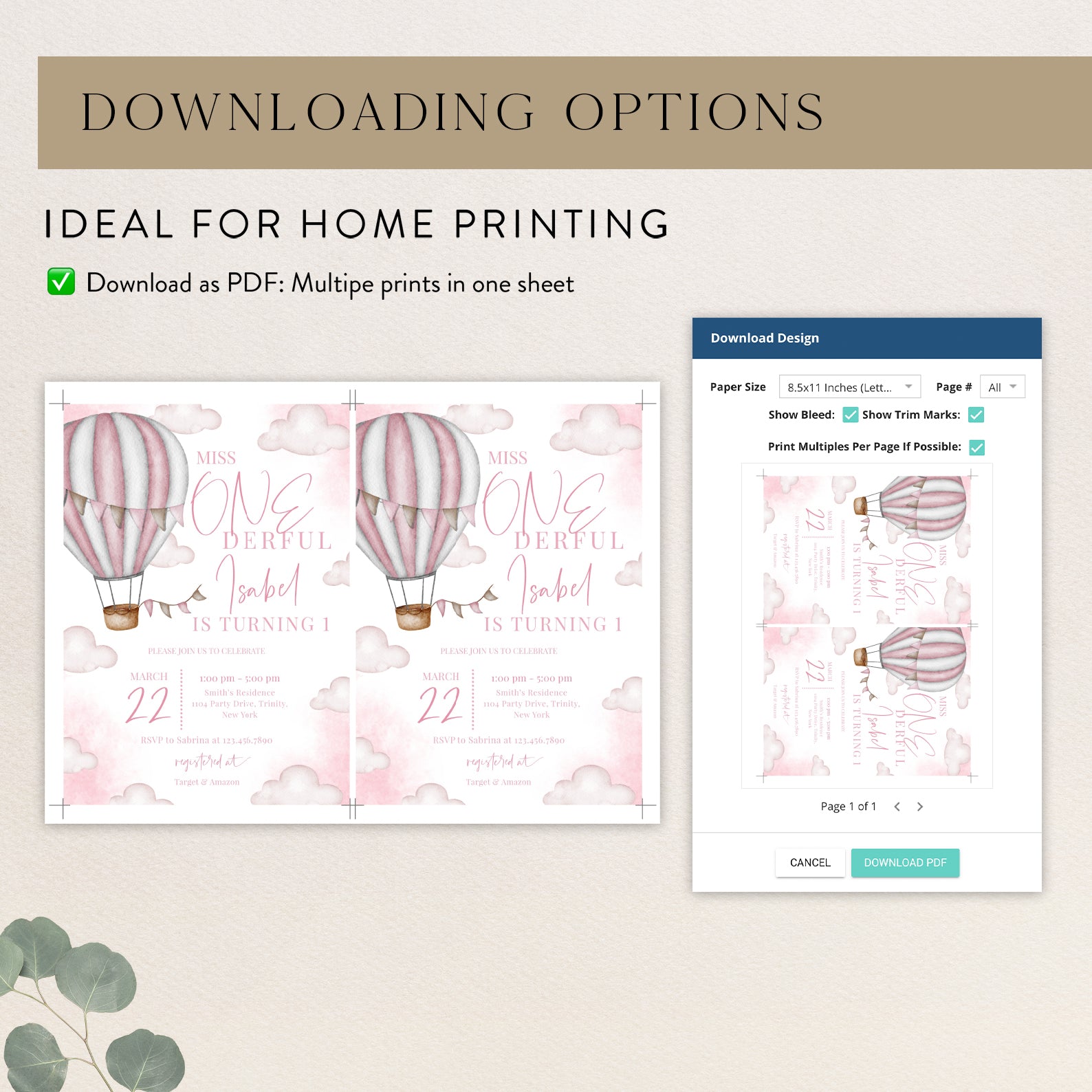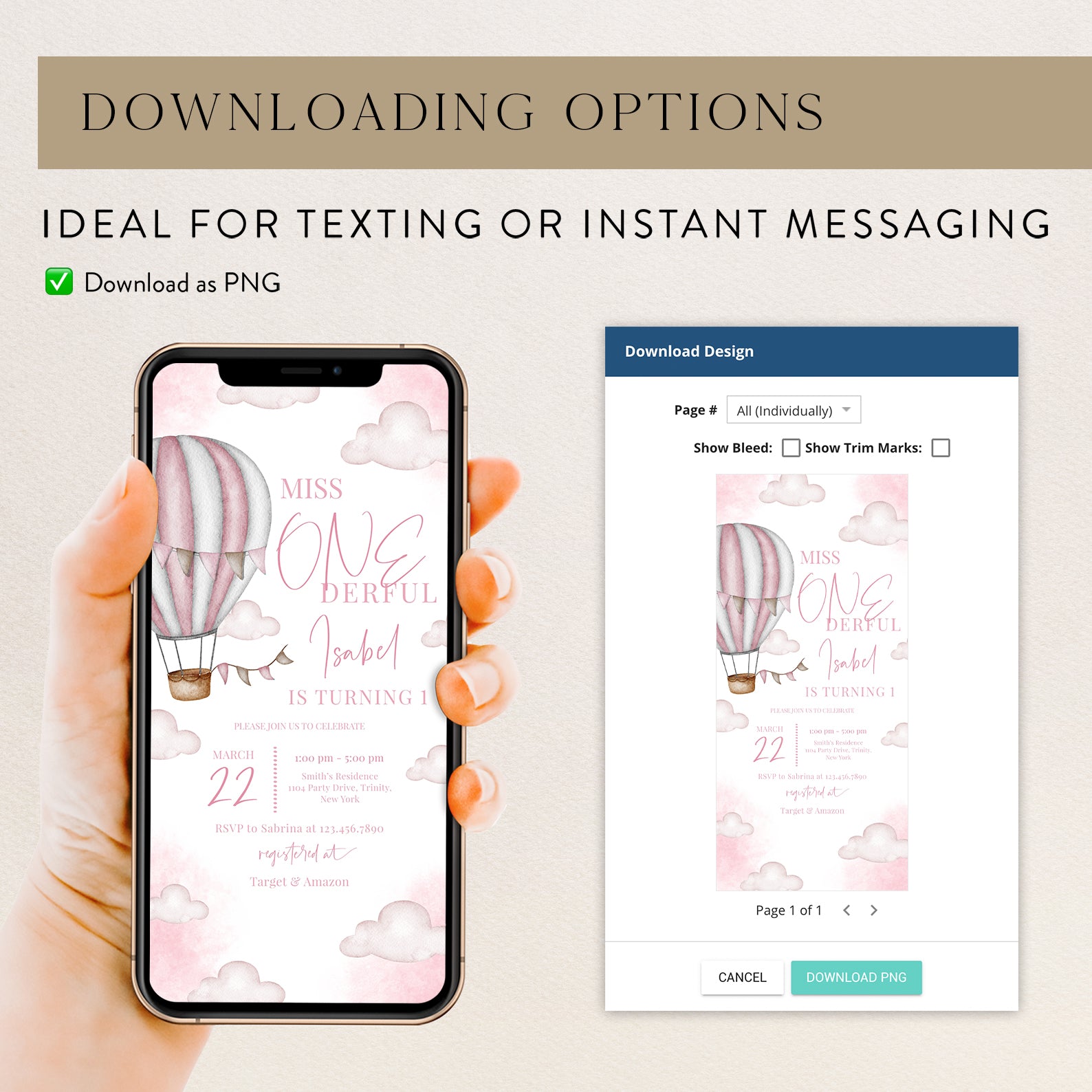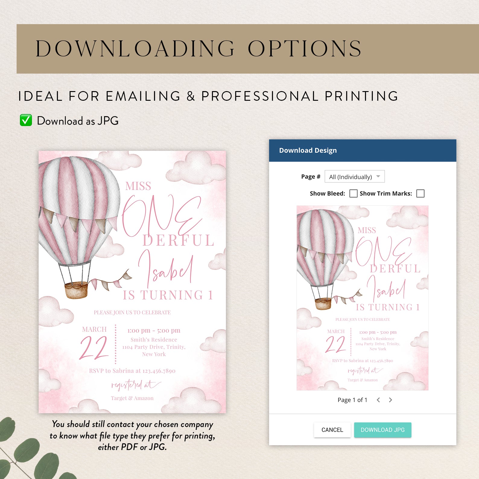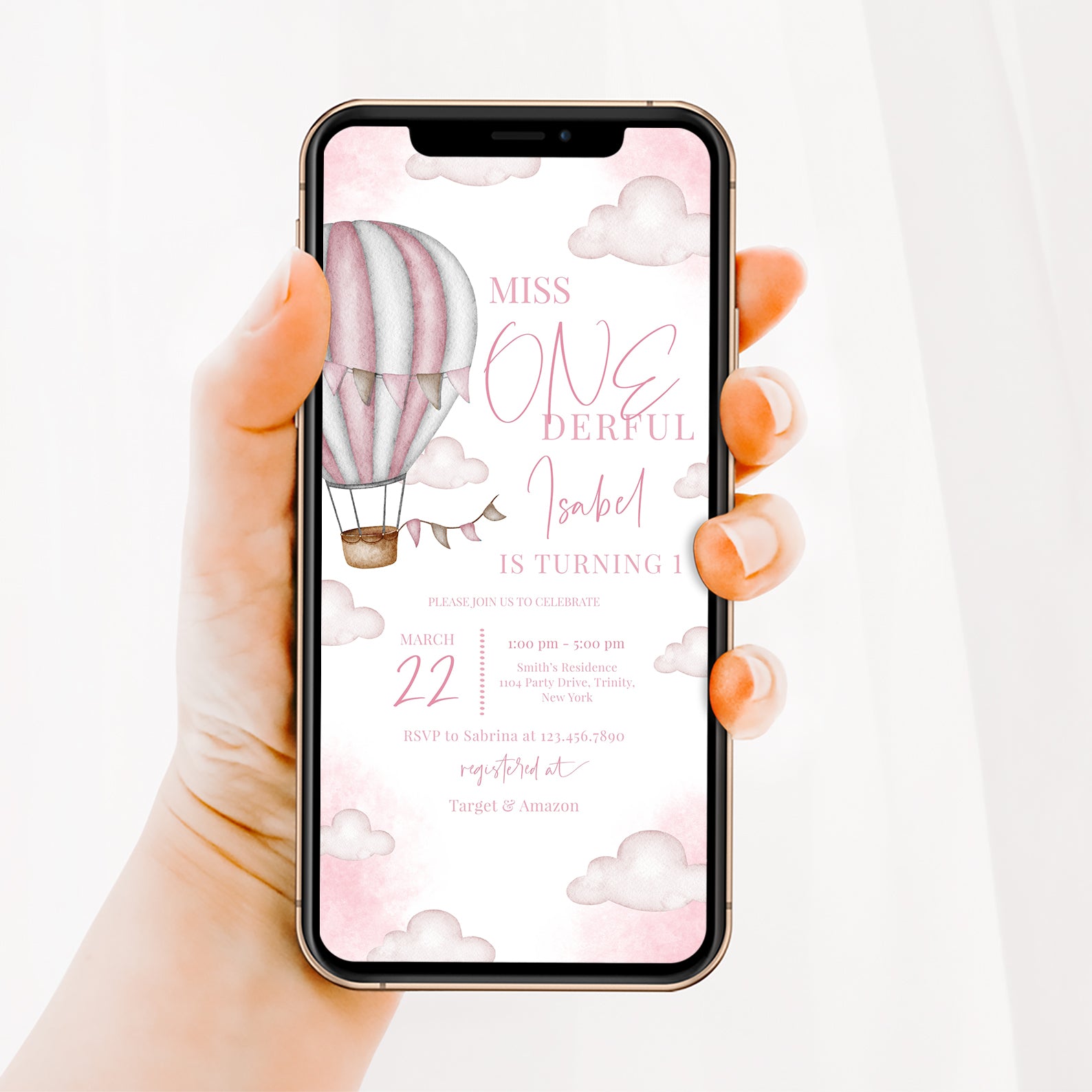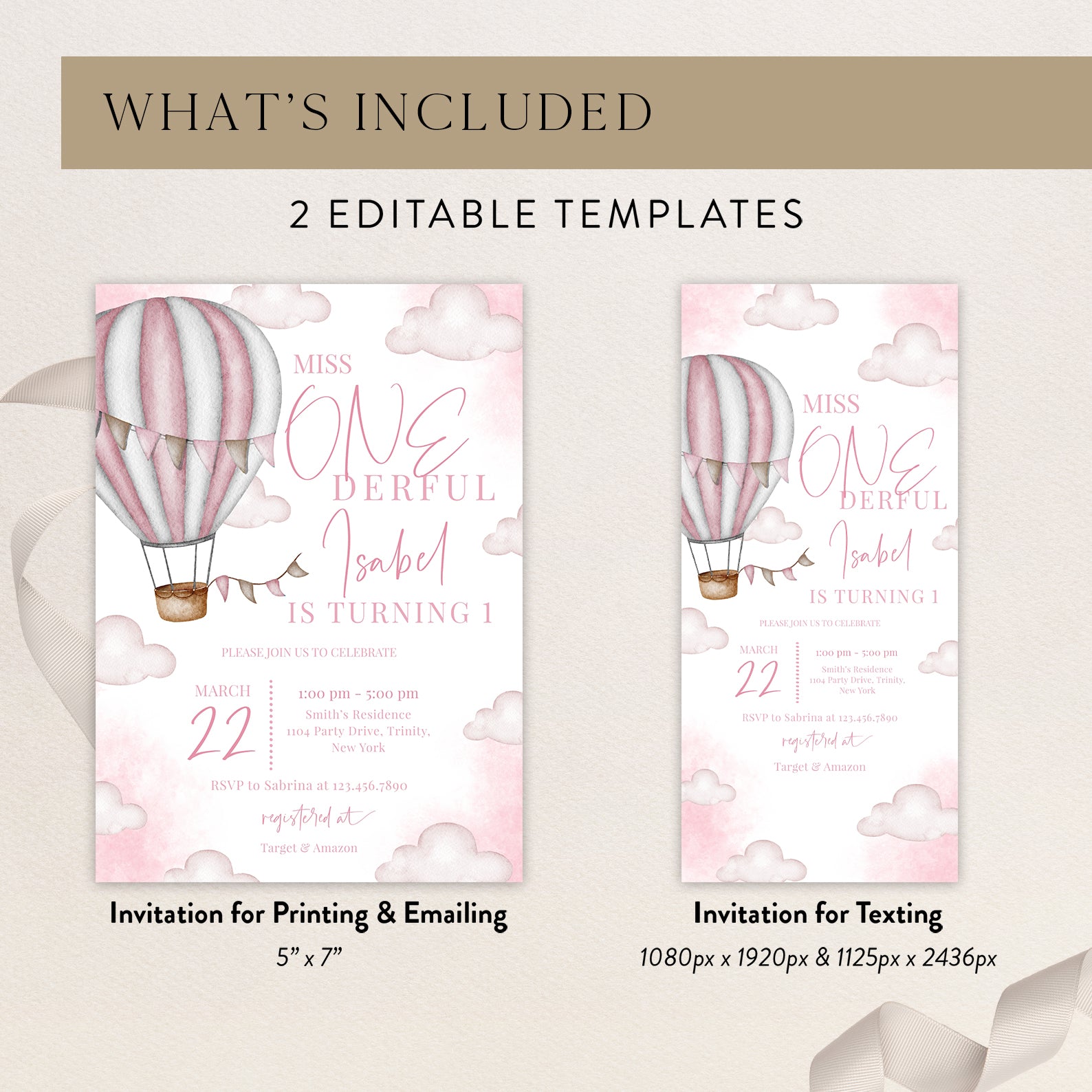 - Purchase this Onederful Birthday Invite: Pink Hot Air Balloon Theme template