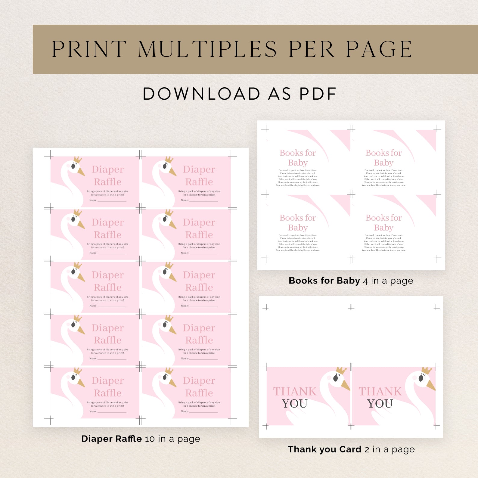 Celebrate your little princess in style with this elegant baby shower invitation bundle. Designed in a pink and gold theme, it features a graceful swan with a gold crown and beak on a soft pink background. This set includes a printable invitation, mobile version, diaper raffle, books for baby card, and thank you card everything you need to make your royal celebration charming and cohesive.
