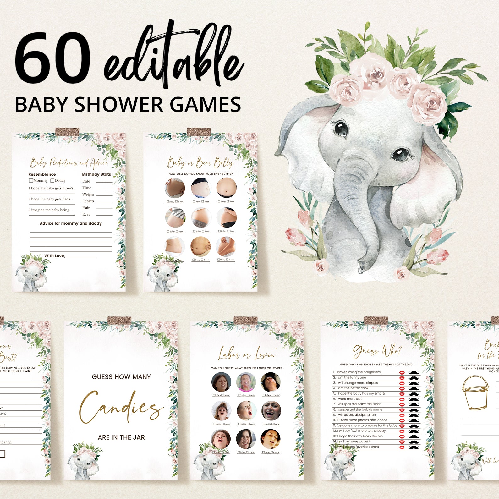 Make your celebration fun and unforgettable with our elephant and roses baby shower game bundle. Featuring greenery, soft florals, and an adorable elephant, this set includes 60 editable baby shower games to entertain guests throughout the day. With a mix of classic favorites and modern designs, this bundle ensures endless laughter and excitement while beautifully matching your pink or blue floral elephant theme.