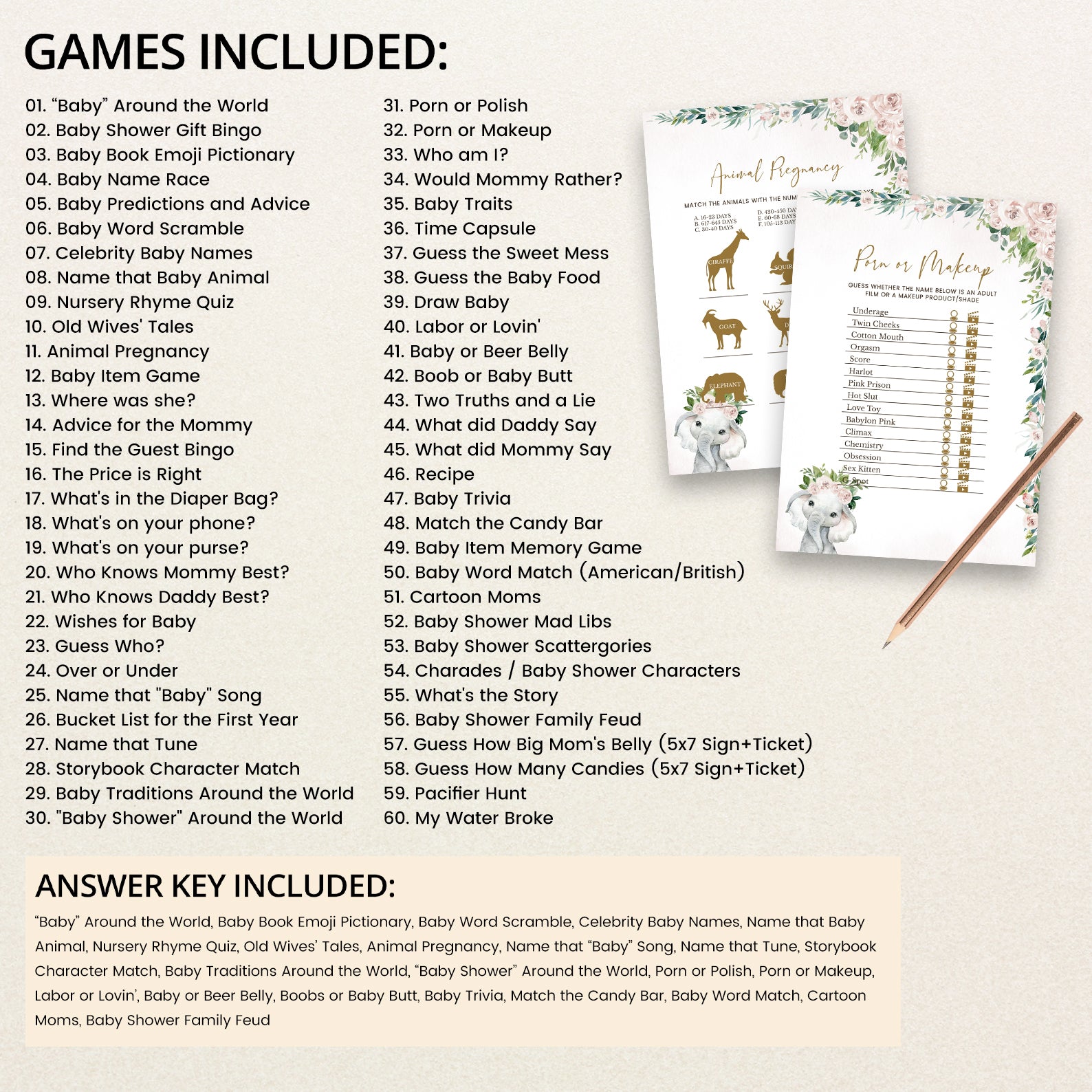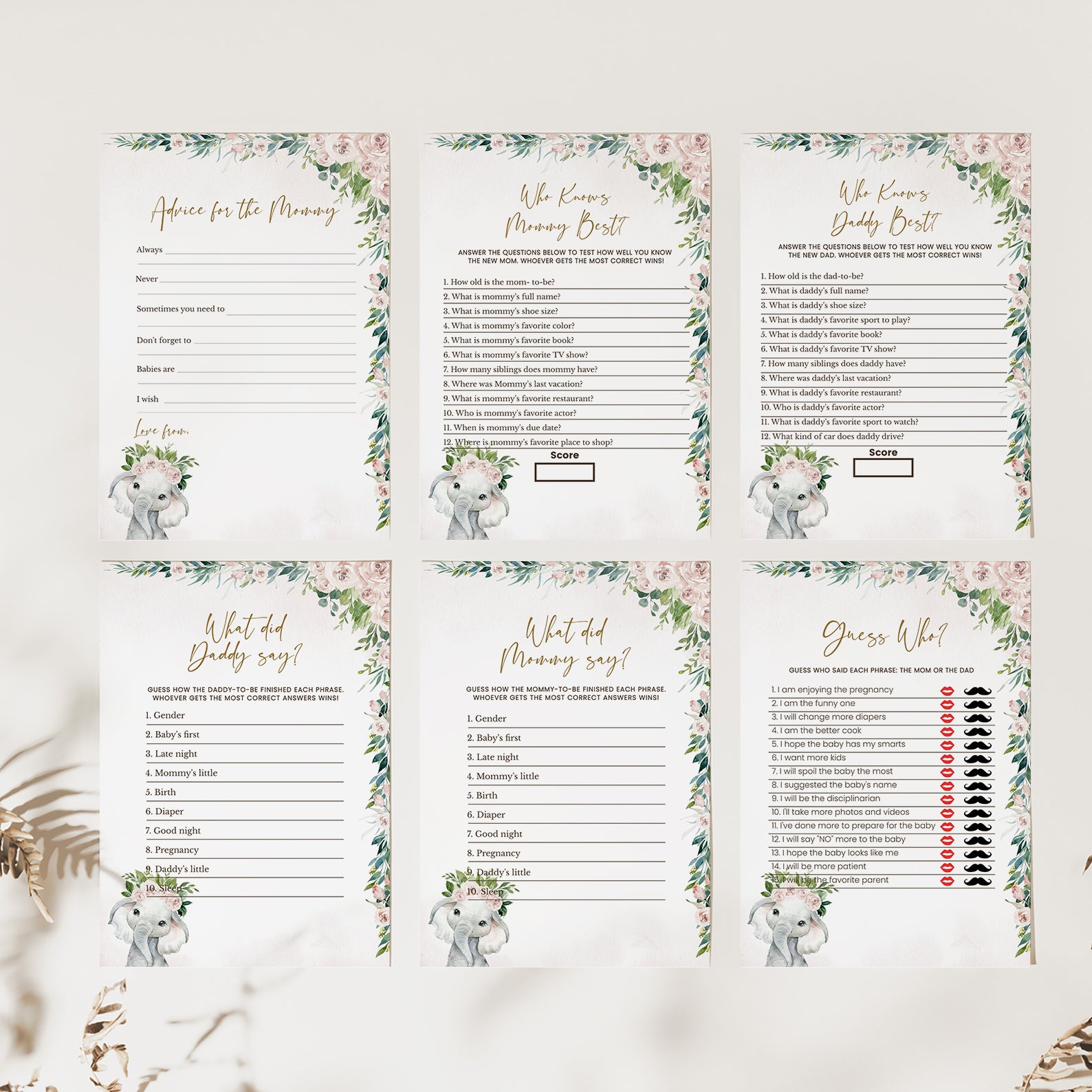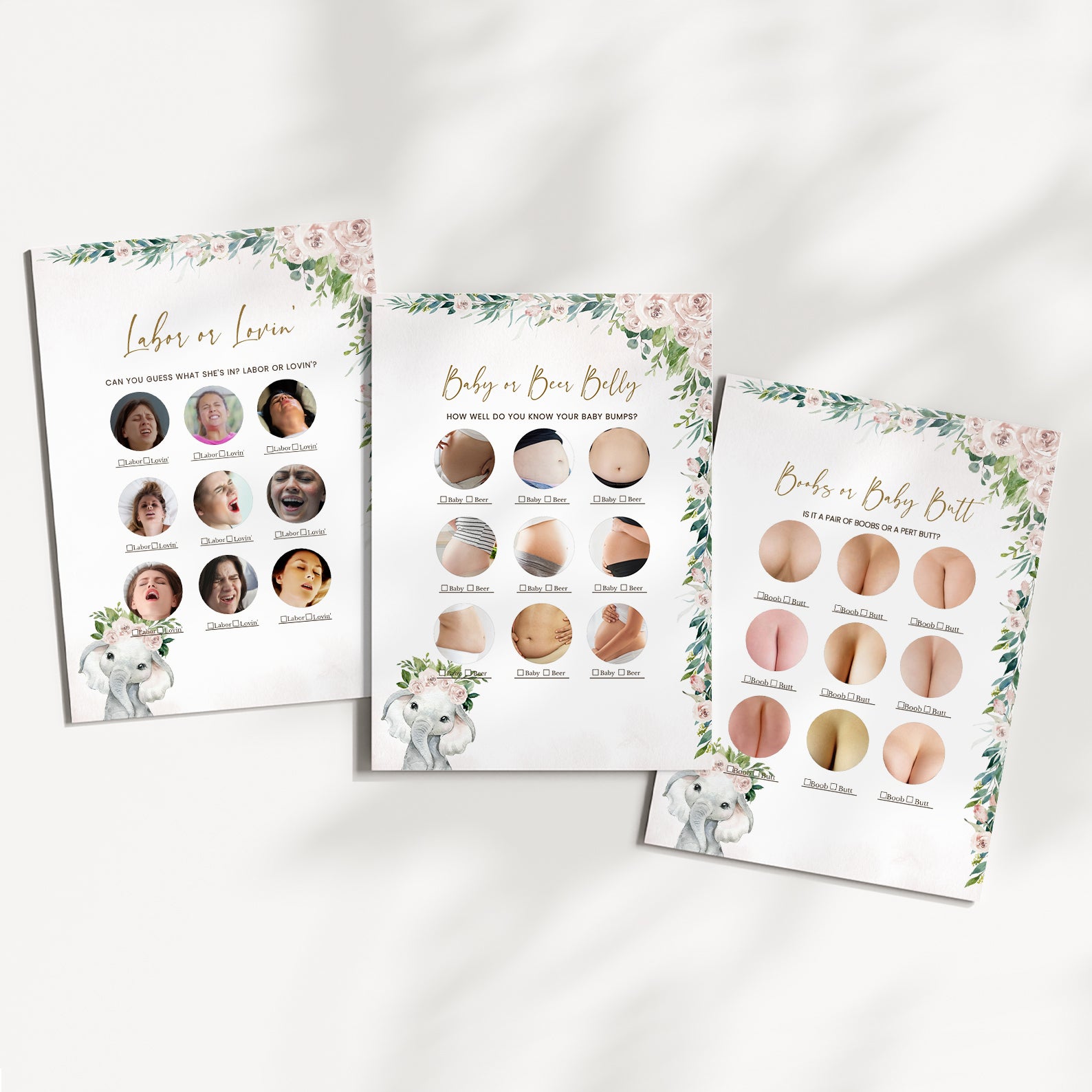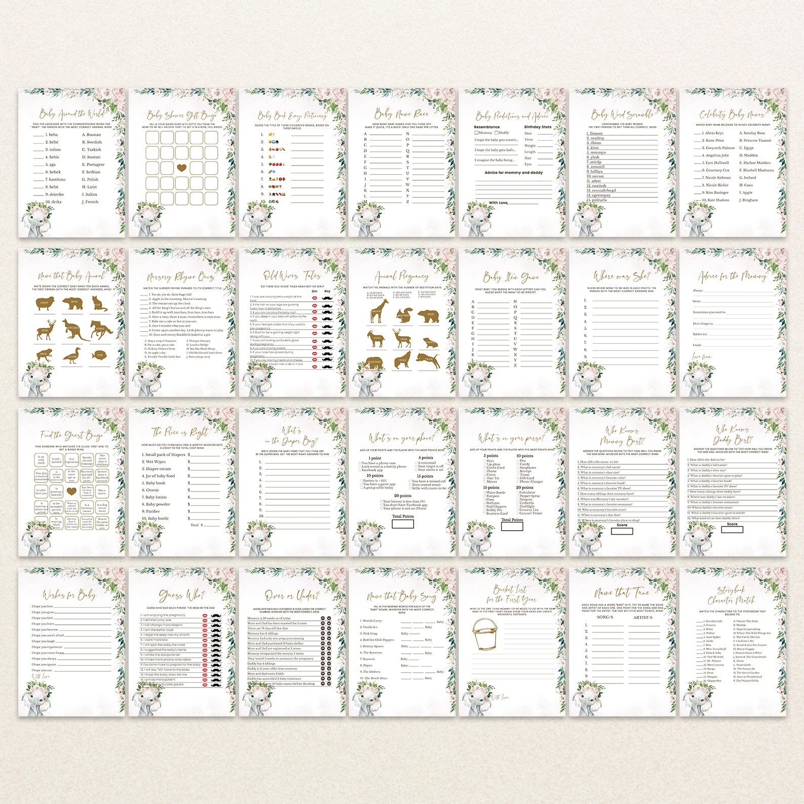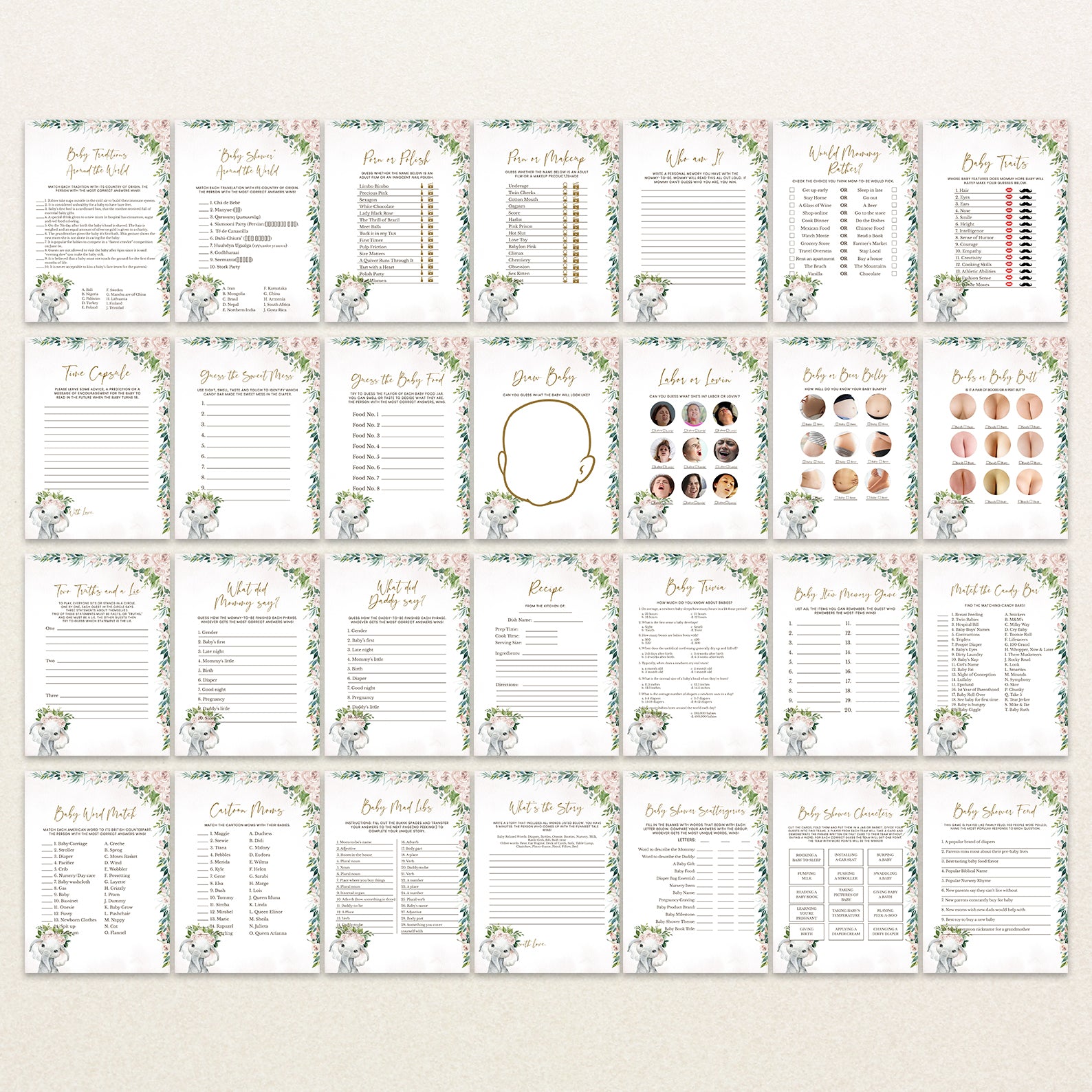 Baby Shower Game Bundle with Pink Roses, Greenery & Elephant