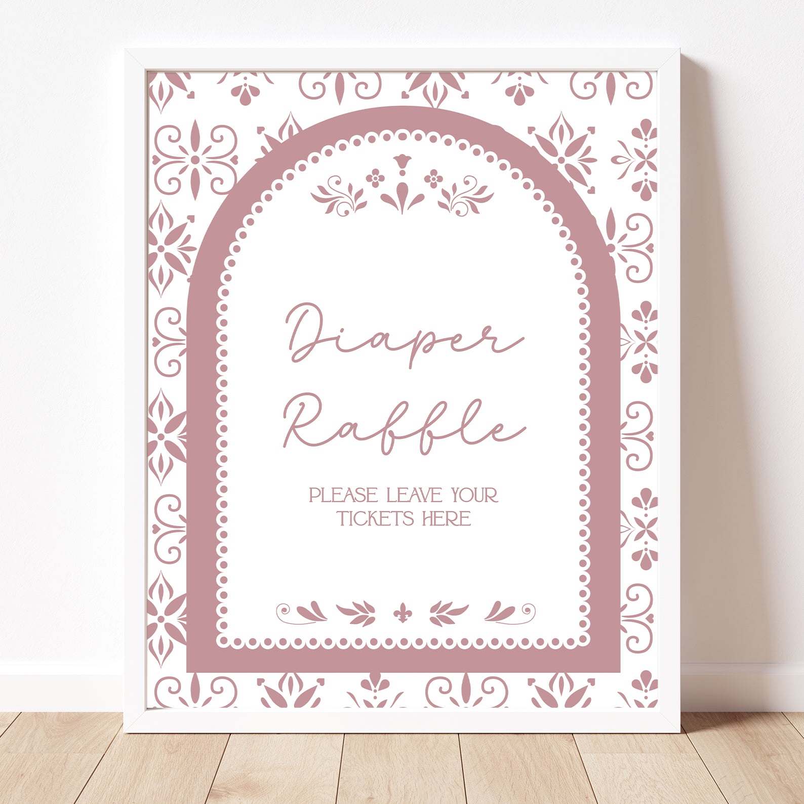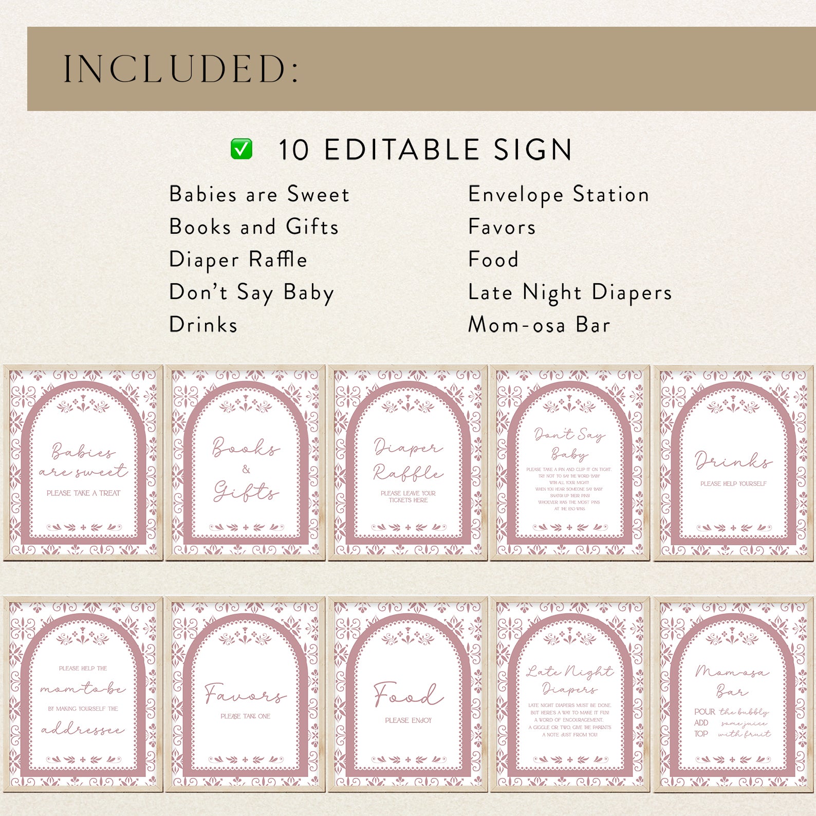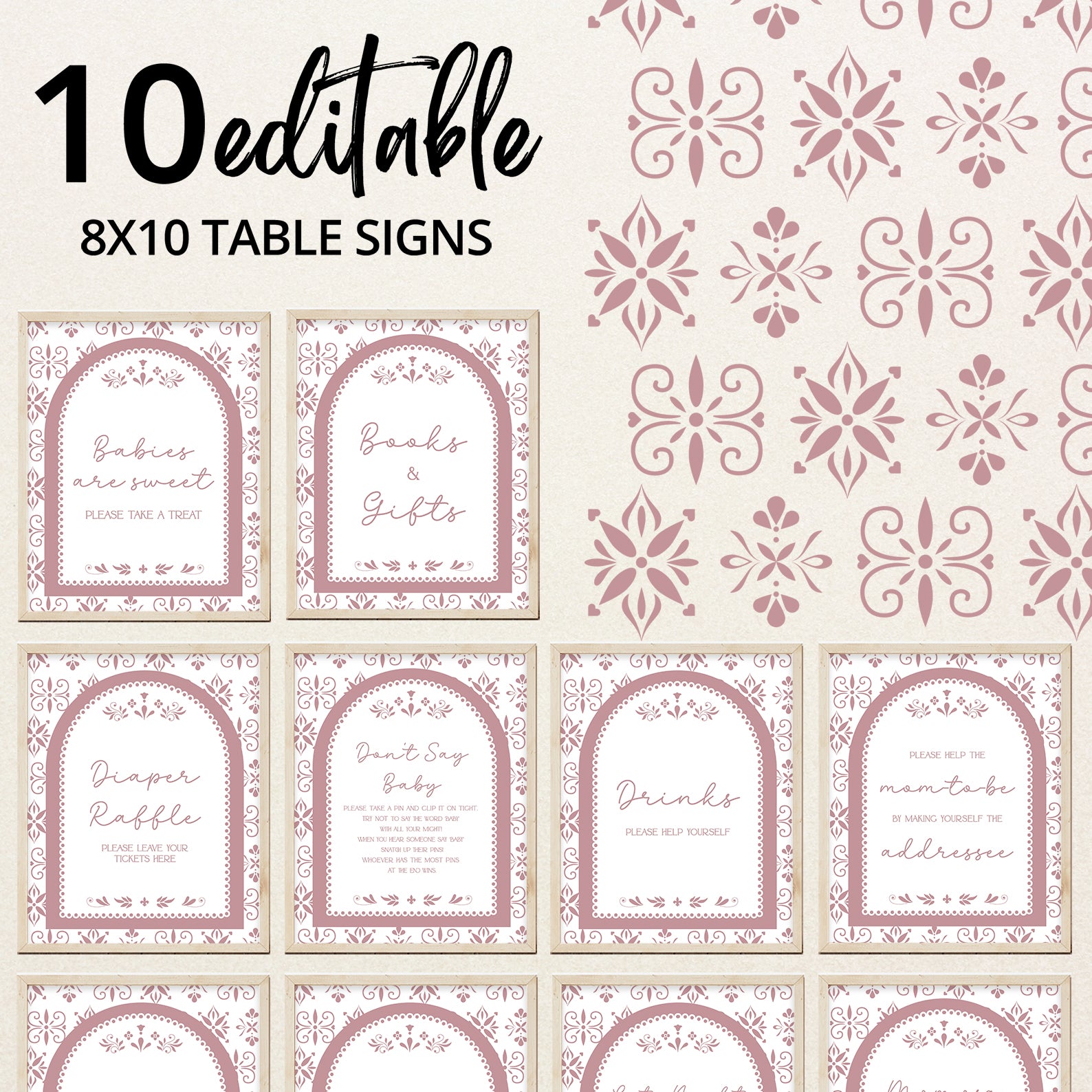 Add vibrant charm to your celebration with this set of 10 editable baby shower table signs in a pink Mexican Talavera theme. Each sign features a folkloric tile-inspired background with soft arches and warm pink hues, highlighting stations like Mom-osa Bar, Diaper Raffle, Books and Gifts, and more. Perfect for creating a festive, cohesive look while guiding guests through your beautifully decorated event.