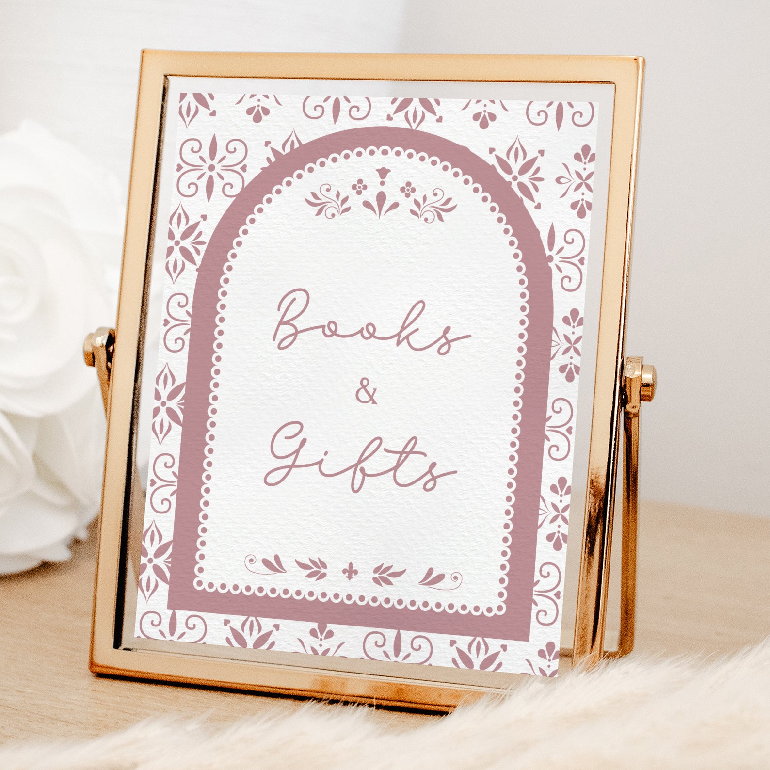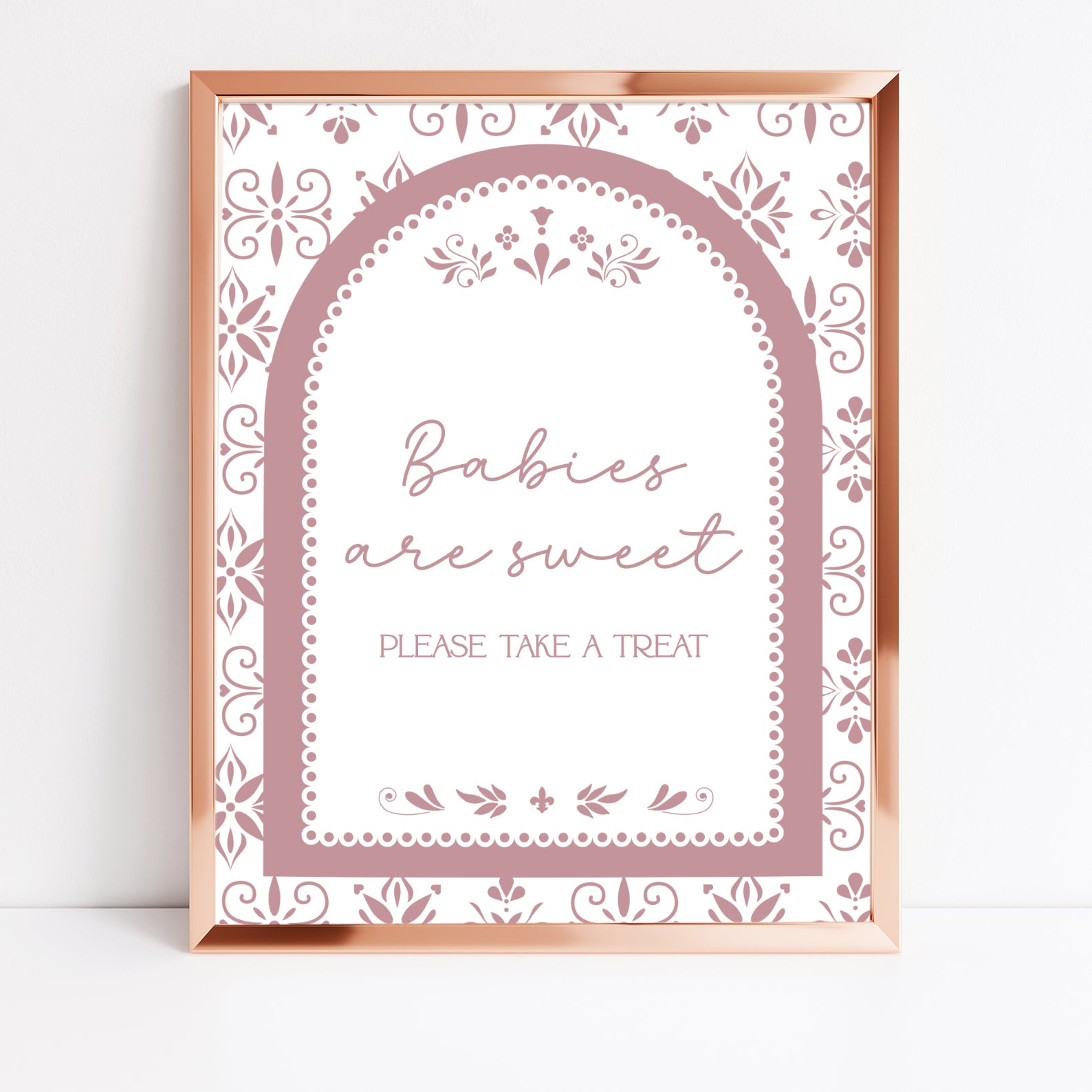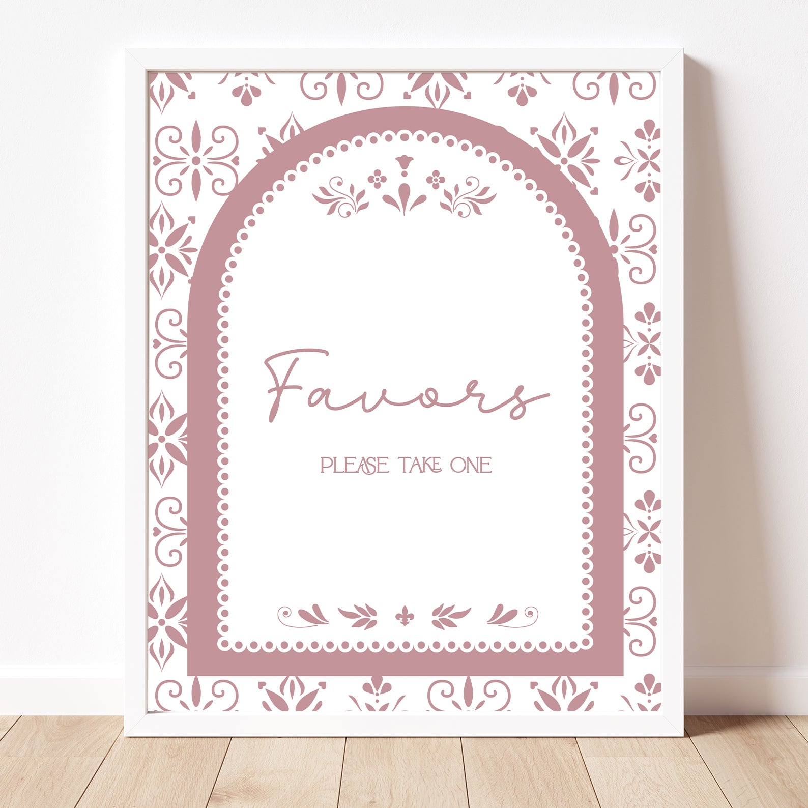 Add vibrant charm to your celebration with this set of 10 editable baby shower table signs in a pink Mexican Talavera theme. Each sign features a folkloric tile-inspired background with soft arches and warm pink hues, highlighting stations like Mom-osa Bar, Diaper Raffle, Books and Gifts, and more. Perfect for creating a festive, cohesive look while guiding guests through your beautifully decorated event.