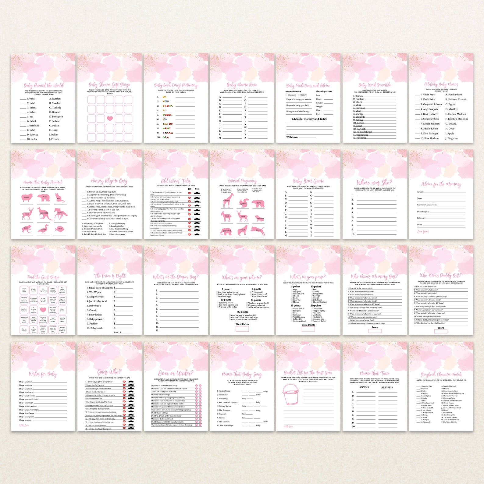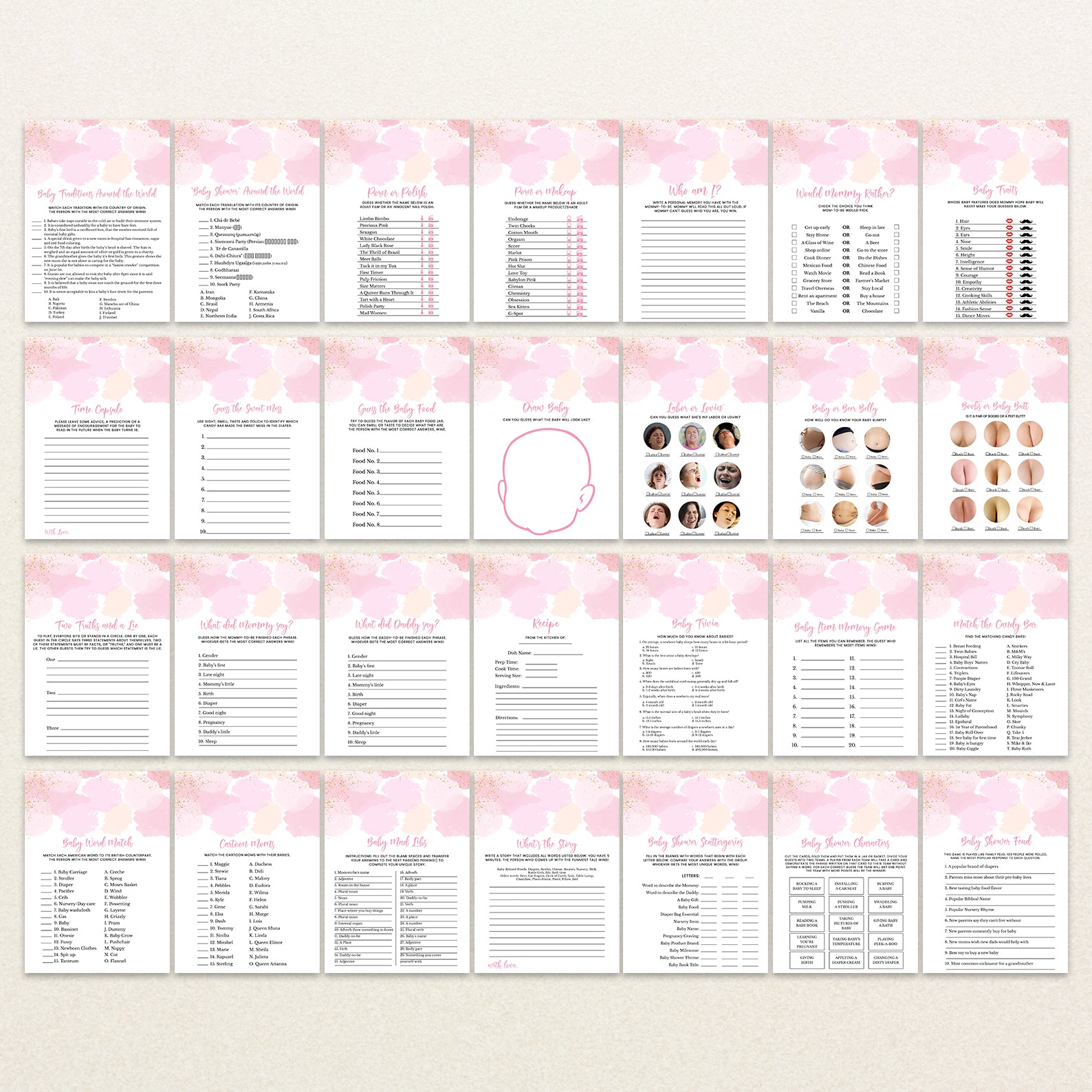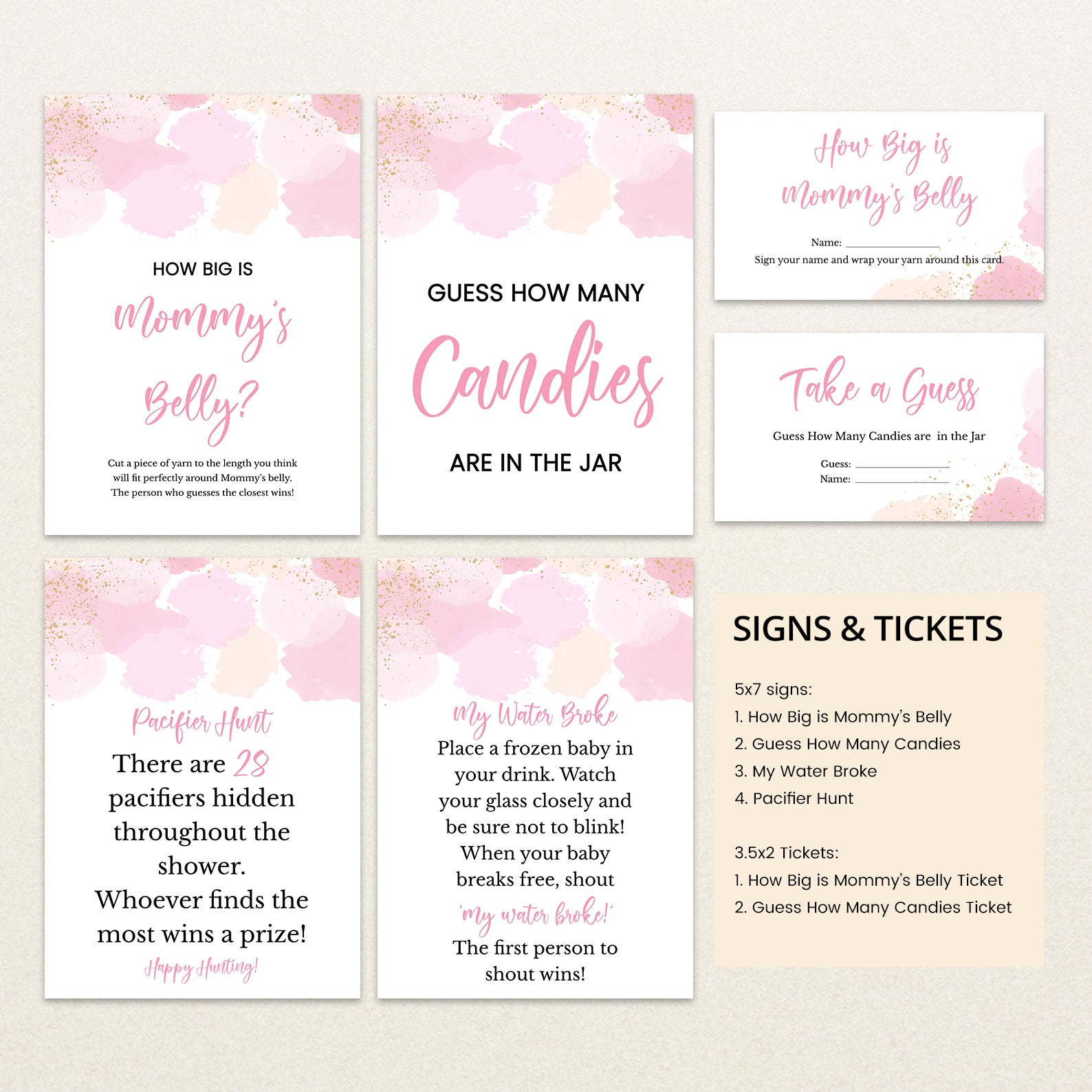 - Purchase this Oh Baby Pink Shower Game Bundle with Gold & Watercolor Accents template