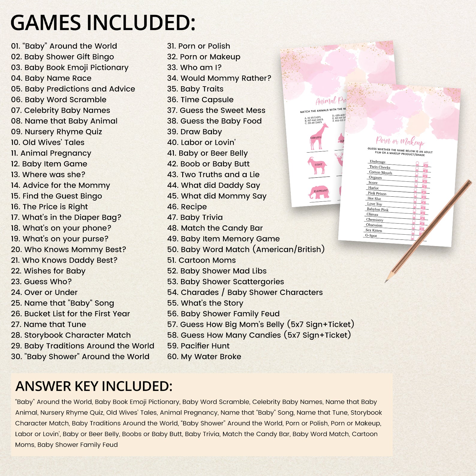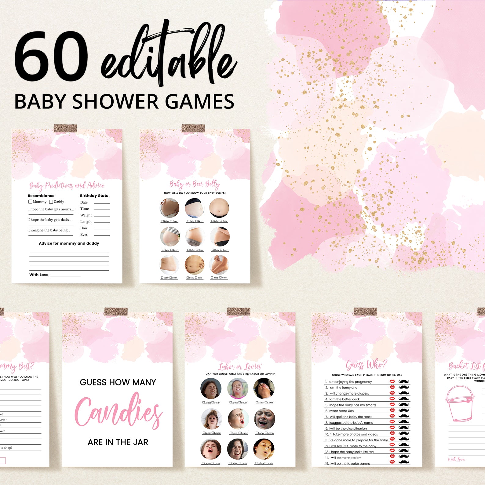 Keep your guests entertained with this beautiful set of 60 editable baby shower games in a soft pink "Oh Baby" theme. Featuring elegant pink watercolor splashes and chic gold accents, each game adds fun and sophistication to your celebration. From classics like Baby Bingo and Who Knows Mommy Best to modern favorites, this bundle has everything you need to create a memorable and interactive shower experience.