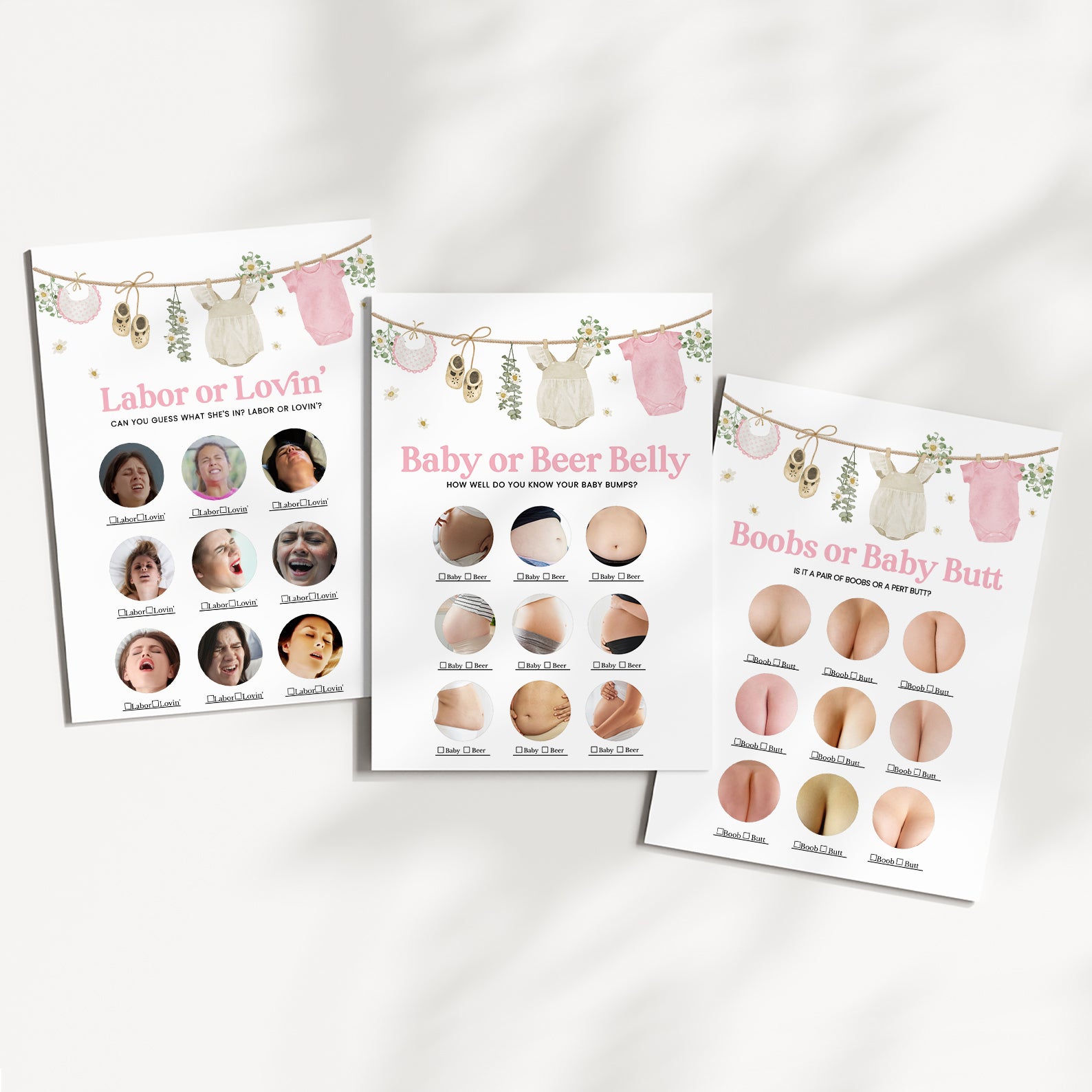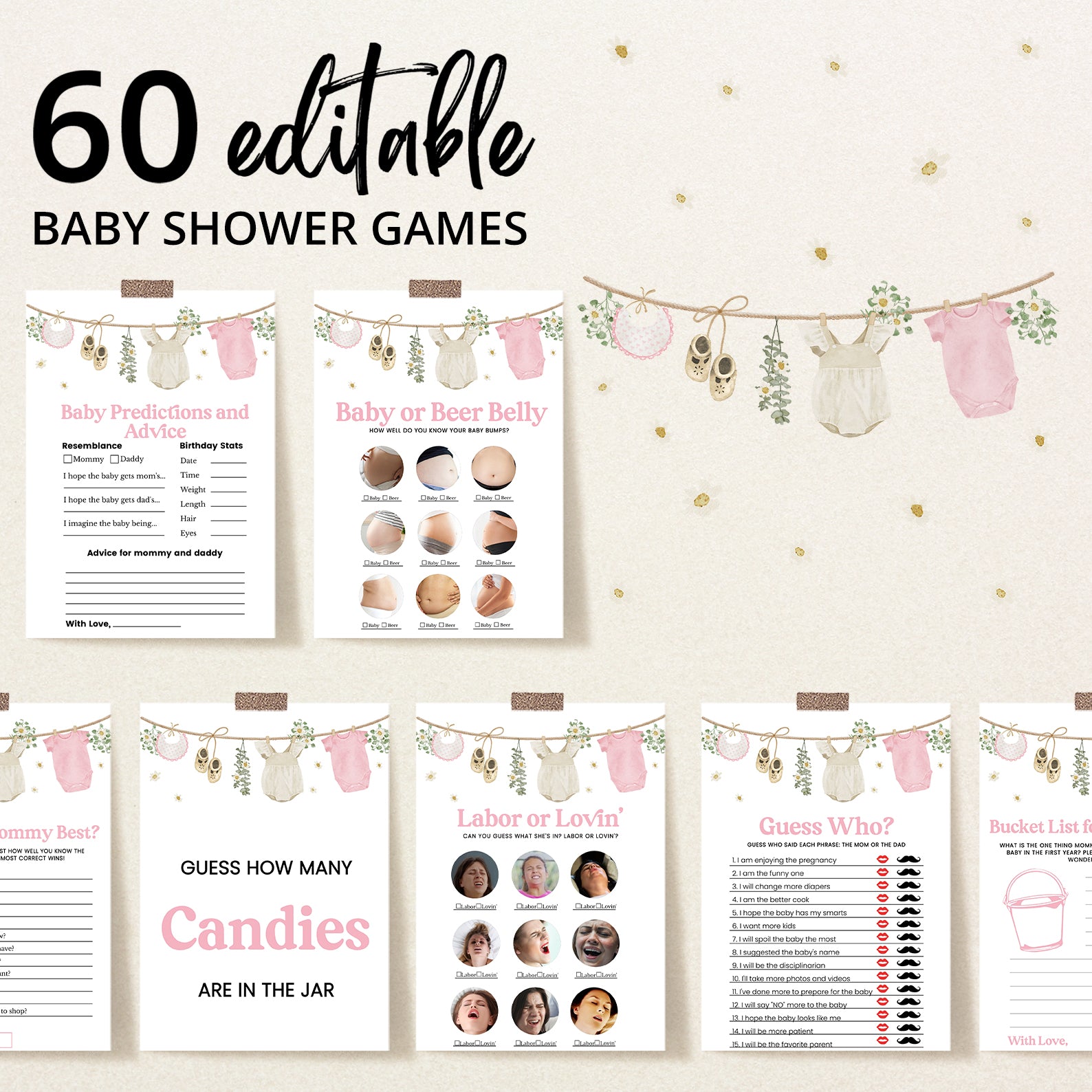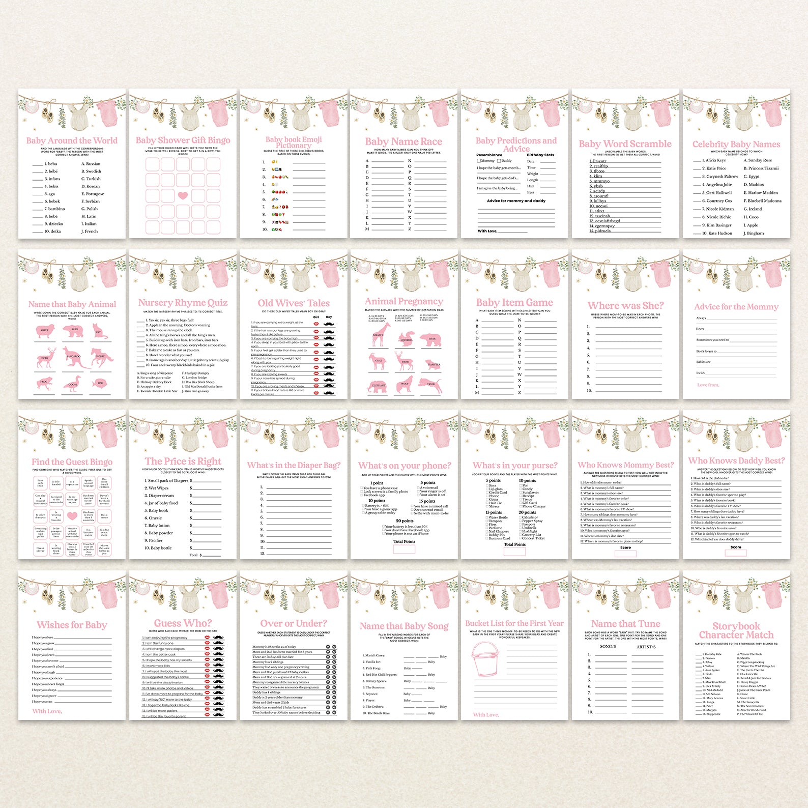 Celebrate the upcoming arrival of your sweet baby girl with our adorable Baby Shower Game Bundle, designed to pair perfectly with our charming pink-themed invitation! This delightful set includes 60 editable baby shower games, featuring playful and elegant designs inspired by soft baby bibs, cream shoes, cozy rompers, cheerful daisies, and lush greenery. Whether you're planning a laid-back gathering or a stylish celebration, this bundle adds a fun and interactive element to your event. Effortlessly customizable and easy to print or share digitally, it's the perfect way to entertain guests while making beautiful memories together!