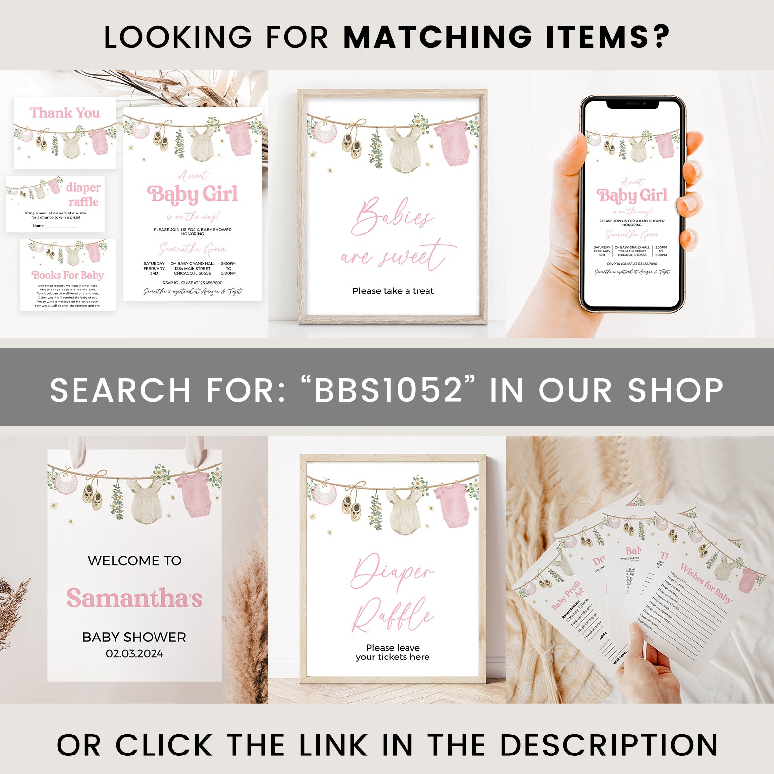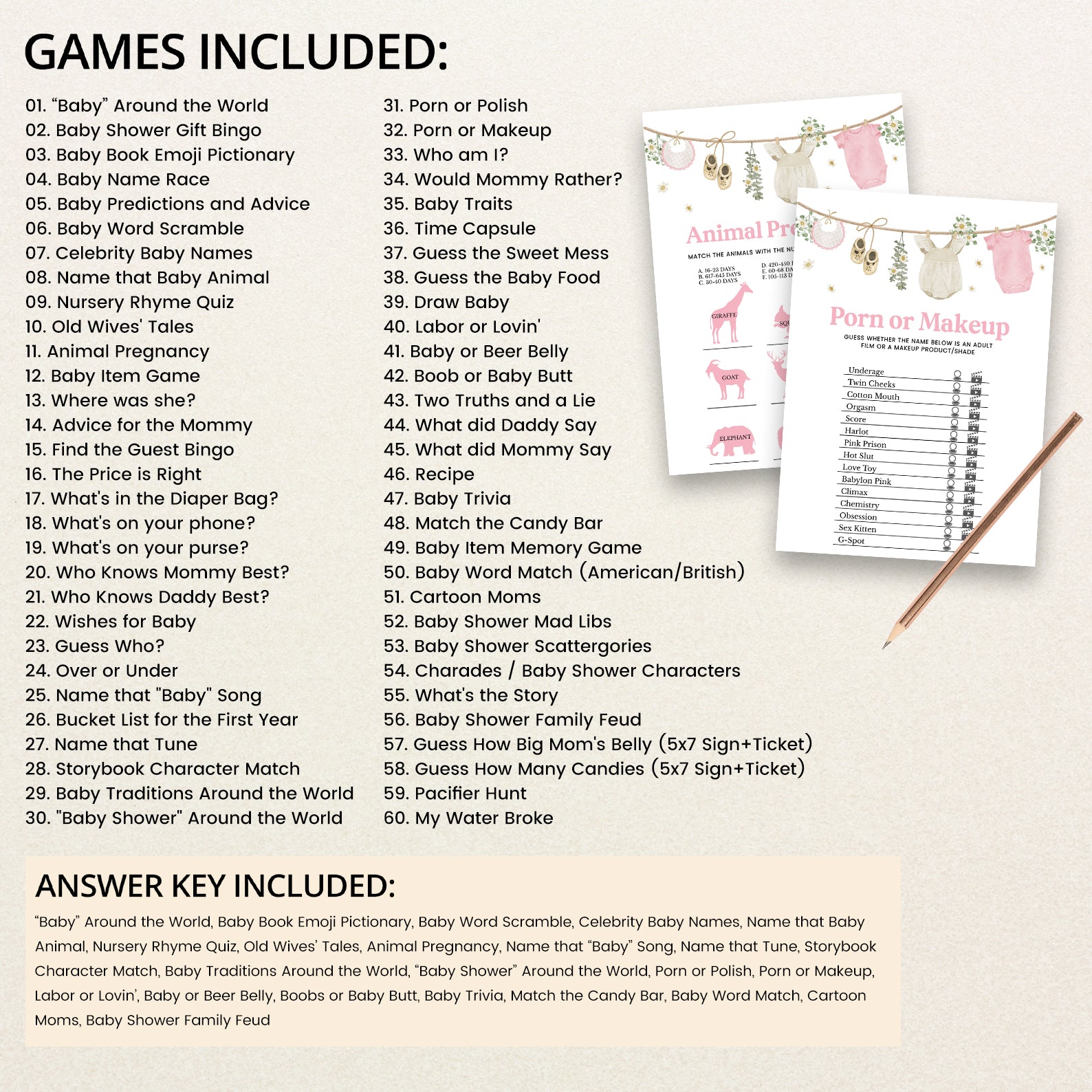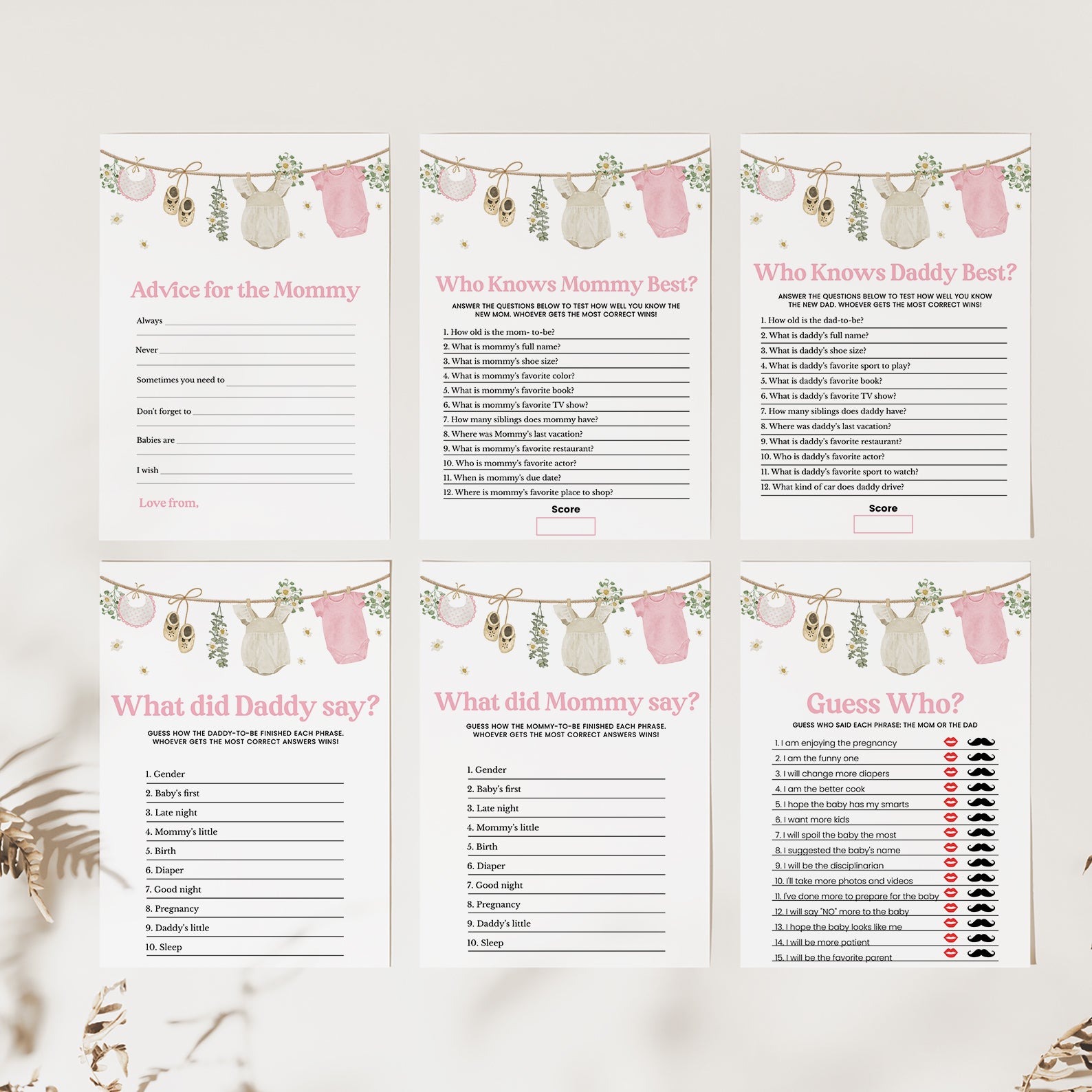Celebrate the upcoming arrival of your sweet baby girl with our adorable Baby Shower Game Bundle, designed to pair perfectly with our charming pink-themed invitation! This delightful set includes 60 editable baby shower games, featuring playful and elegant designs inspired by soft baby bibs, cream shoes, cozy rompers, cheerful daisies, and lush greenery. Whether you're planning a laid-back gathering or a stylish celebration, this bundle adds a fun and interactive element to your event. Effortlessly customizable and easy to print or share digitally, it's the perfect way to entertain guests while making beautiful memories together!