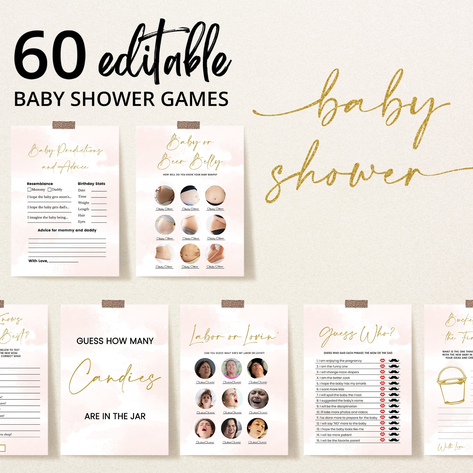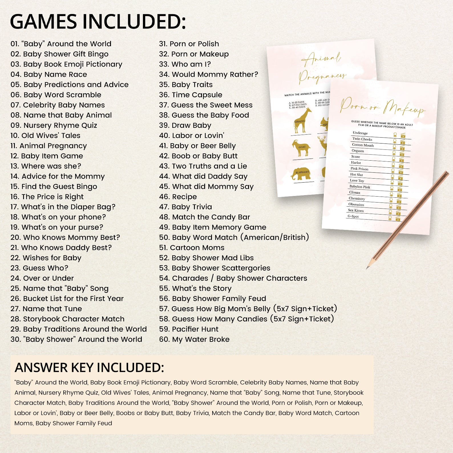 Keep your guests entertained with our pink and gold baby shower game bundle. This set includes 60 editable games, all beautifully designed with soft pink watercolor details and sophisticated gold text. From fun icebreakers to interactive activities, these games perfectly complement your event’s theme while ensuring laughter and memorable moments. Easy to customize and print, they’re the ultimate way to add fun and flair to your celebration.